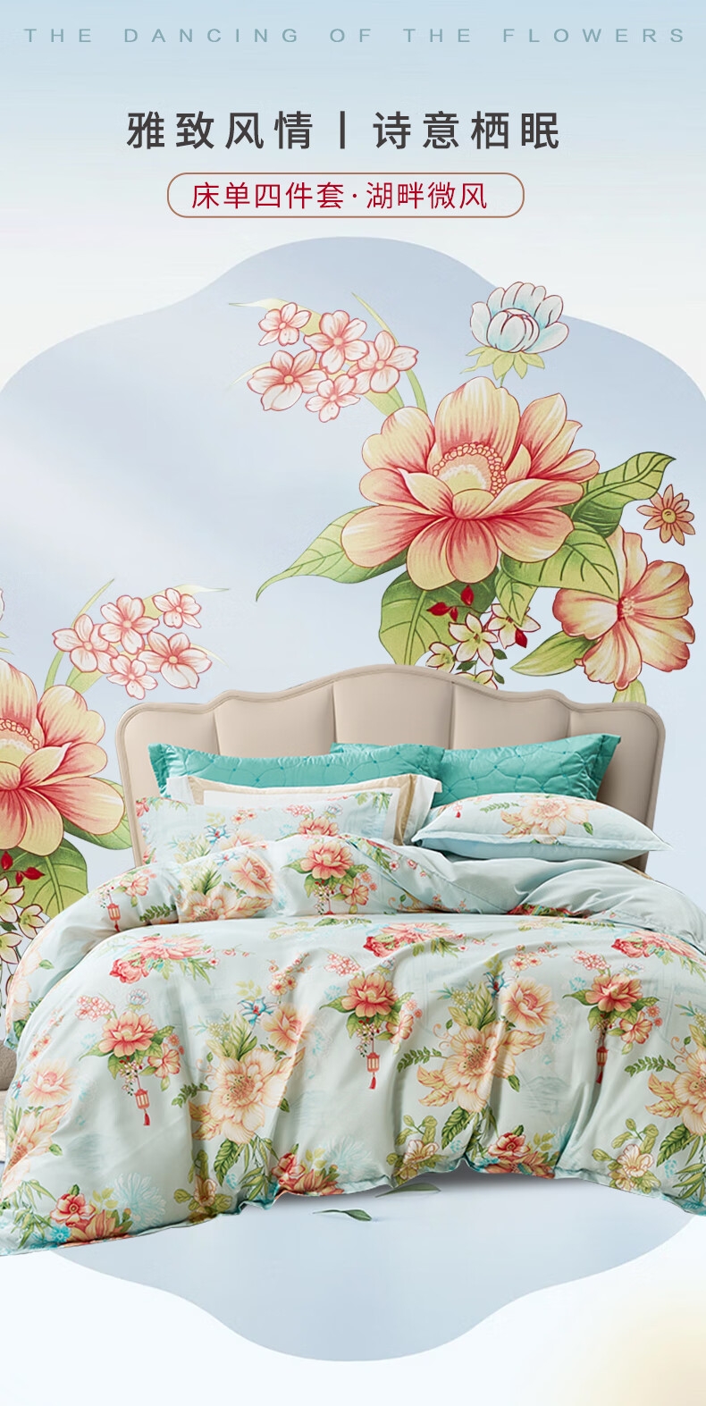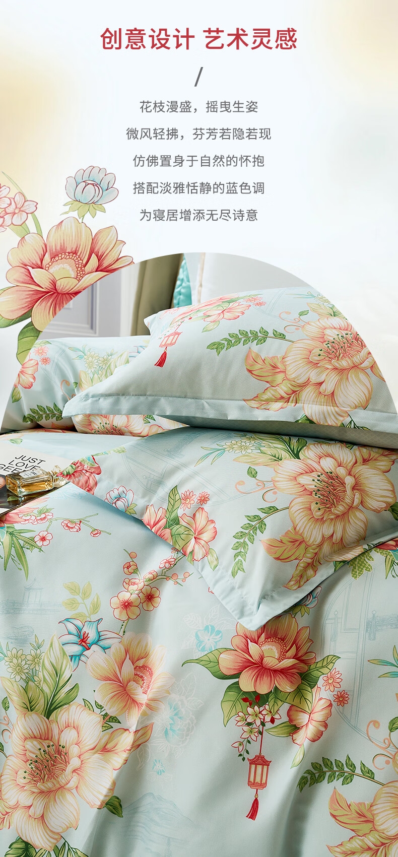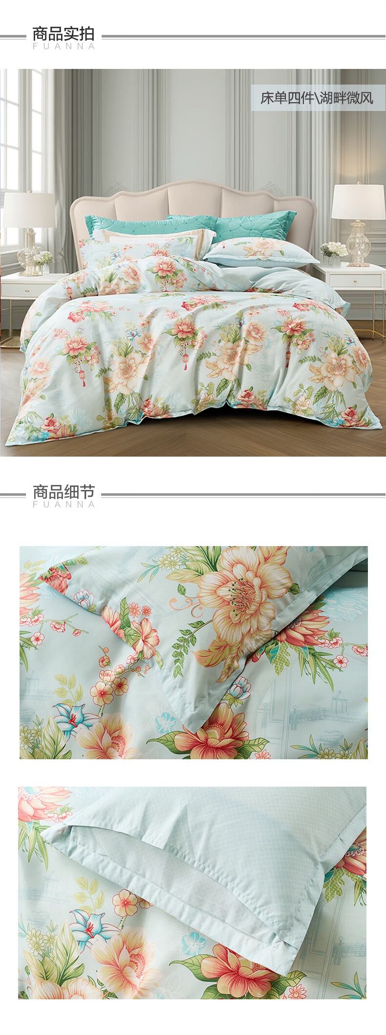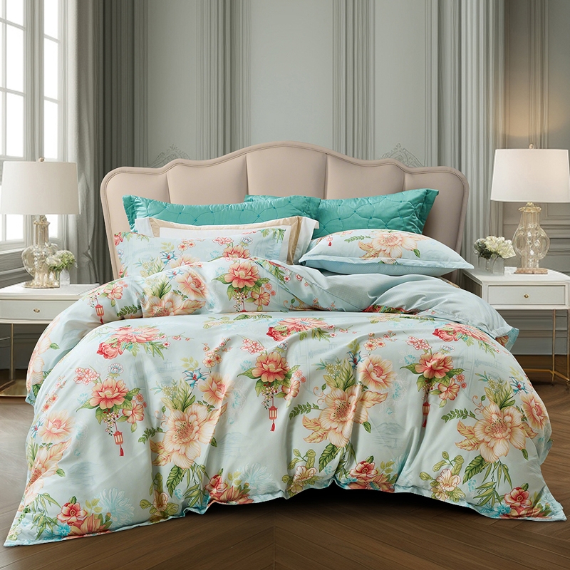 面料经过两次打磨处理,在表面会形成一种细密短绒毛;原创印花,鲜活印染,花型更立体,久用不褪色,好品质;历经多道印染工艺,面料颜色丰富,花型层次感佳