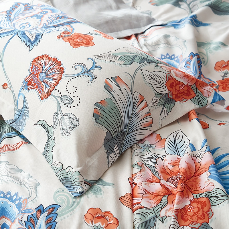 选用新疆阳光棉朵,每一朵都晒满阳光,高支高密;在绿叶的衬托下花朵更加妩媚,条纹与佩兹利花纹相映衬;历经多道印染工艺,面料颜色丰富,花型层次感佳