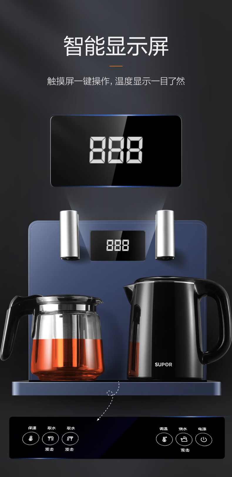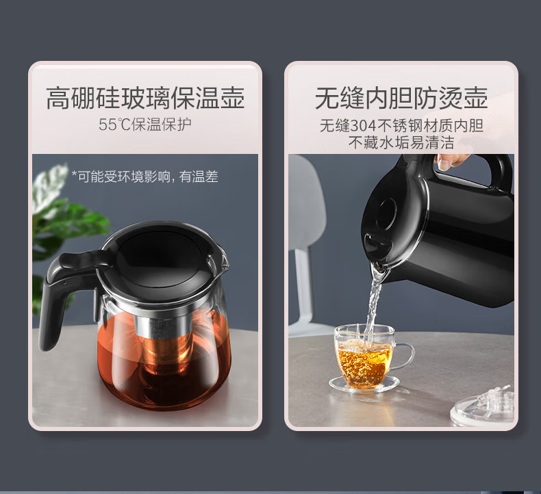 无缝内胆,健康饮水;智能显示屏;双壶双出水口