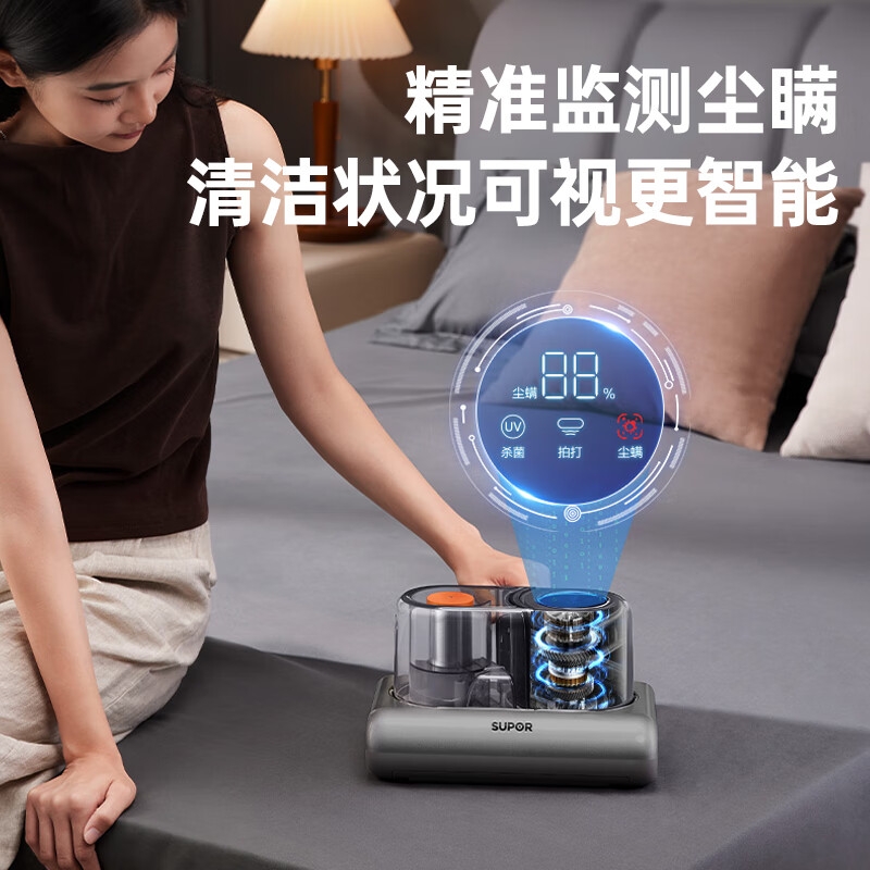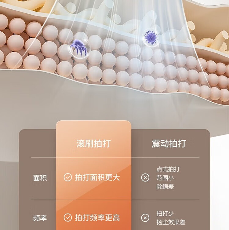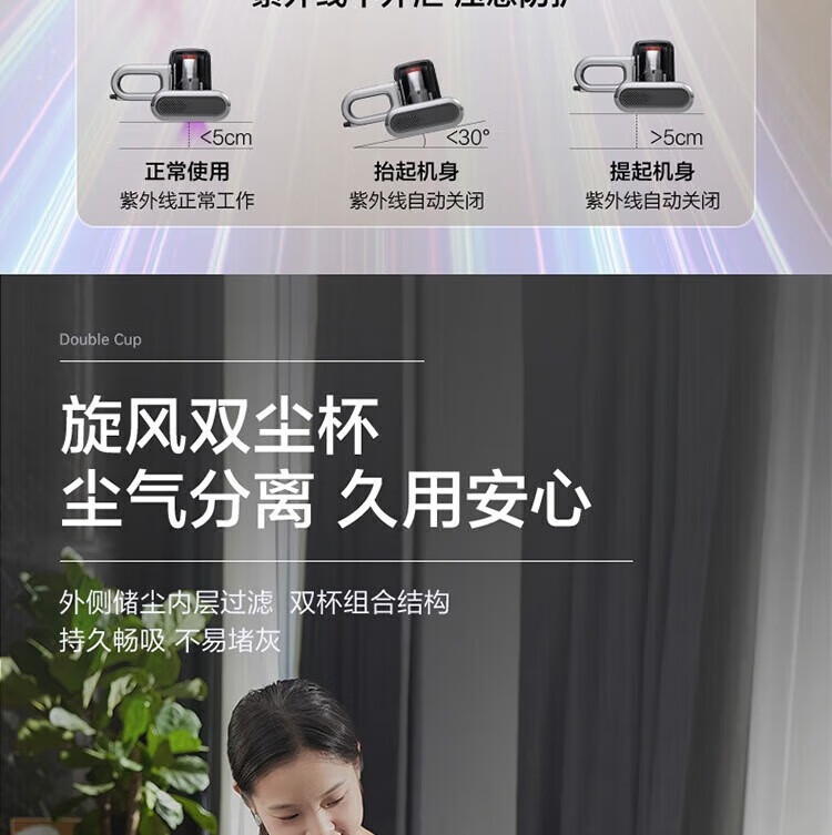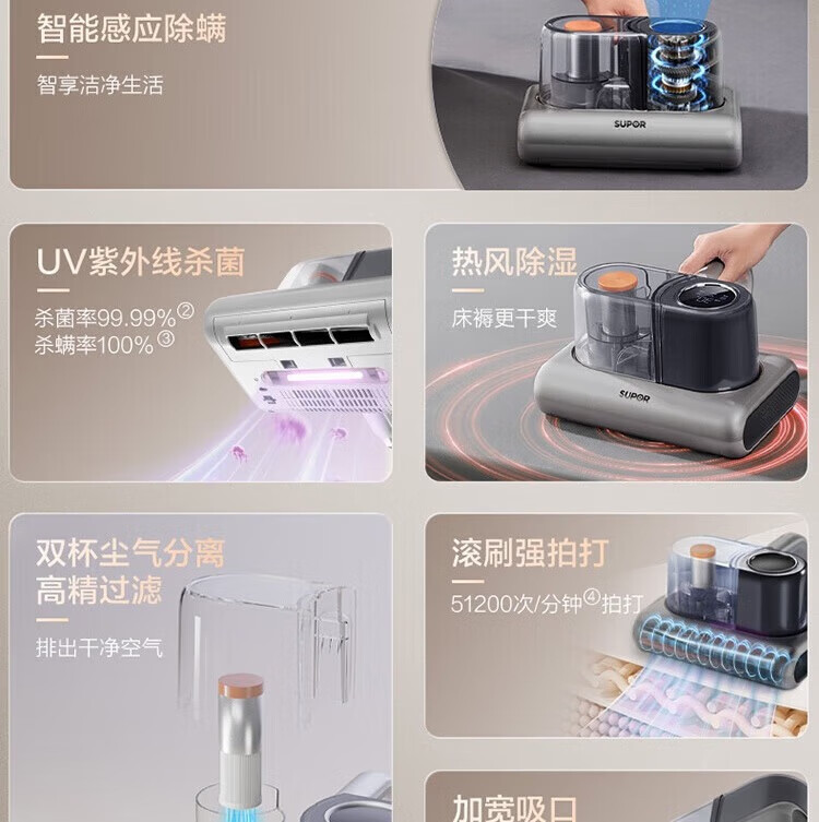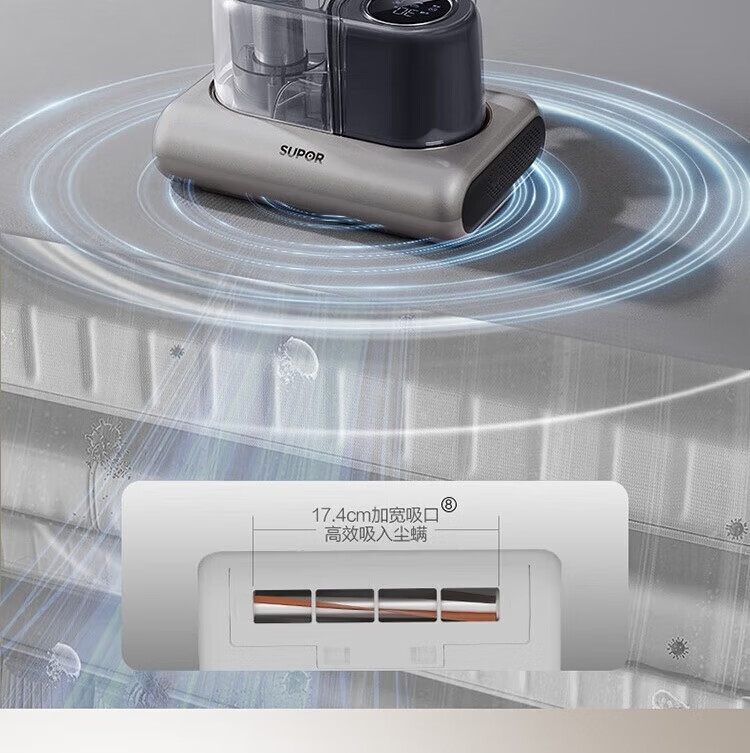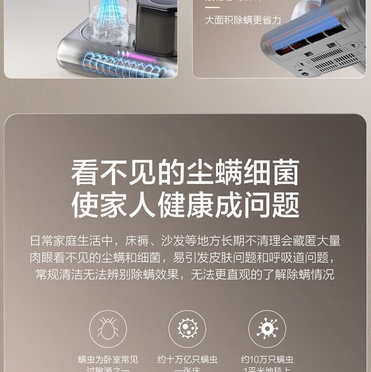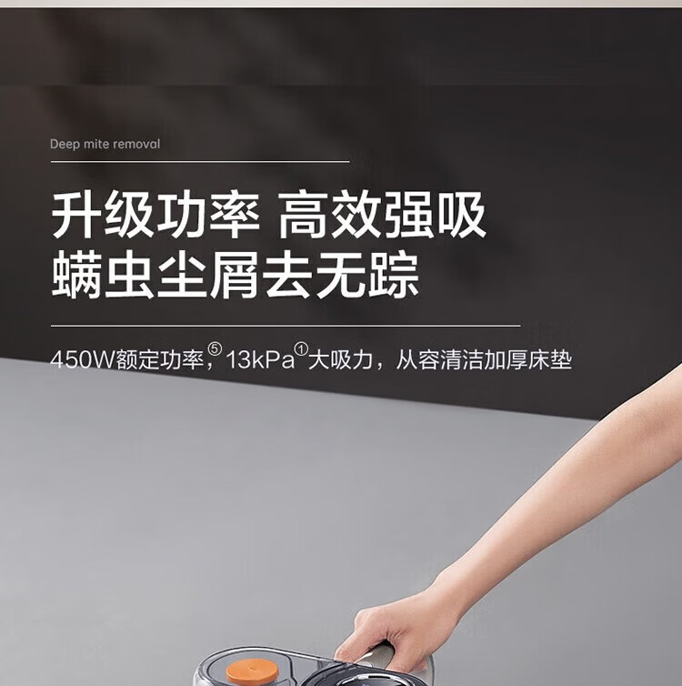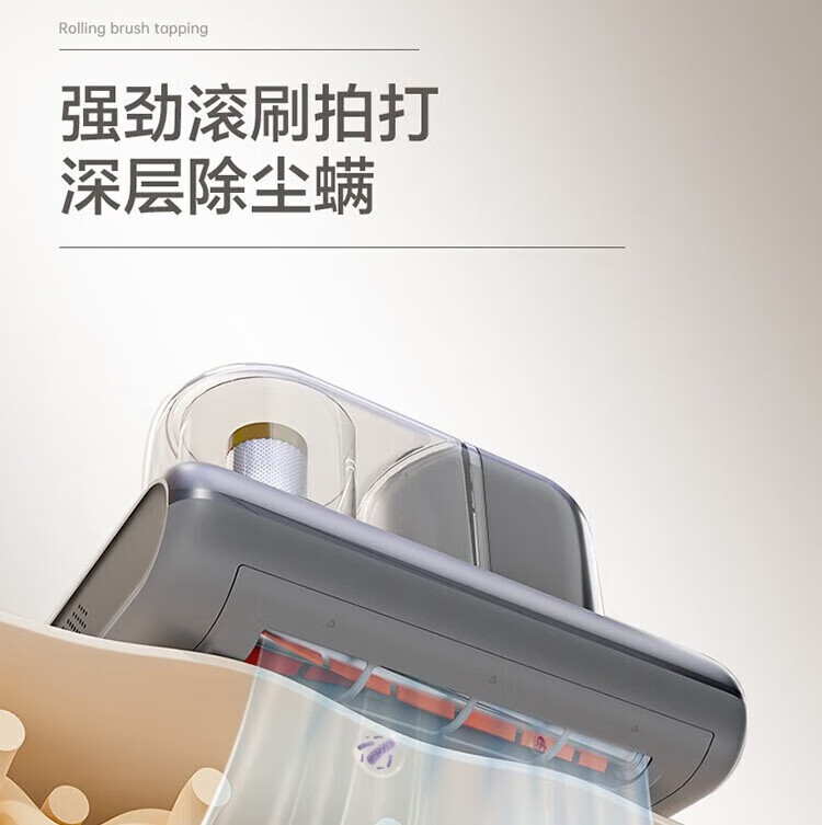 滚刷拍打,深层除螨,螨虫无处藏匿;旋风.双杯尘气分离,一边除螨,一边过滤;450W大功率,13kpa真空度