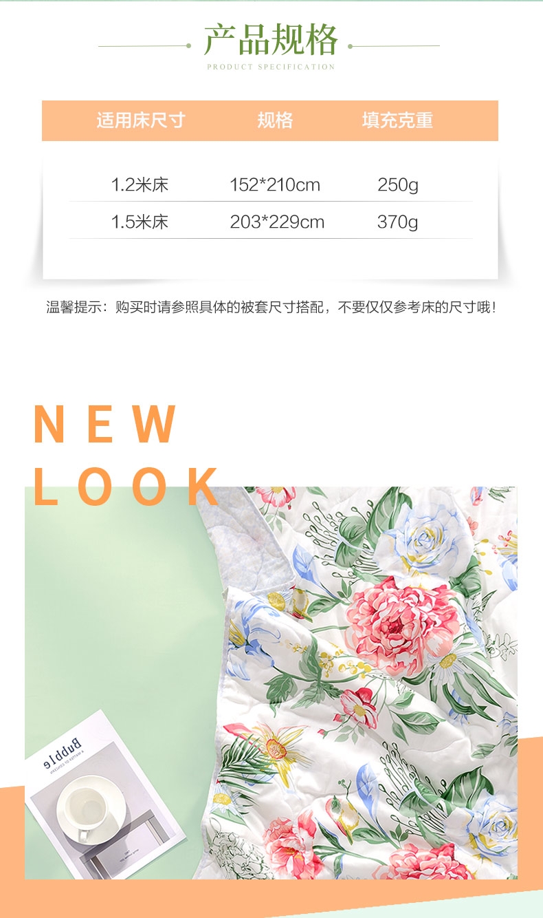 优选全涤磨毛面料面料表面有一层细密的绒毛,触感柔暖;优质中空螺旋纤维填充, 不仅松软舒适,而且保型性好;均匀平整,圆角设计,精致的绗缝工艺,使产品更有品质