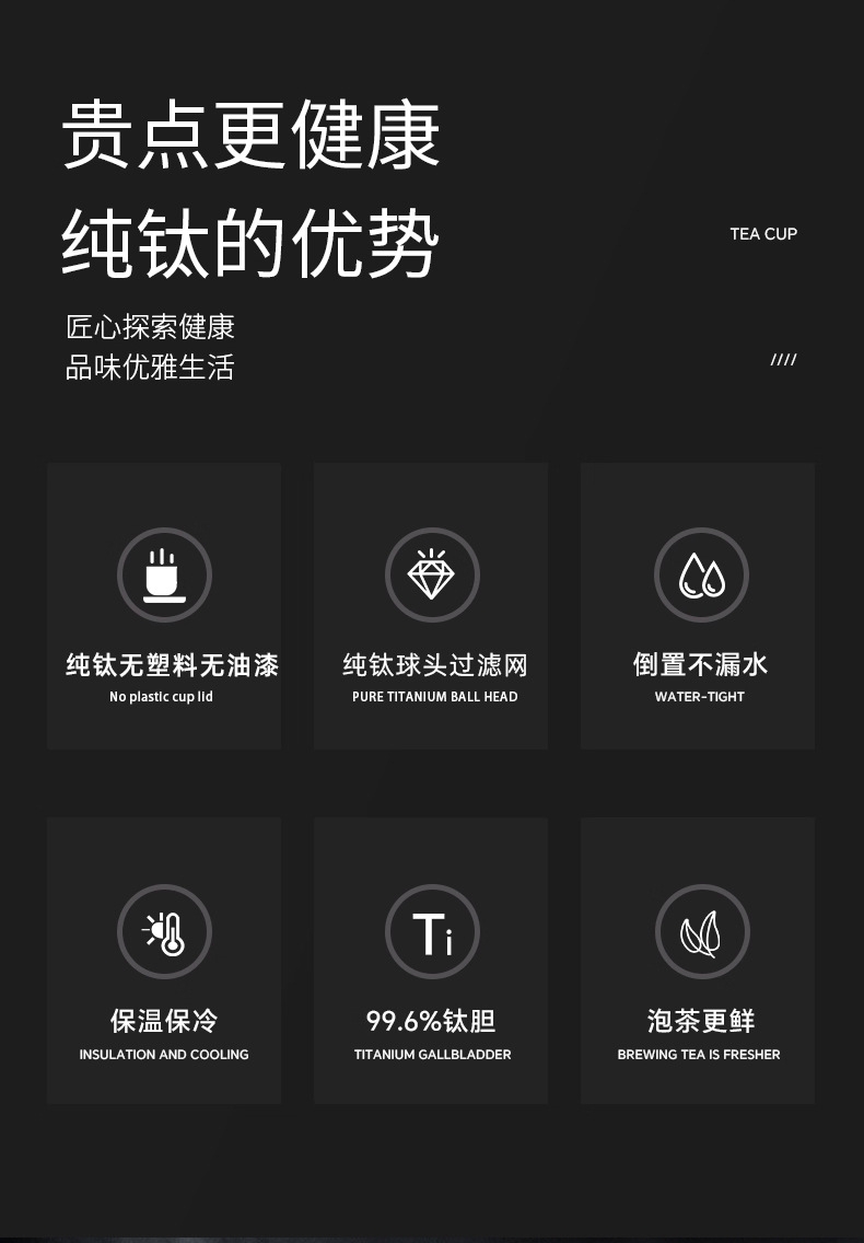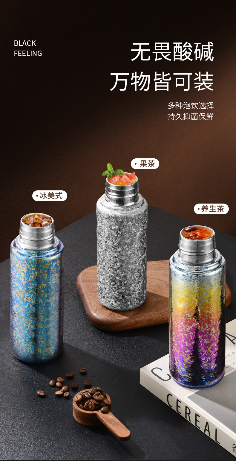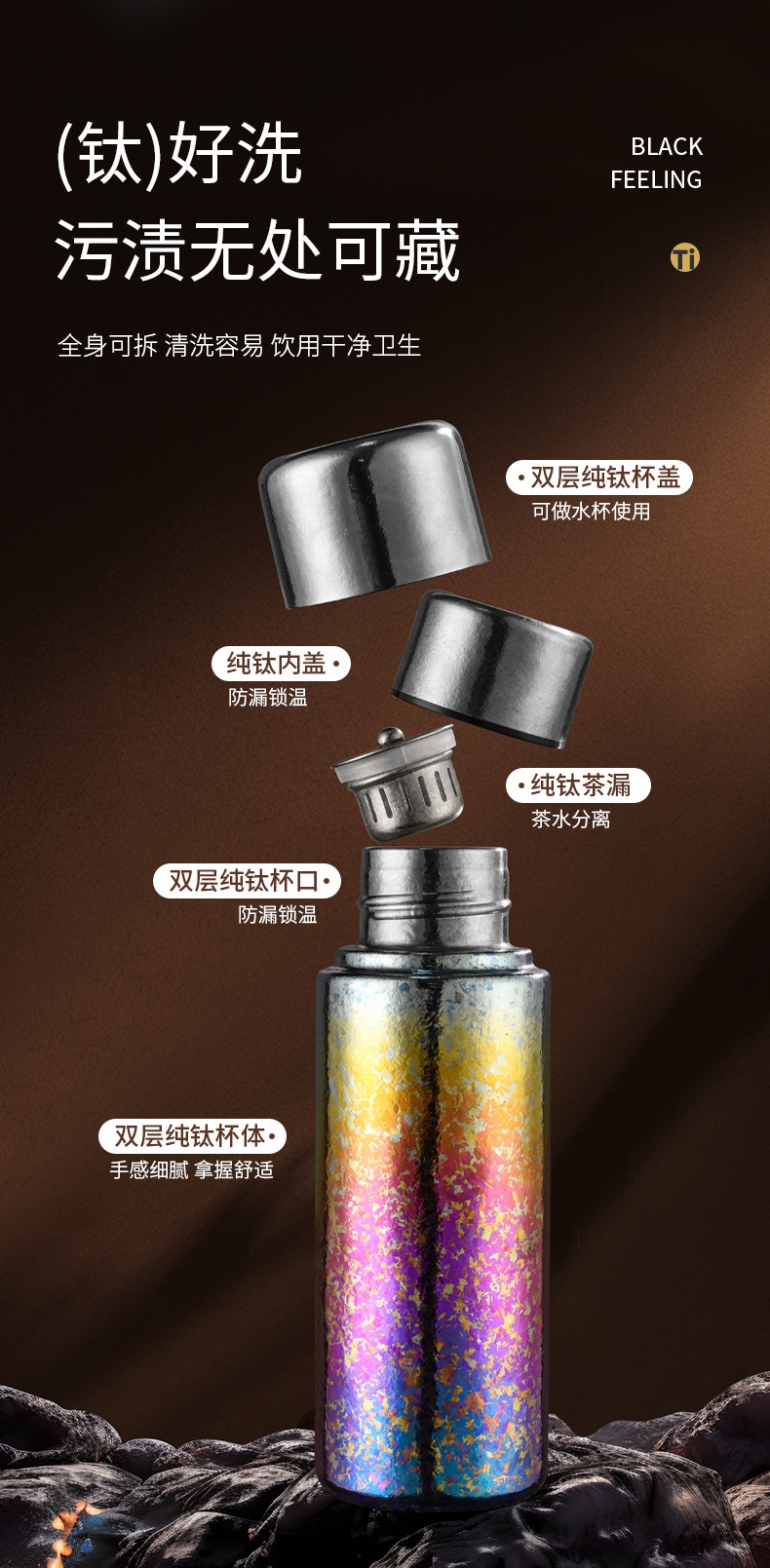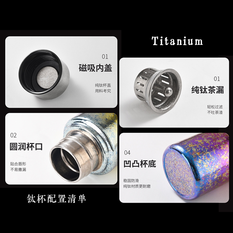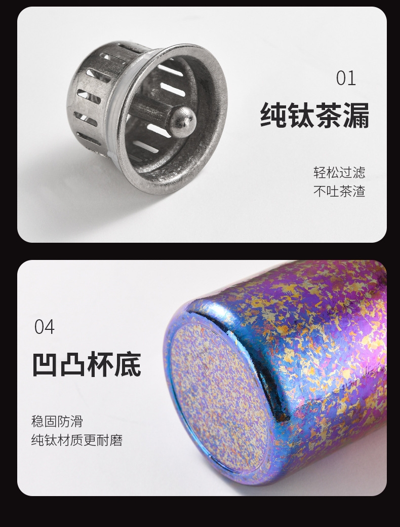 (天然)孕育钛,自然更出彩 不同温度烧制形成色彩;纯钛无塑料无油漆,纯钛球头过滤网,倒置不漏水;高端内外纯钛抑菌持味 内外均为纯钛材质打造耐腐蚀;多层保温唤醒你一整天,久置茶汤温暖如初口感依旧;无畏酸碱万物皆可装,防漏到位外带不湿包