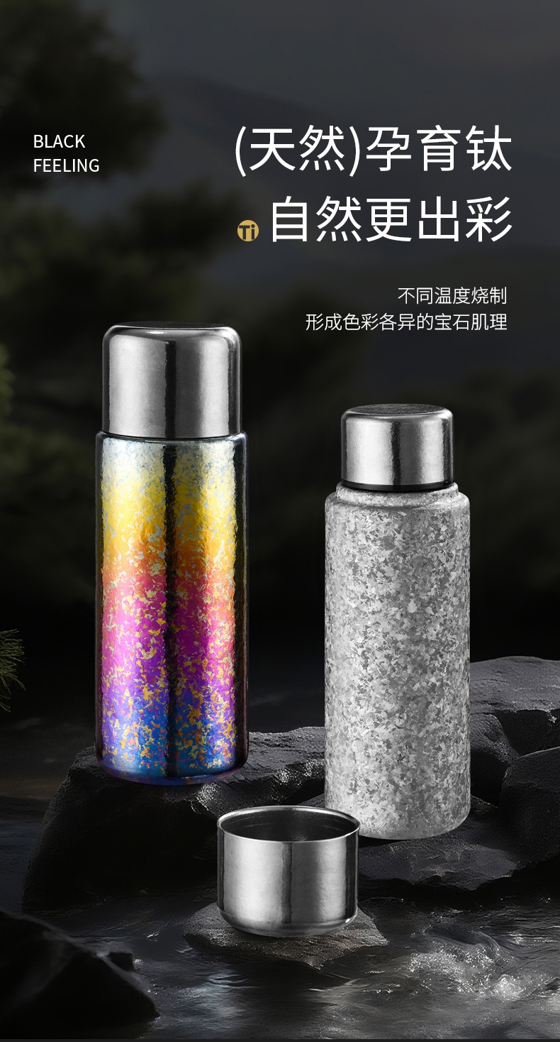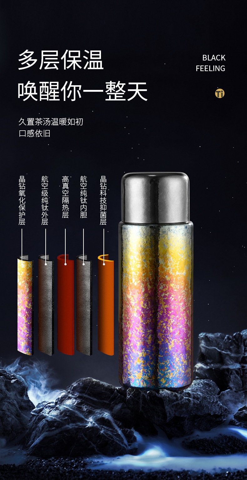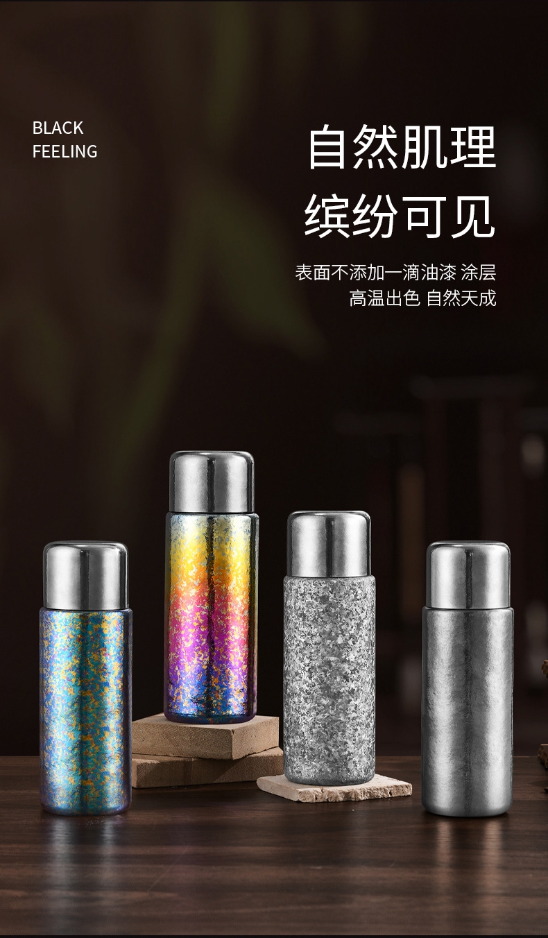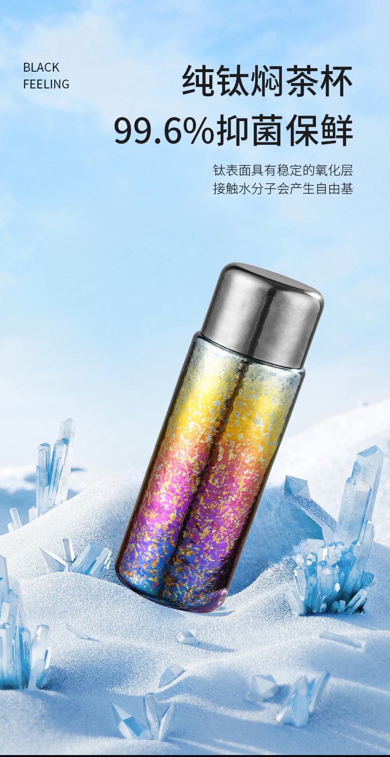 (天然)孕育钛,自然更出彩 不同温度烧制形成色彩;纯钛无塑料无油漆,纯钛球头过滤网,倒置不漏水;高端内外纯钛抑菌持味 内外均为纯钛材质打造耐腐蚀;多层保温唤醒你一整天,久置茶汤温暖如初口感依旧;无畏酸碱万物皆可装,防漏到位外带不湿包