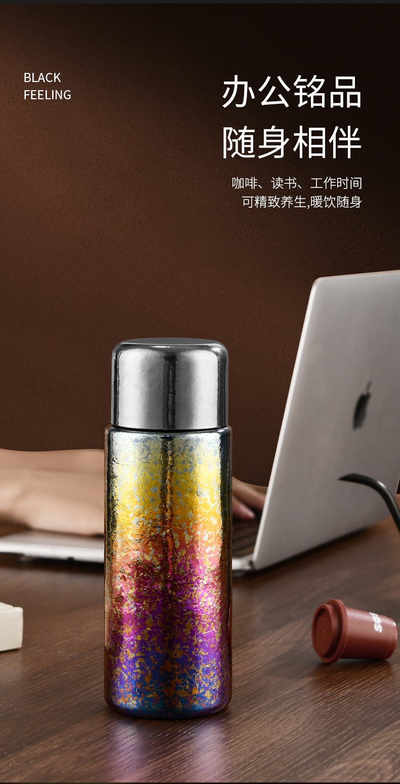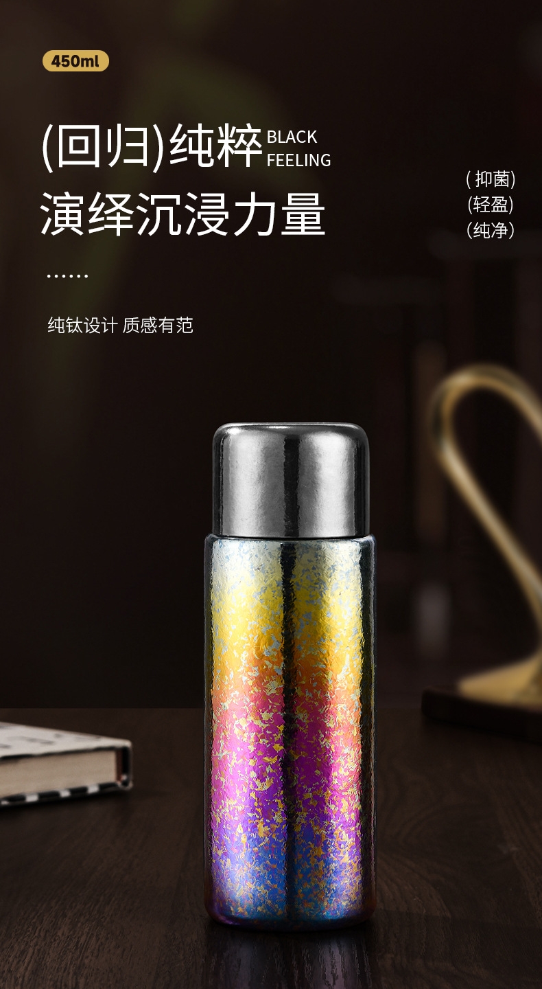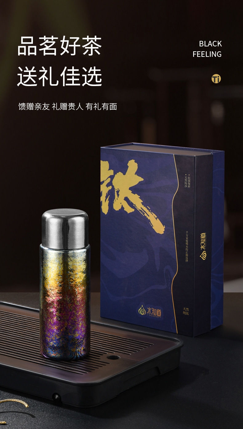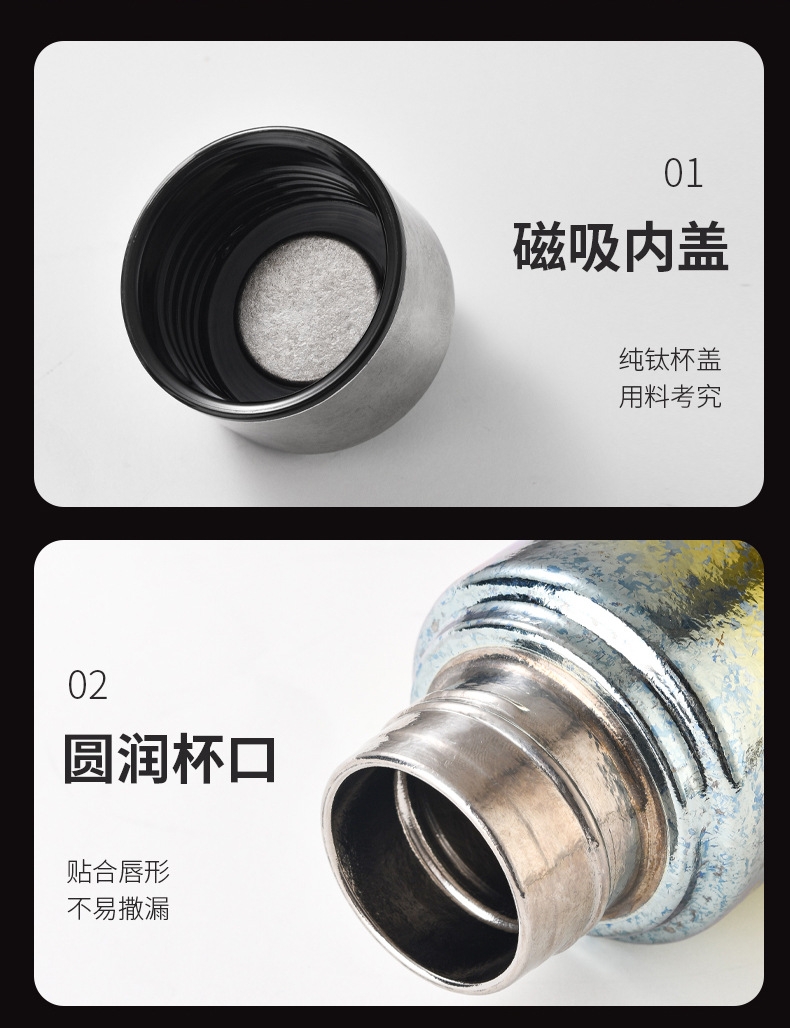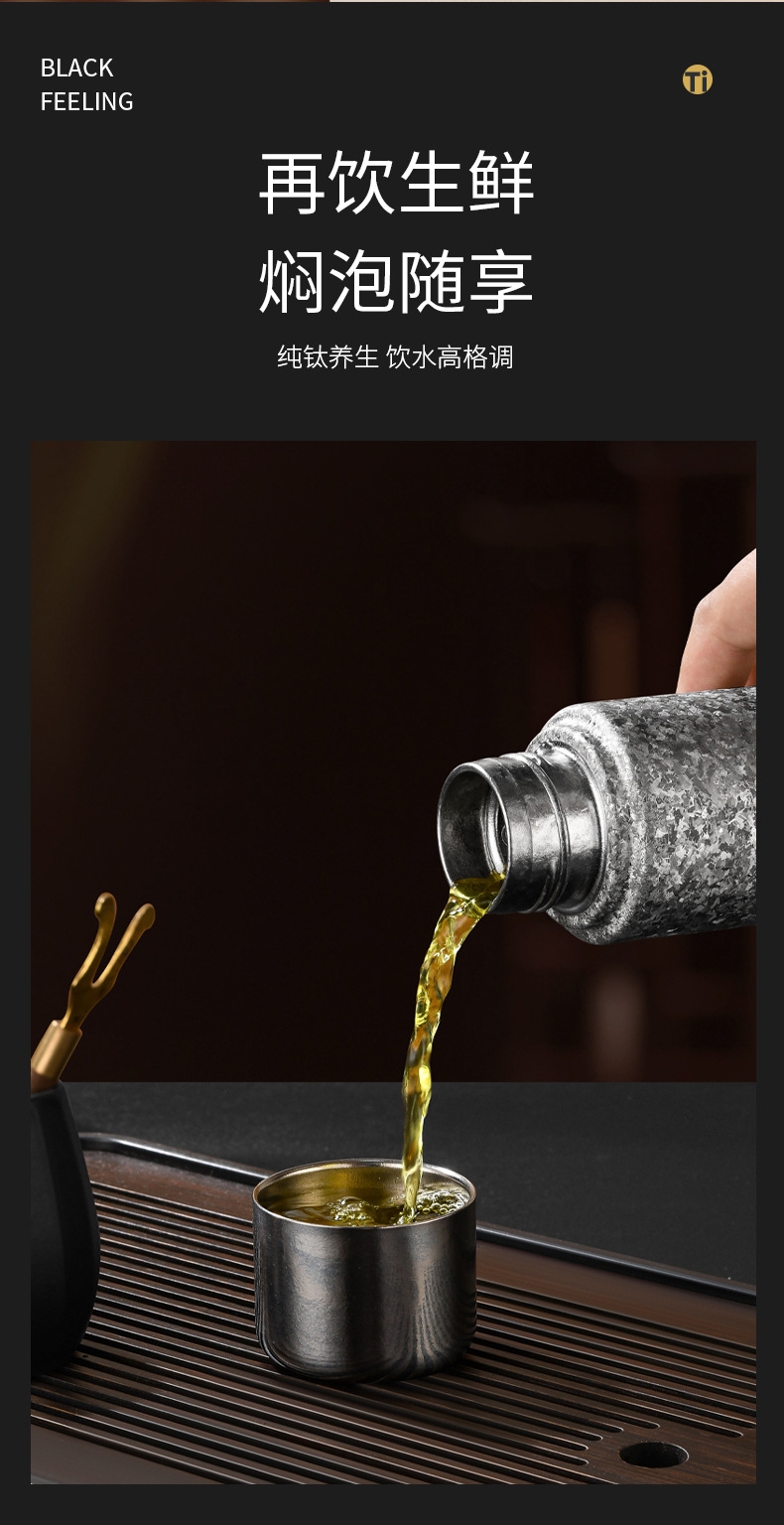 (天然)孕育钛,自然更出彩 不同温度烧制形成色彩;纯钛无塑料无油漆,纯钛球头过滤网,倒置不漏水;高端内外纯钛抑菌持味 内外均为纯钛材质打造耐腐蚀;多层保温唤醒你一整天,久置茶汤温暖如初口感依旧;无畏酸碱万物皆可装,防漏到位外带不湿包