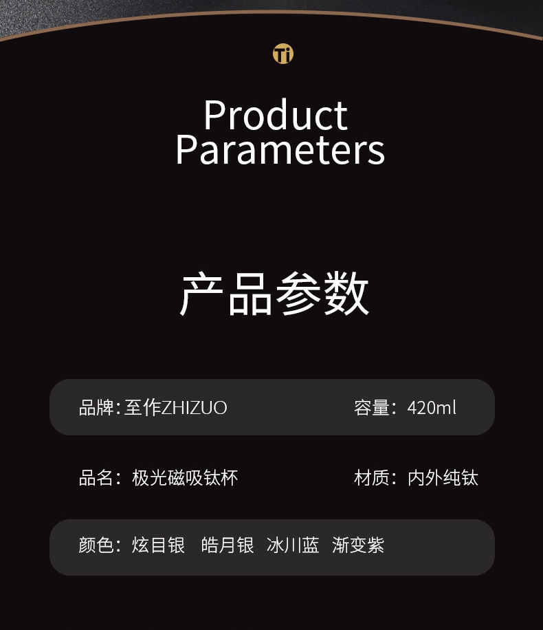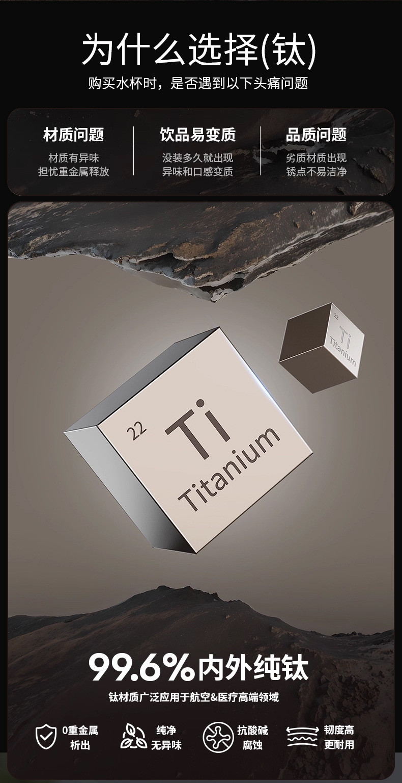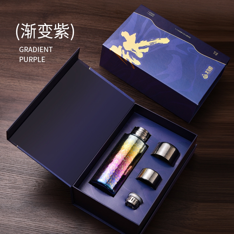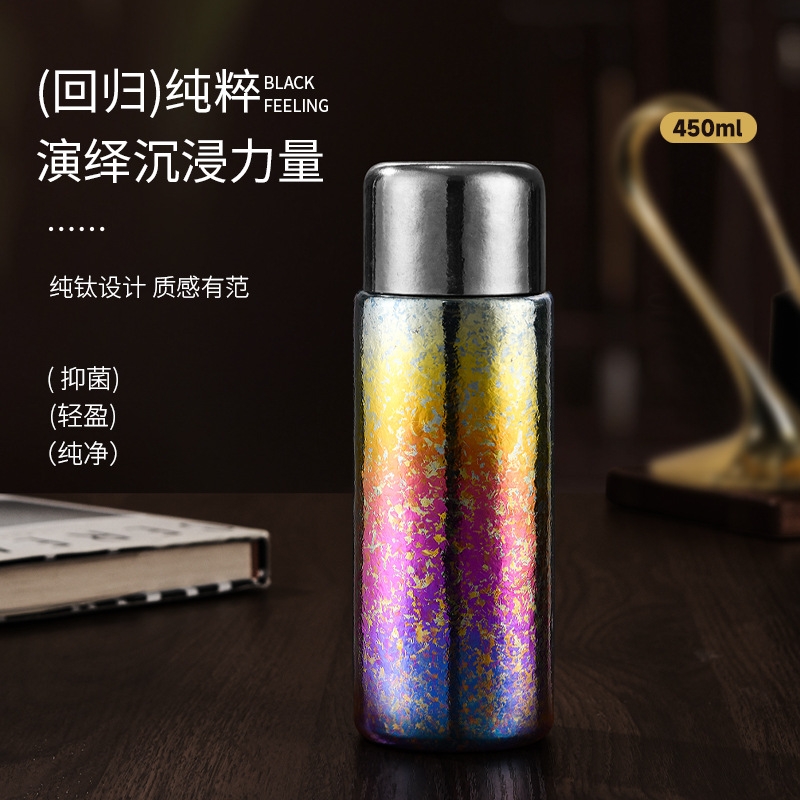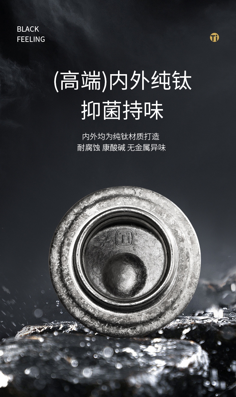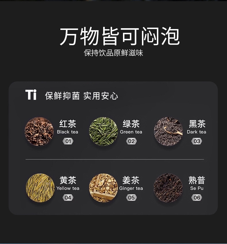 (天然)孕育钛,自然更出彩 不同温度烧制形成色彩;纯钛无塑料无油漆,纯钛球头过滤网,倒置不漏水;高端内外纯钛抑菌持味 内外均为纯钛材质打造耐腐蚀;多层保温唤醒你一整天,久置茶汤温暖如初口感依旧;无畏酸碱万物皆可装,防漏到位外带不湿包