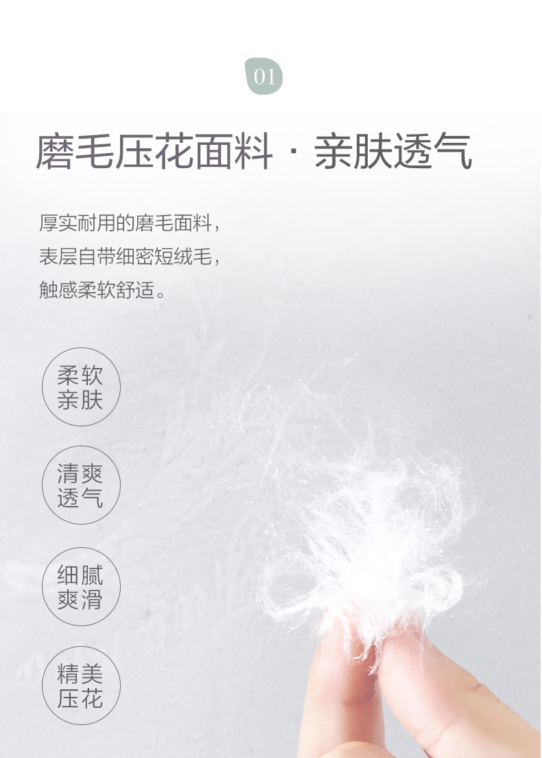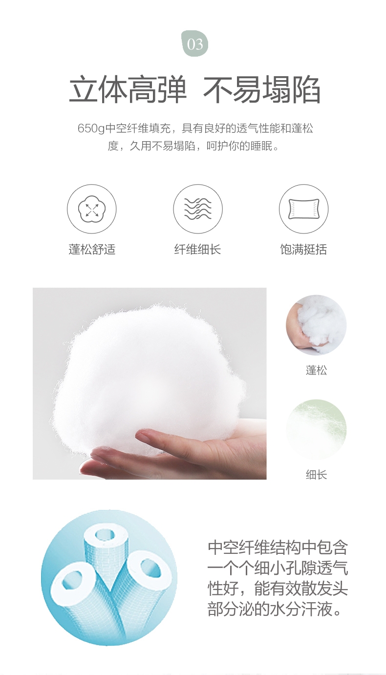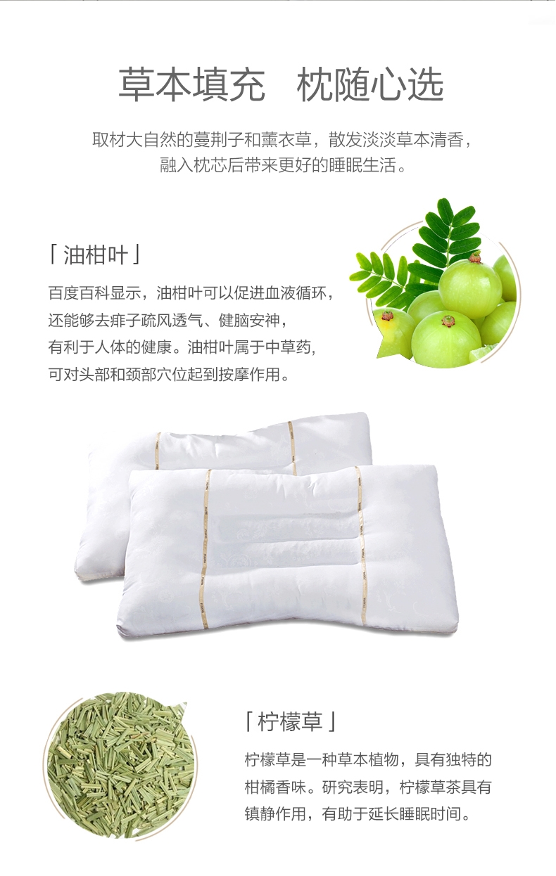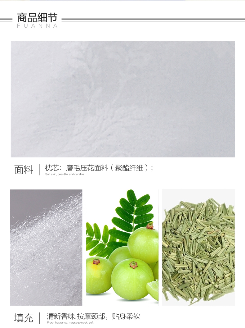 填充油柑叶+柠檬草,油柑叶促进血液循环,疏风透气;根据人体工学原理设计,贴合人体颈部曲线,健康颈椎;在表层形成细密短绒毛,触感柔软舒适