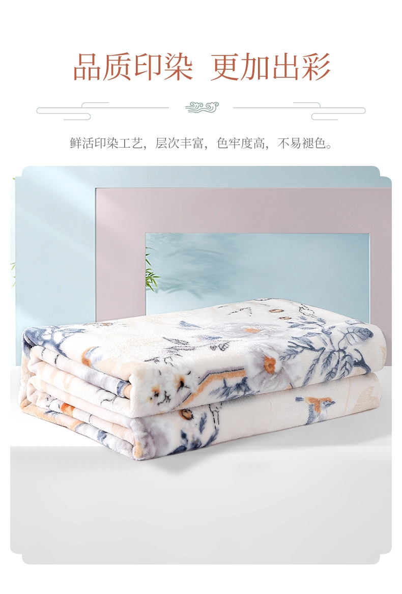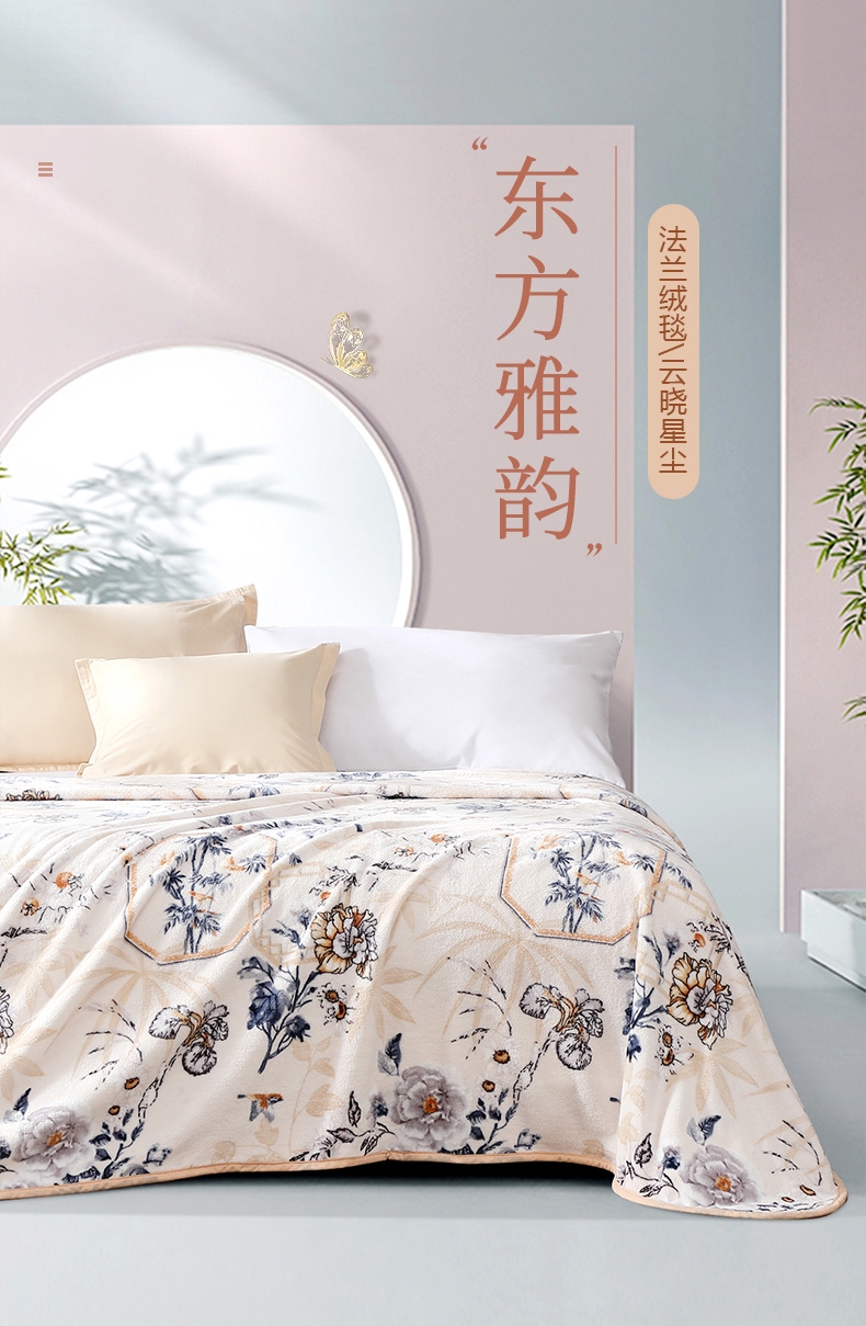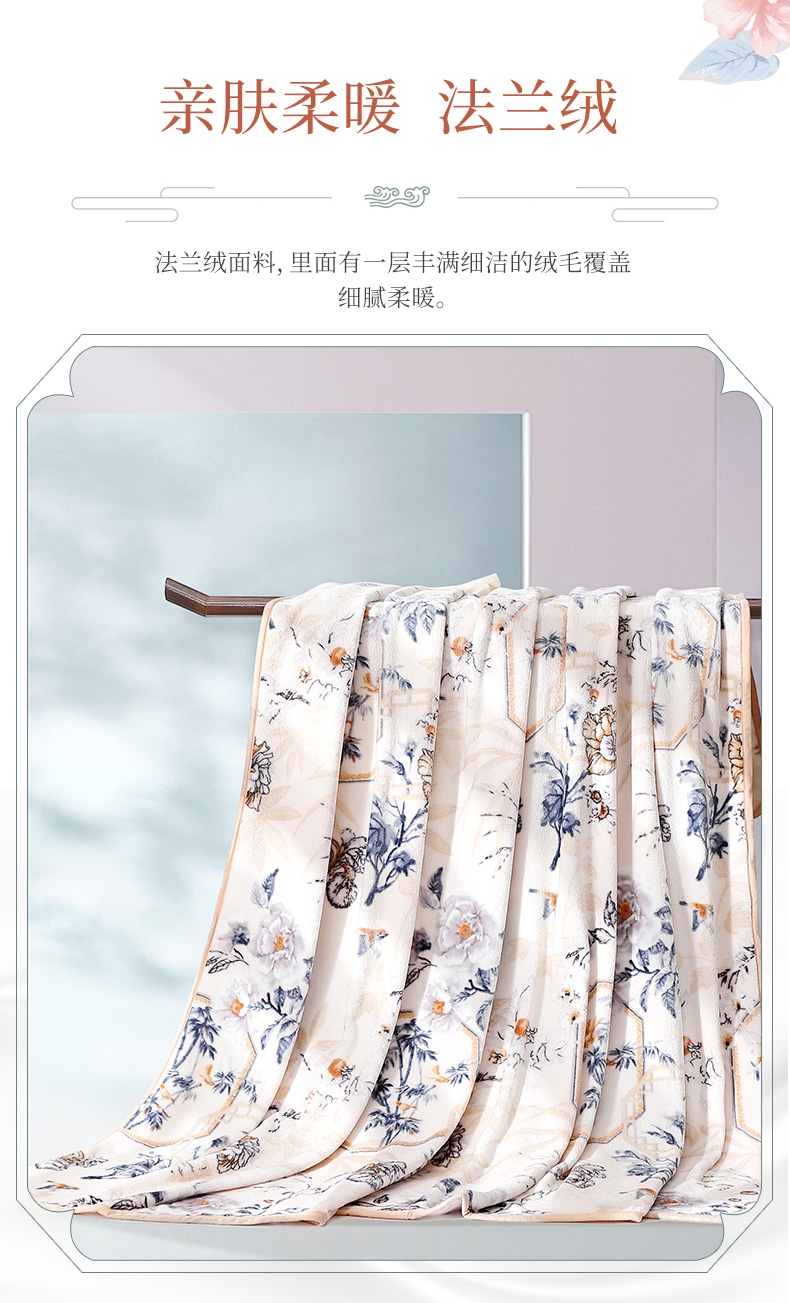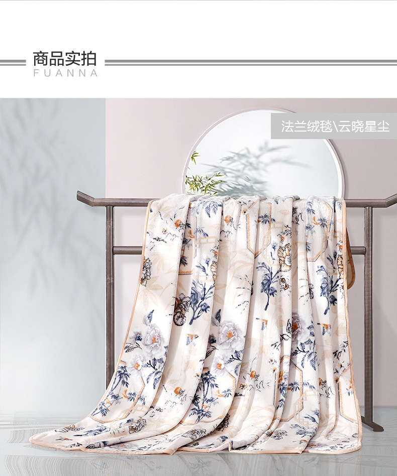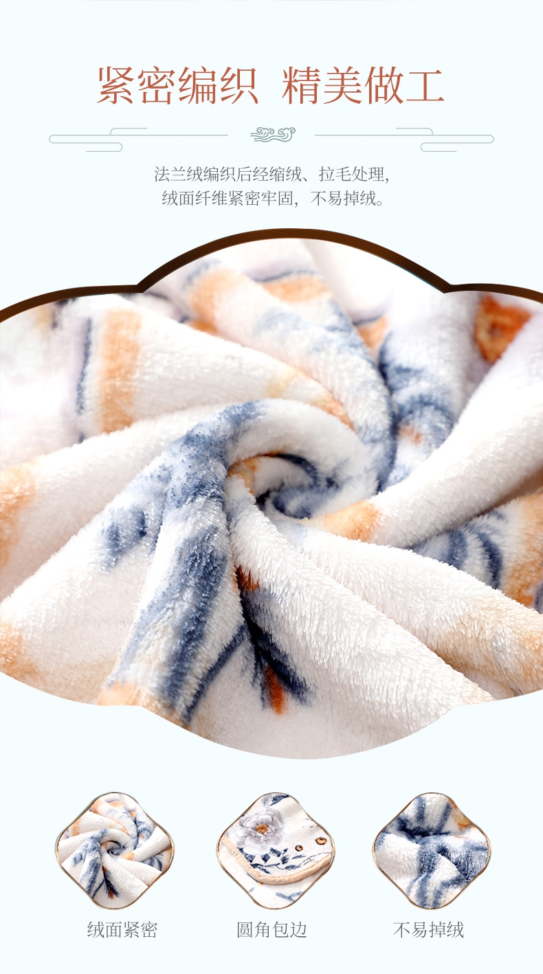 法兰绒是指粗梳毛纱织制的一种柔软而有绒面的毛织物;产品轻薄舒适、方便打理携带。乃居家、旅行、办公小憩;花型设计独特,绒面细腻丰盈,柔软舒适,透气舒爽