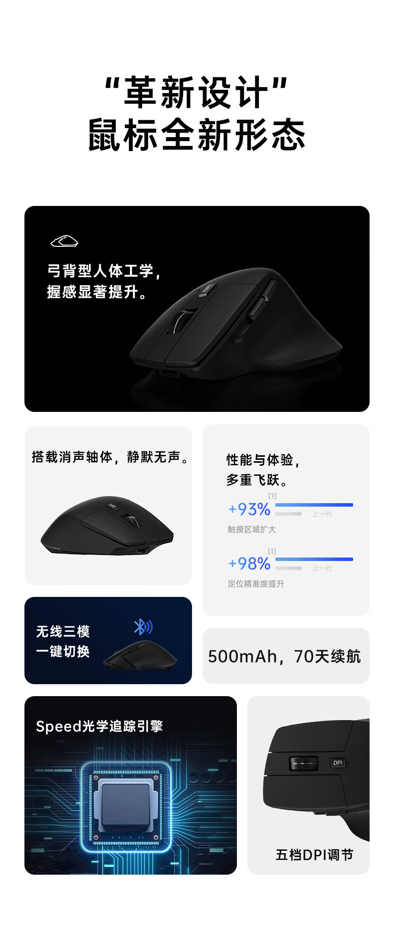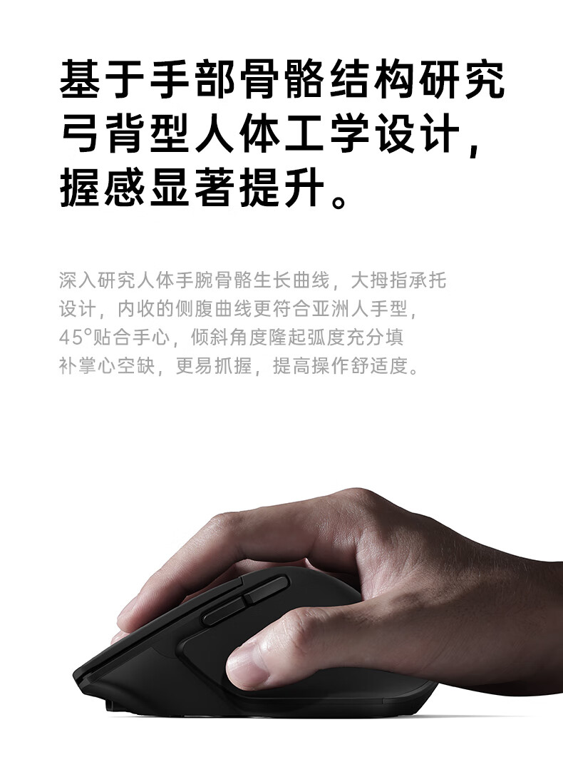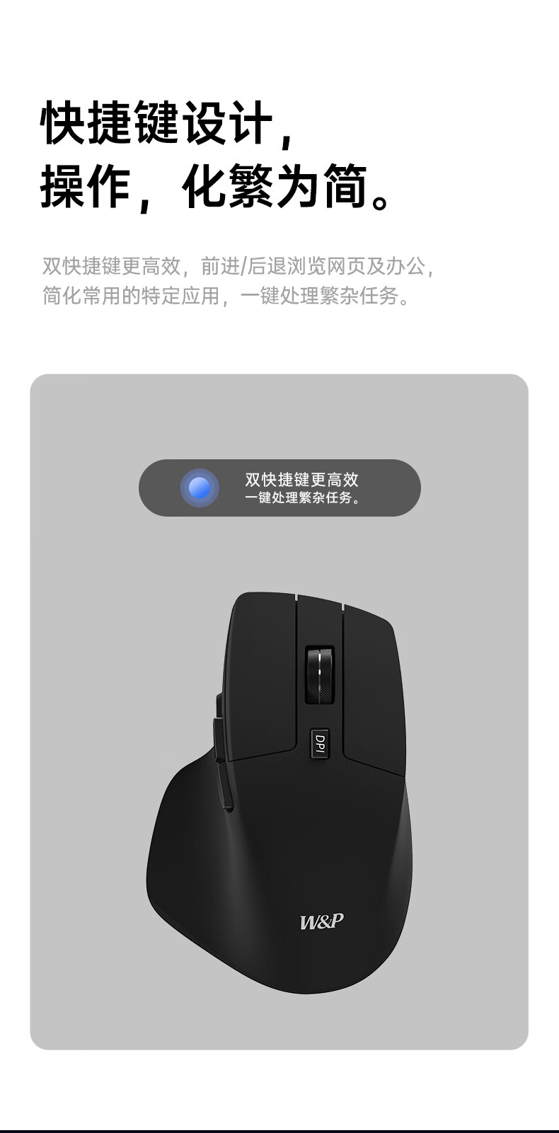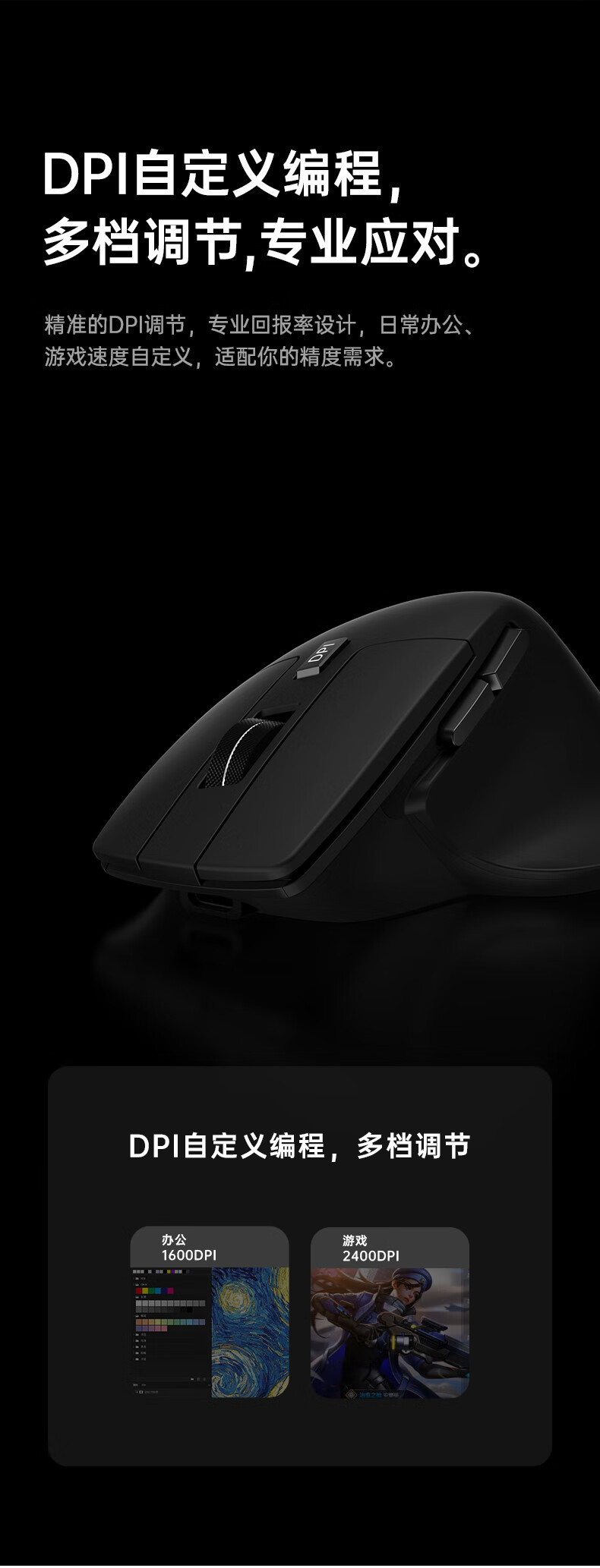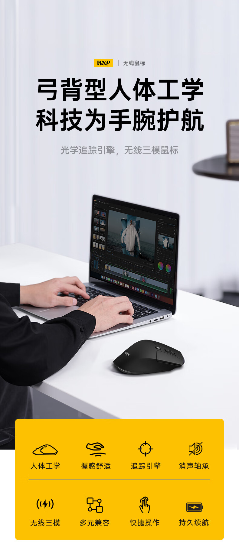 人体工学 无线鼠标;支持无线三模多元配对一键切换。;搭载消声轴承 高效办公静默无声