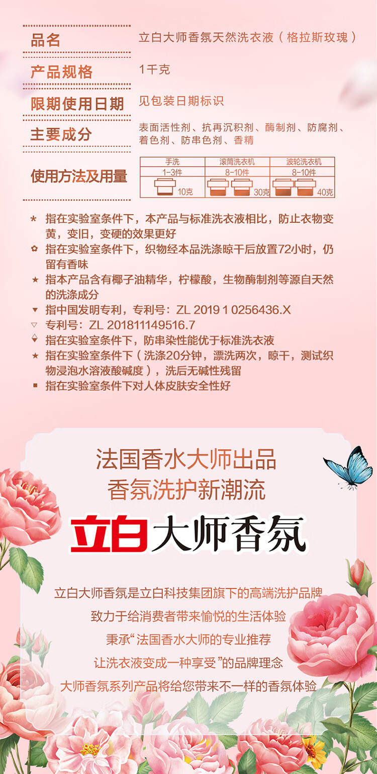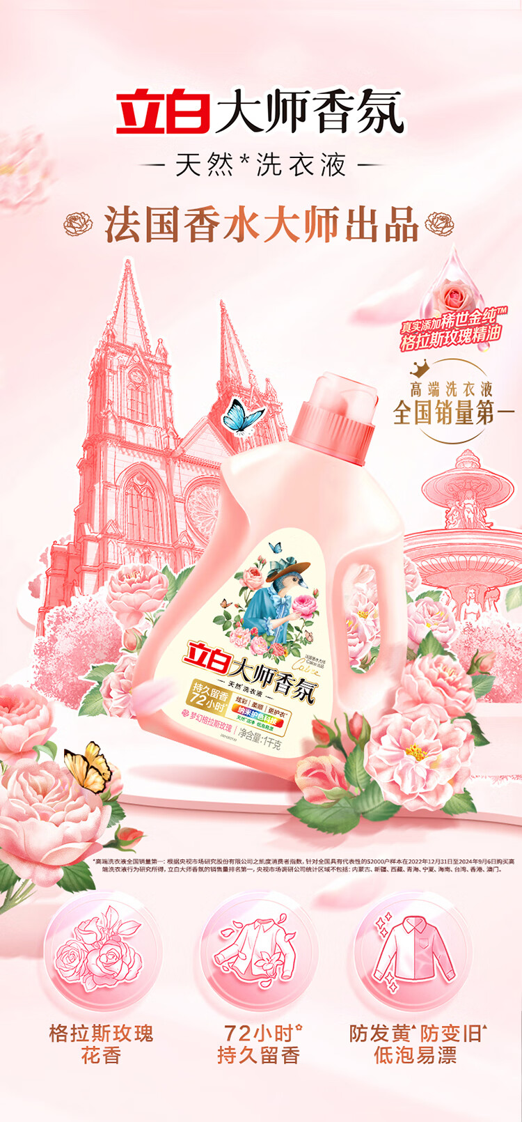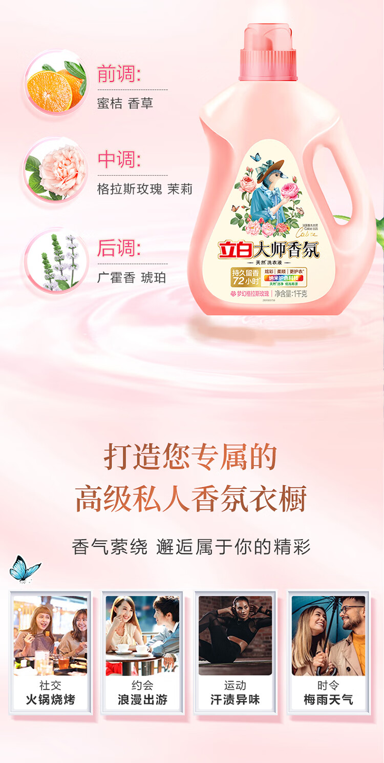 法国香水大师出品,高端洗衣液 全国销量第一;轻灵明媚延续法兰西浪漫传奇;打造您专属的 高级私人香氛衣橱 香气萦绕 邂逅属于;锁住香气 72小时持久留香;大师级天然洁净 中国发明专利 天然深层洁净
