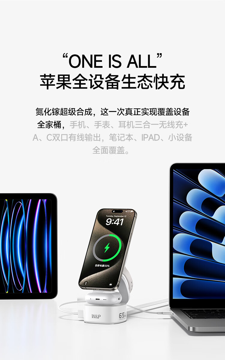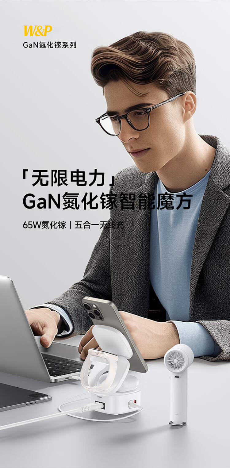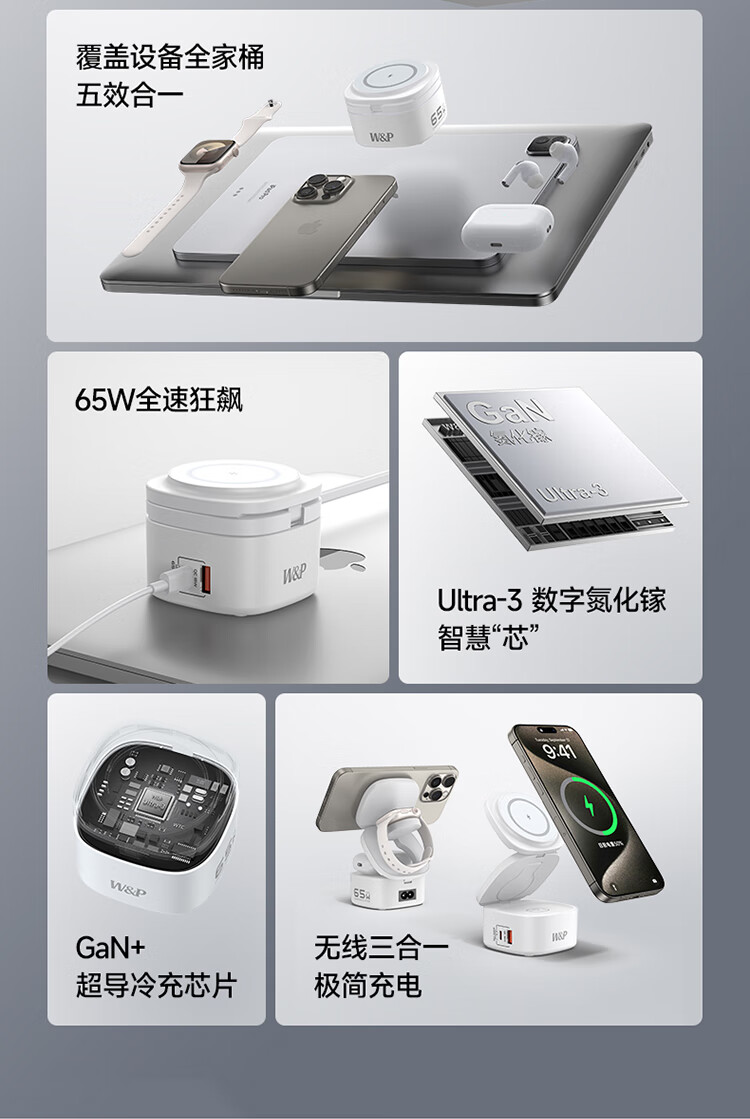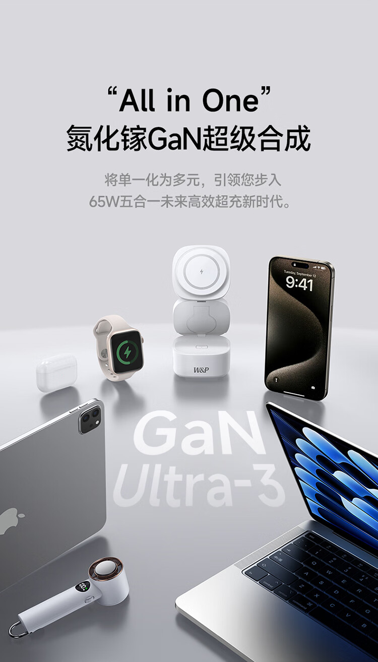 65W氮化镓五合一;覆盖设备全家桶五效合一;65W满级玩家笔记本充电,分秒必争