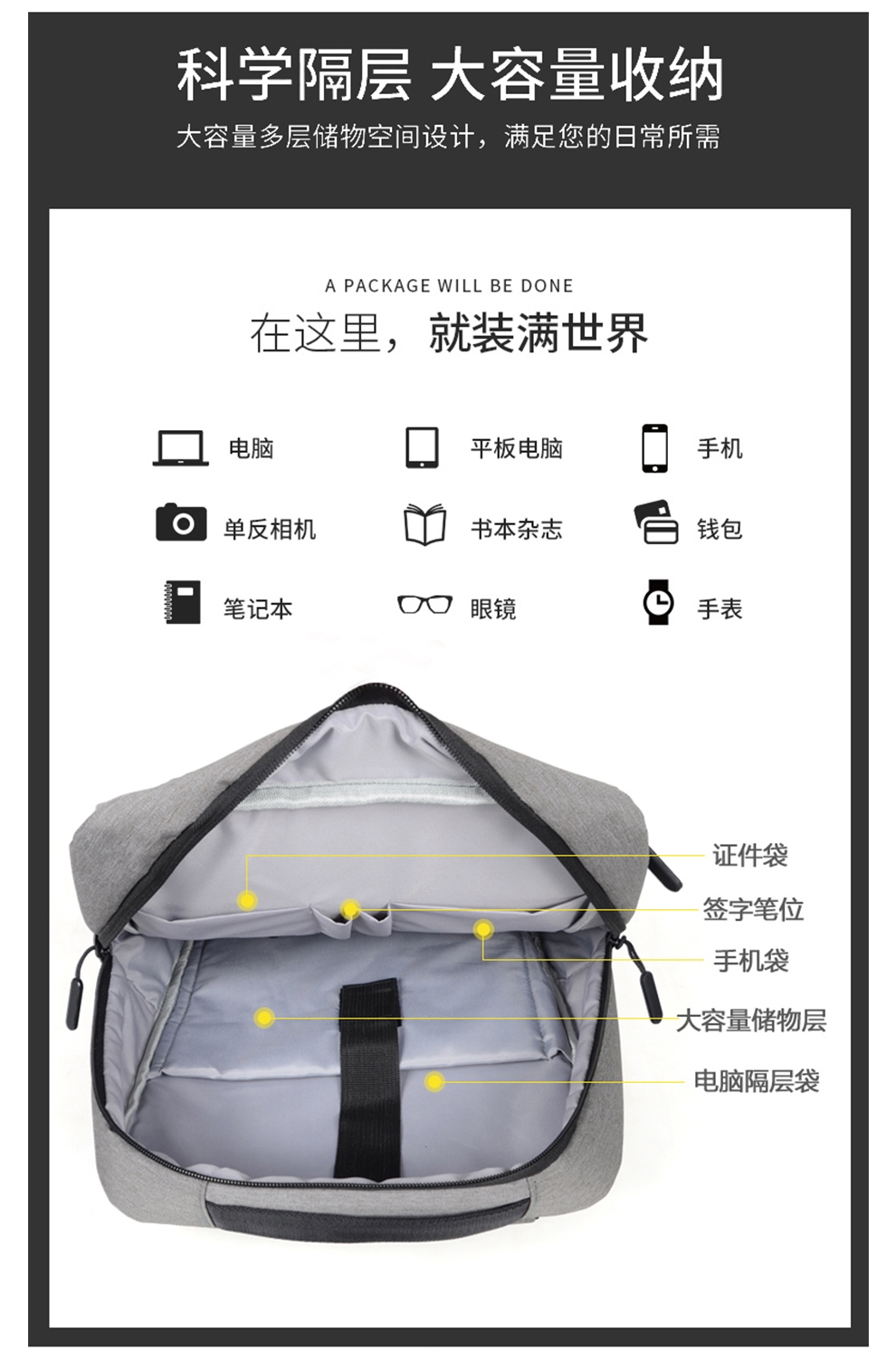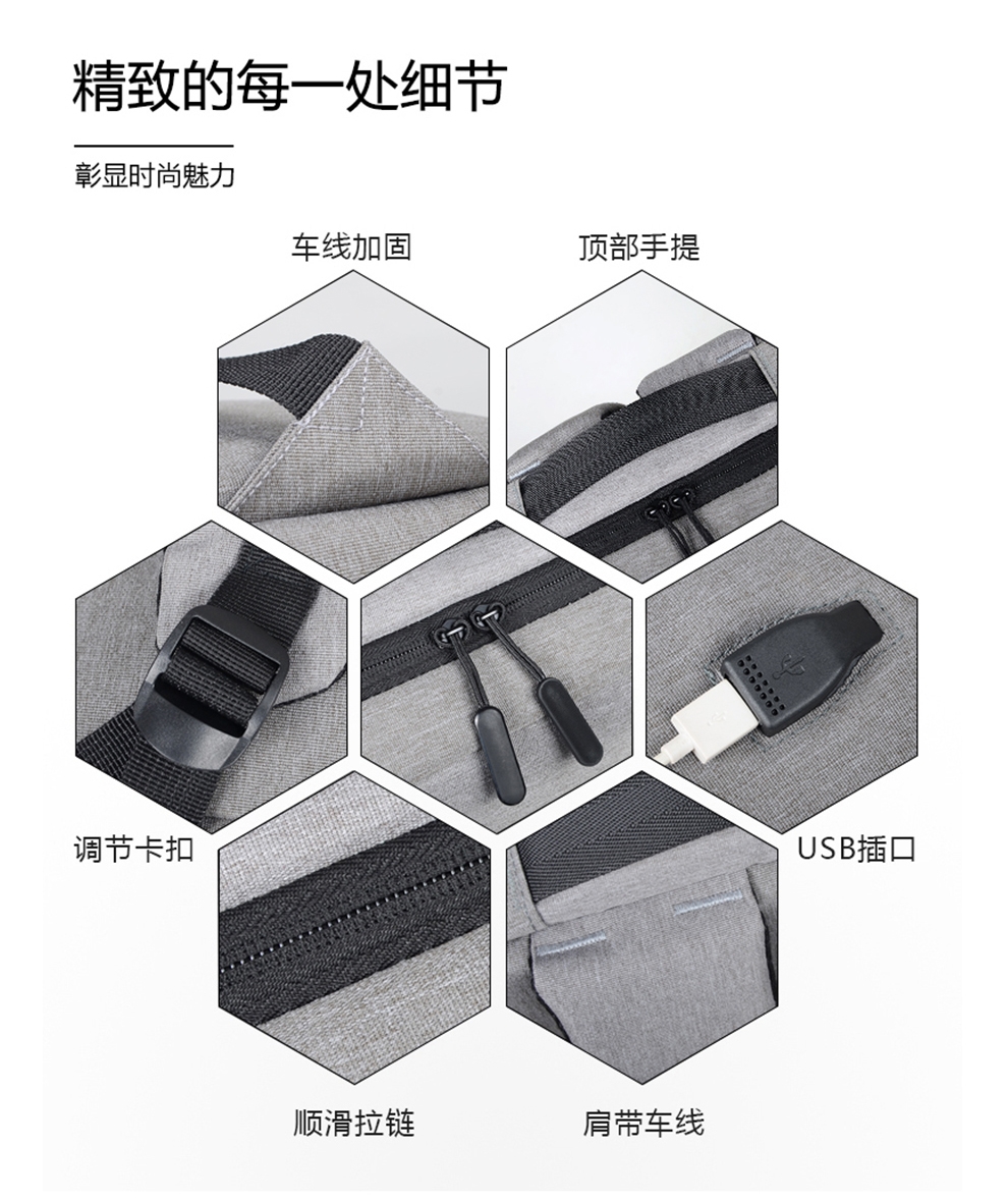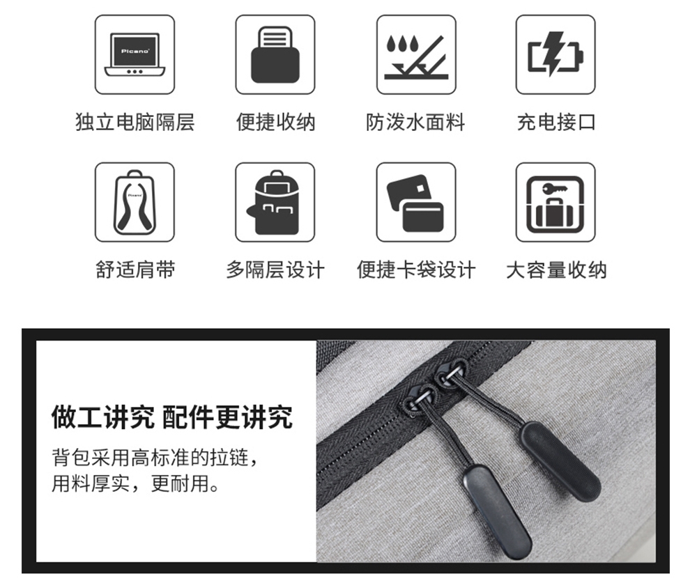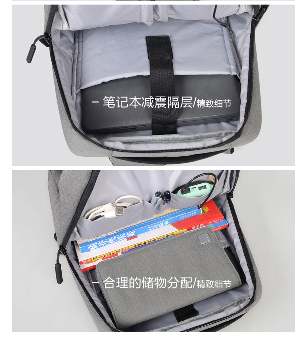 多隔层设计 大容量收纳 多隔层设计 大容量收纳;采用升级款面料,防刮耐磨,减震抗压的背负式设计;让我们出行更加轻盈自在,无论通勤还是出差都是不错的