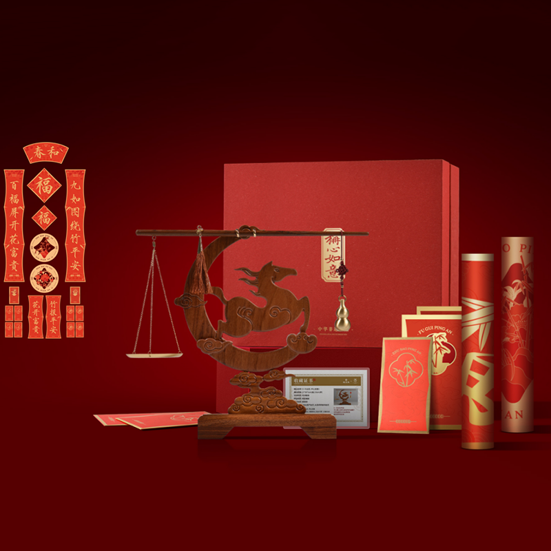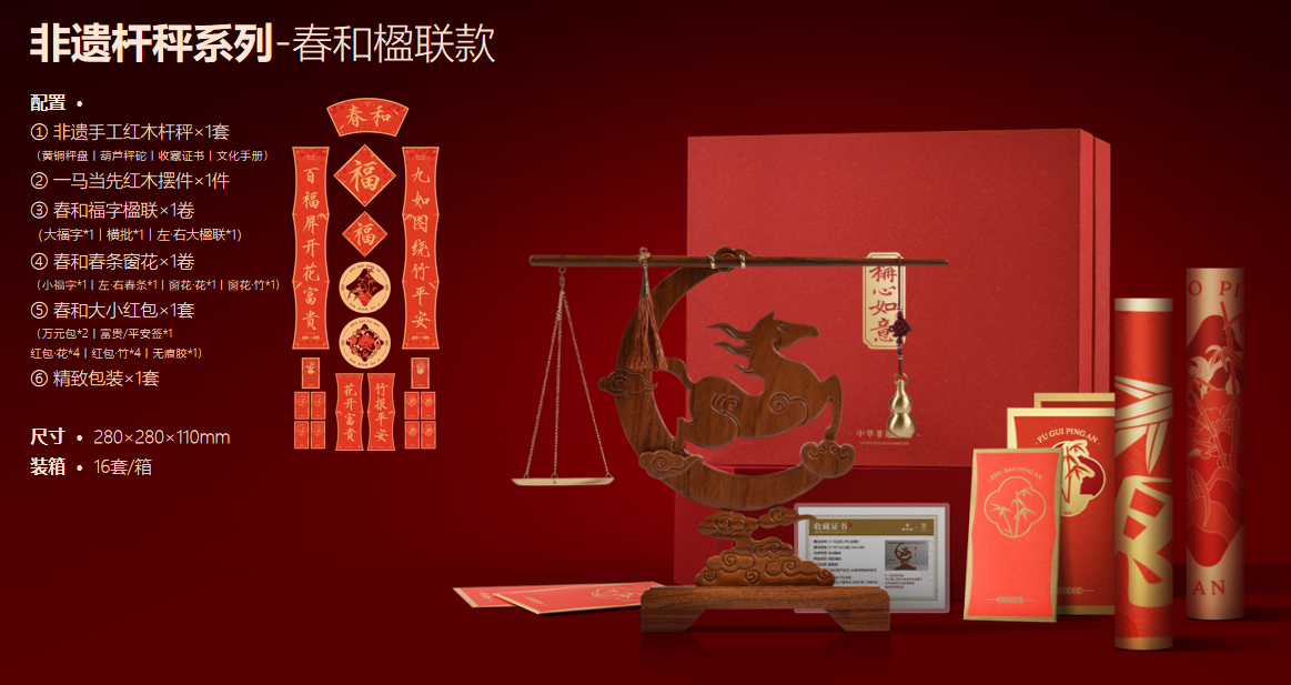 春和楹联款配置:① 非遗手工红木杆秤×1套 (黄铜秤盘丨葫芦秤砣丨收藏证书丨文化手册) ② 一马当先红木摆件×1件 ③ 春和福字楹联×1卷 (大福字*1丨横批*1丨左·右大楹联*1) ④ 春和春条窗花×1卷 (小福字*1丨左·右春条*1丨窗花·花*1丨窗花·竹*1) ⑤ 春和大小红包×1套 (万元包*2丨富贵/平安签*1 红包·花*4丨红包·竹*4丨无痕胶*1) ⑥ 精致包装×1套