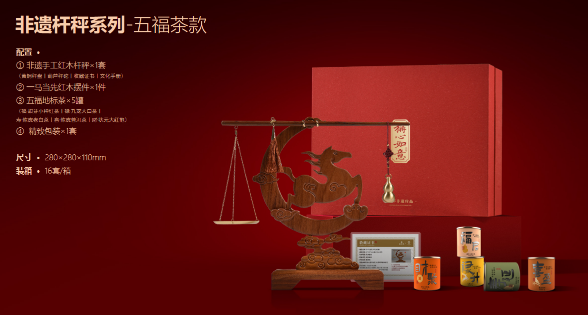 五福茶款配置:① 非遗手工红木杆秤×1套 (黄铜秤盘丨葫芦秤砣丨收藏证书丨文化手册) ② 一马当先红木摆件×1件 ③ 五福地标茶×5罐 (福·甜芽小种红茶丨禄·九龙大白茶丨 寿·陈皮老白茶丨喜·陈皮普洱茶丨财·状元大红袍) ④ 精致包装×1套