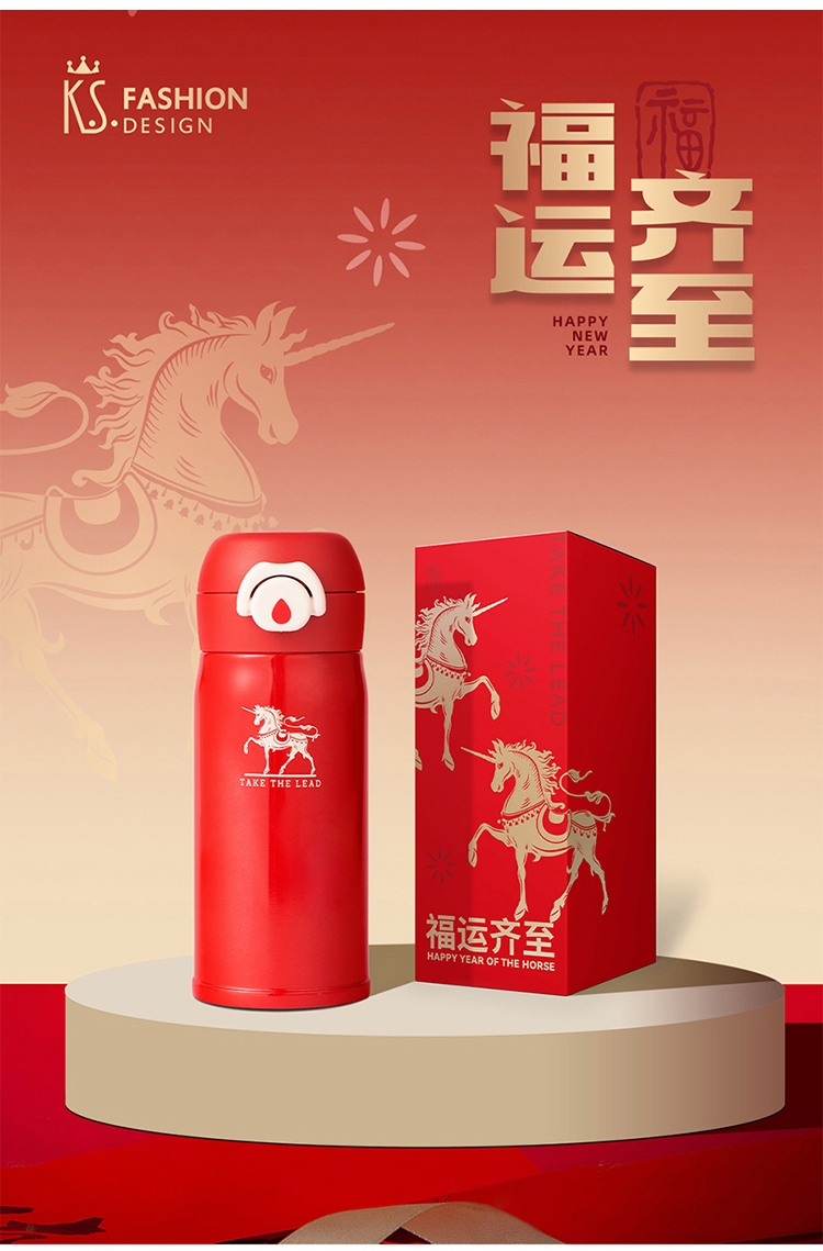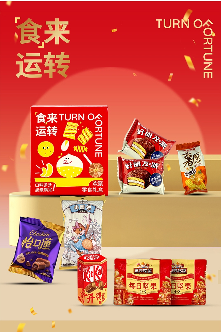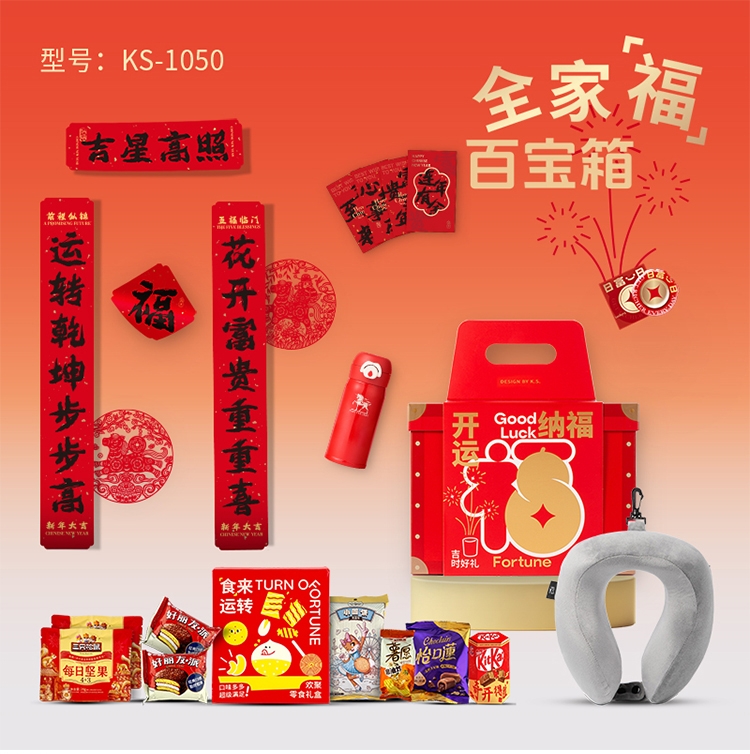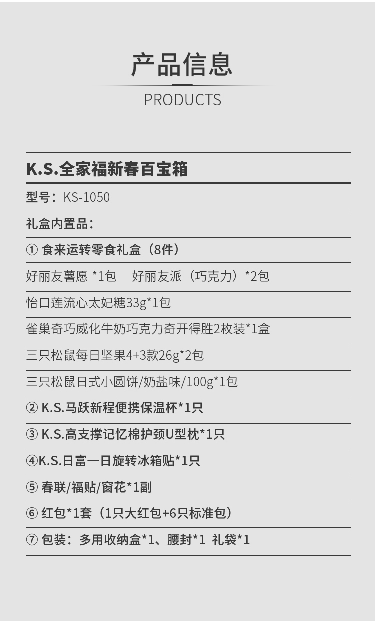 配置清单:① 食来运转零食礼盒8件套 ②K.S.马跃新程便携保温杯*1只 ③K.S.高支撑记忆棉护颈U型枕*1只 ④K.S.日富一日旋转冰箱贴*1只 ⑤春联/福贴/窗花*1副 ⑥ 红包*1套(1只大红包+6只标准包) ⑦ 包装:多用收纳盒*1、腰封*1 礼袋*1