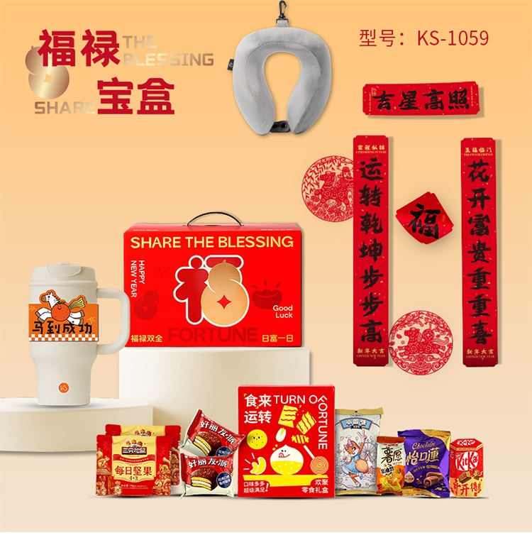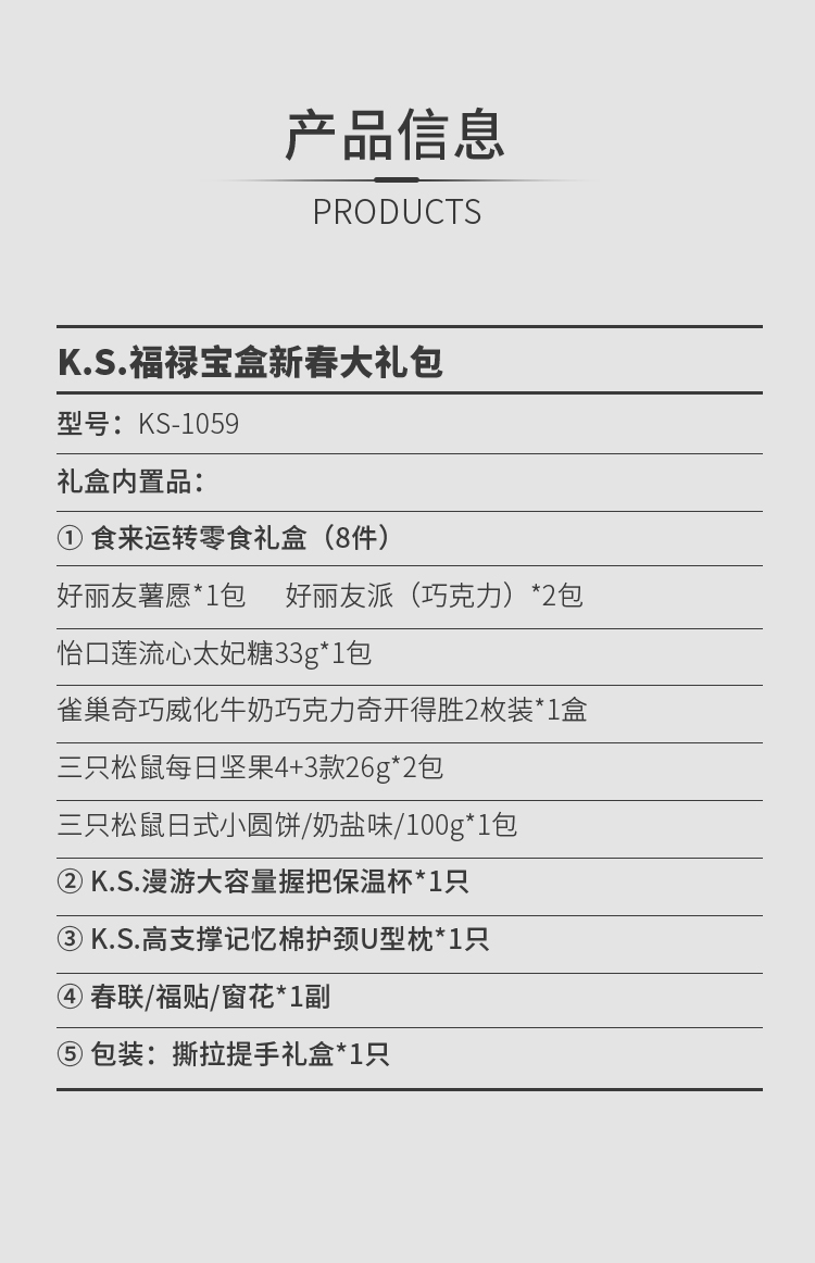 配置清单:① 食来运转零食礼盒8件套 ②K.S.漫游大容量握把保温杯*1只 ③K.S.高支撑记忆棉护颈U型枕*1只 ④春联/福贴/窗花*1副 ⑤包装:撕拉提手礼盒*1只