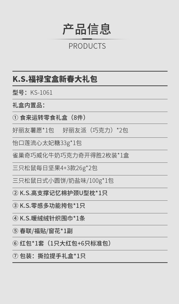 配置清单:①食来运转零食礼盒8件套 ②K.S.高支撑记忆棉护颈U型枕*1只 ③K.S.零感多功能挎包*1只 ④K.S.暖绒绒针织围巾 *1条 ⑤春联/福贴/窗花*1副 ⑥红包*1套(1只大红包+6只标准包) ⑦包装:撕拉提手礼盒*1只