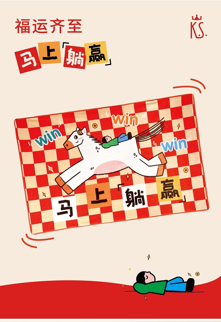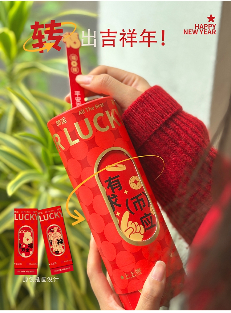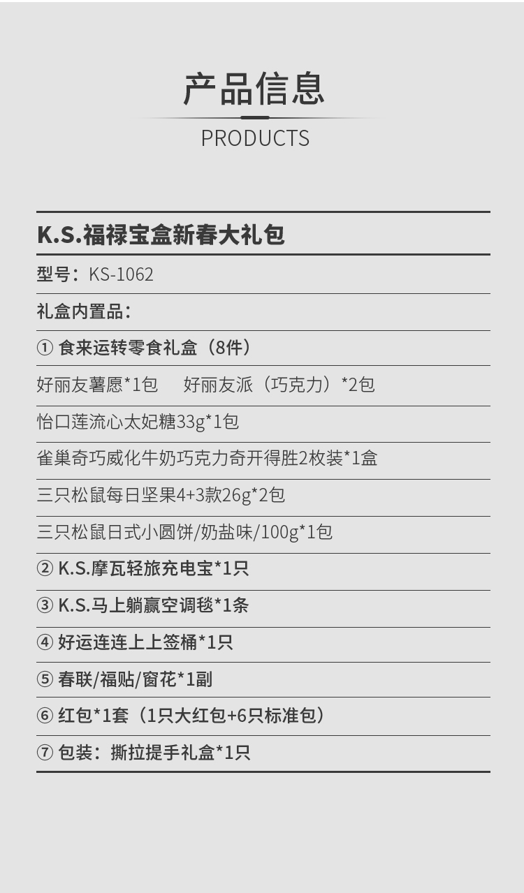 配置清单:① 食来运转零食礼盒8件套 ②K.S.摩瓦轻旅充电宝*1只 ③ K.S.马上躺赢空调毯*1条 ④好运连连上上签桶*1只 ⑤春联/福贴/窗花*1副 ⑥红包*1套(1只大红包+6只标准包) ⑦包装:撕拉提手礼盒*1只