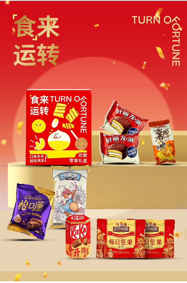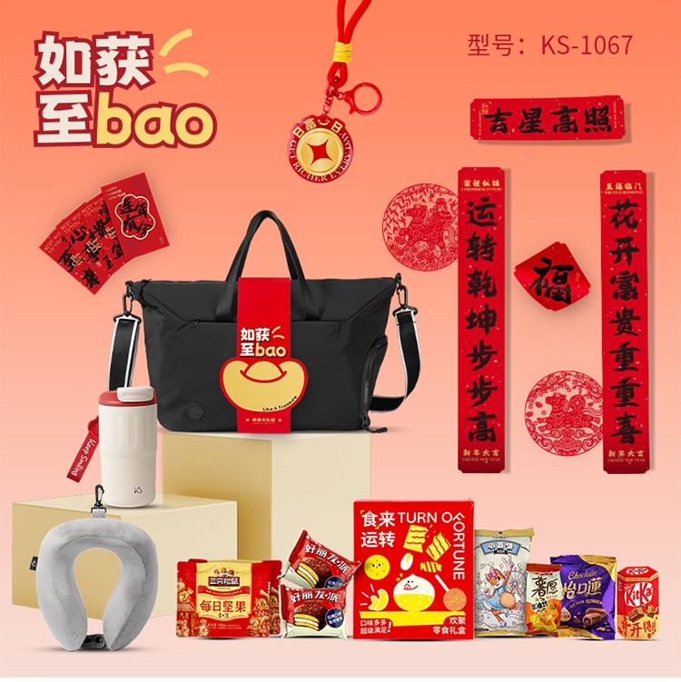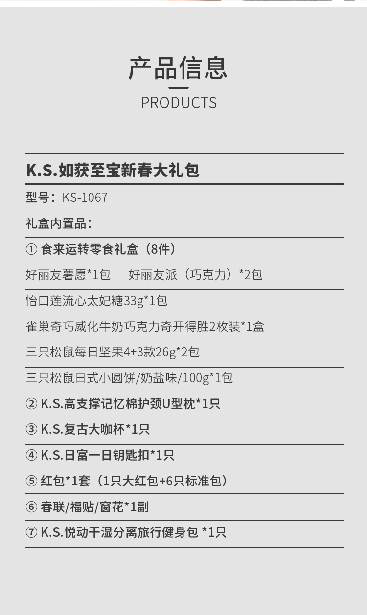 配置清单:①食来运转零食礼盒8件套 ②K.S.高支撑记忆棉护颈U型枕*1只 ③K.S.复古大咖杯*1只 ④K.S.日富一日钥匙扣*1只 ⑤红包*1套(1只大红包+6只标准包) ⑥春联/福贴/窗花*1副 ⑦K.S.悦动干湿分离旅行健身包 *1只