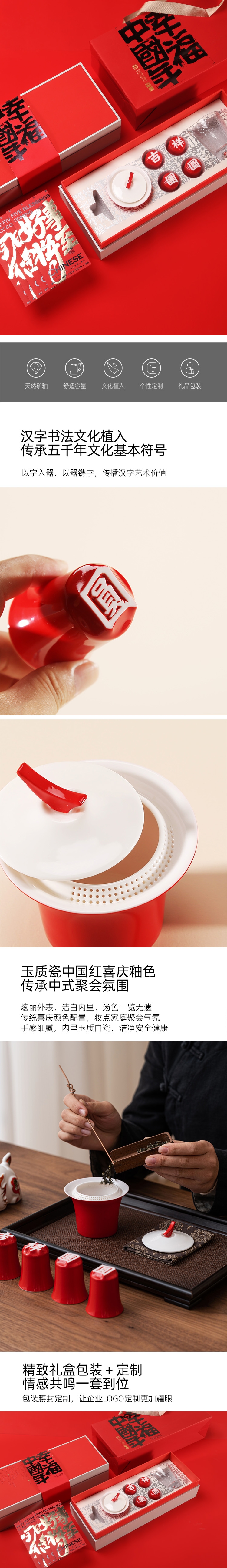汉字杯历经1300度以上高温烧制,不含铅和镉等重金;杯型源自竹节,独家专利开模,手工塑形。;传统中国红,结合汉字书法魏碑字体,相得益彰 。