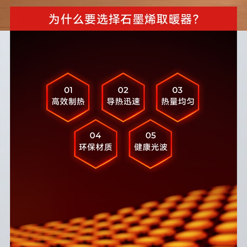 石墨烯铝片发热体;IPX4防水等级,导热不导电,可实现居浴两用;机器两端有内嵌式提手设计,方便移动搬运