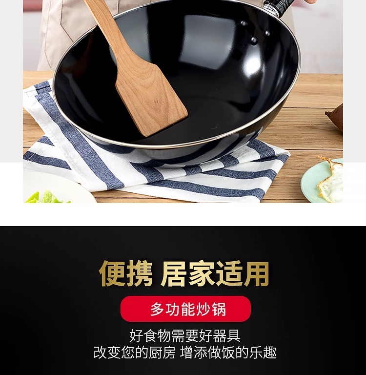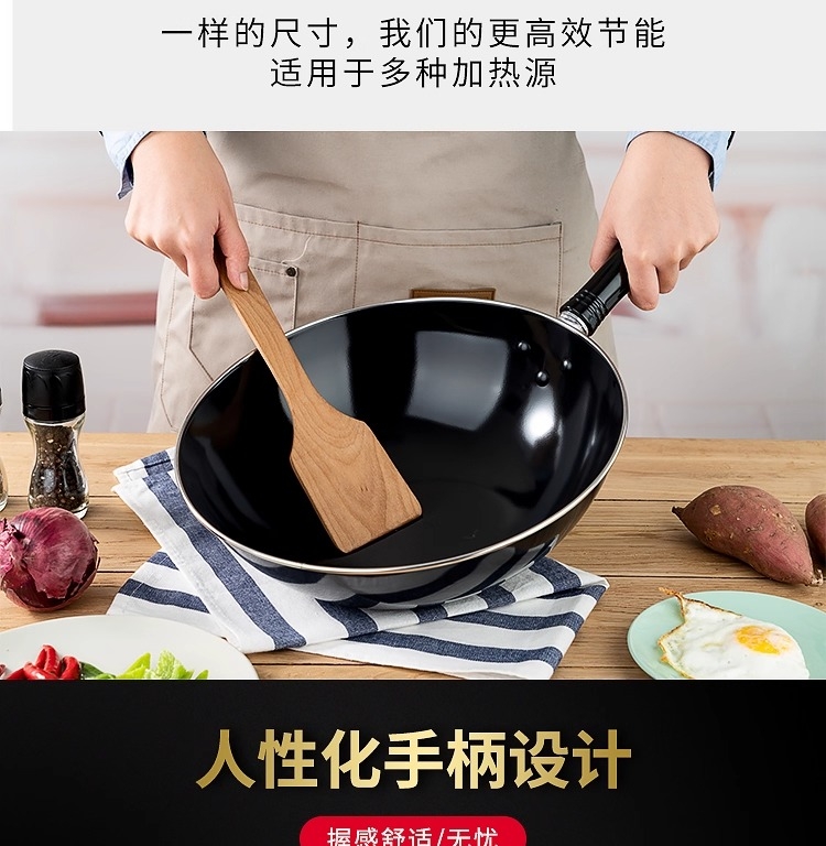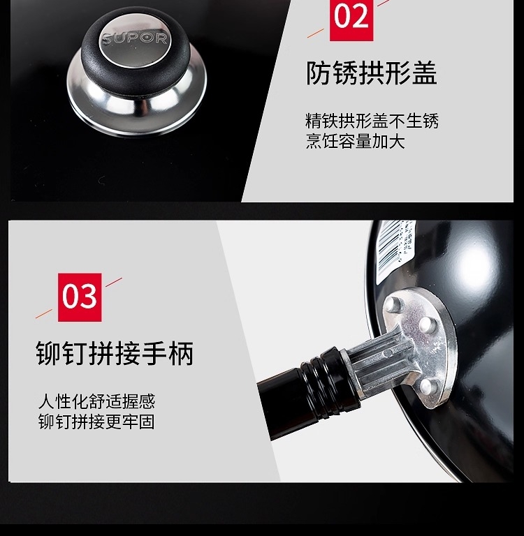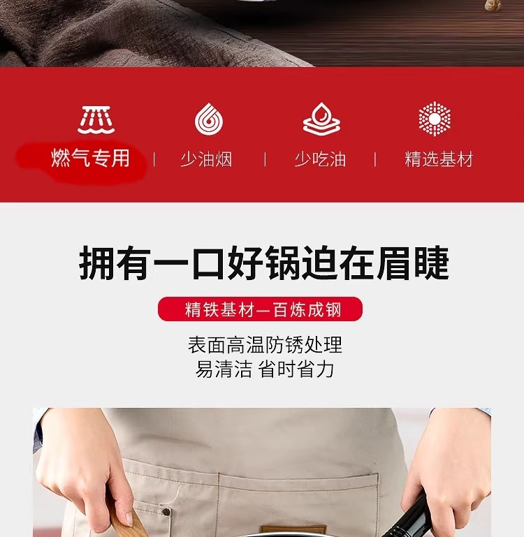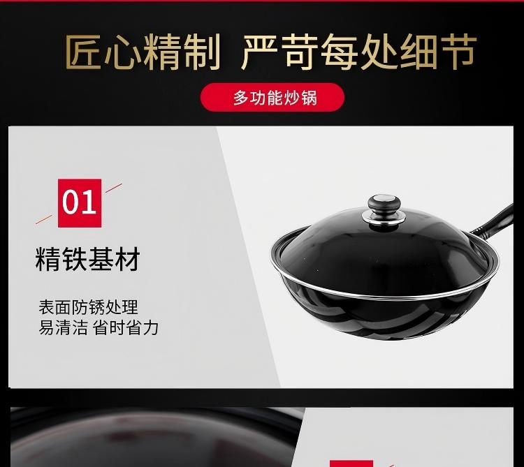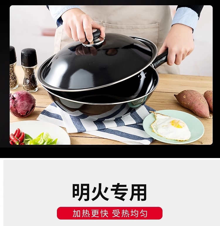 加厚锅体,有效抑制油烟产生 ;锅体氧化膜层加厚,耐磨抗蚀;表面高温防锈处理,表里搪瓷工艺,一擦即亮
