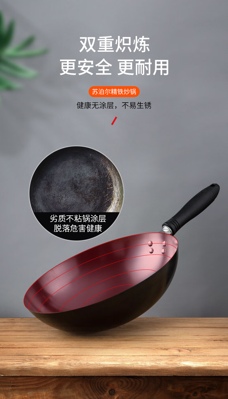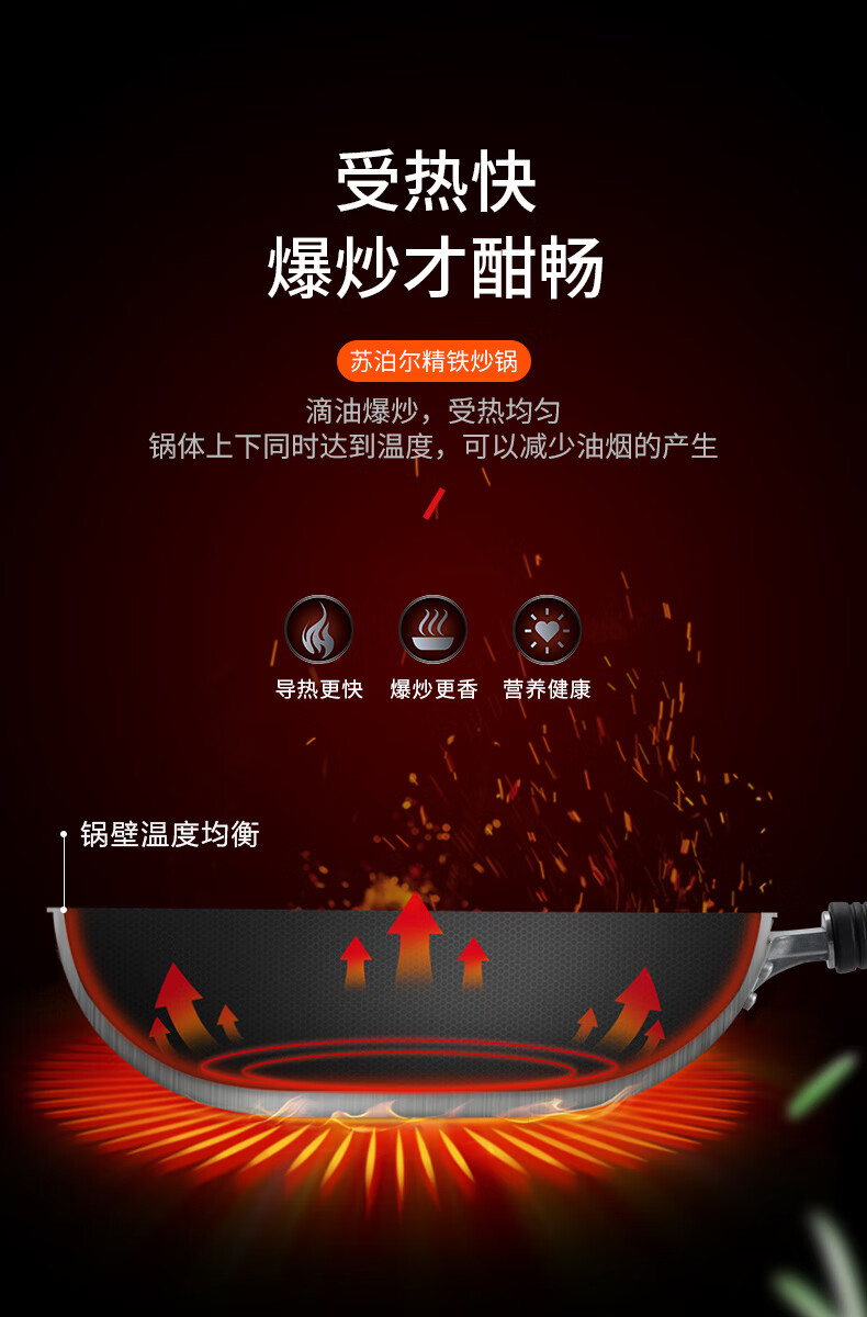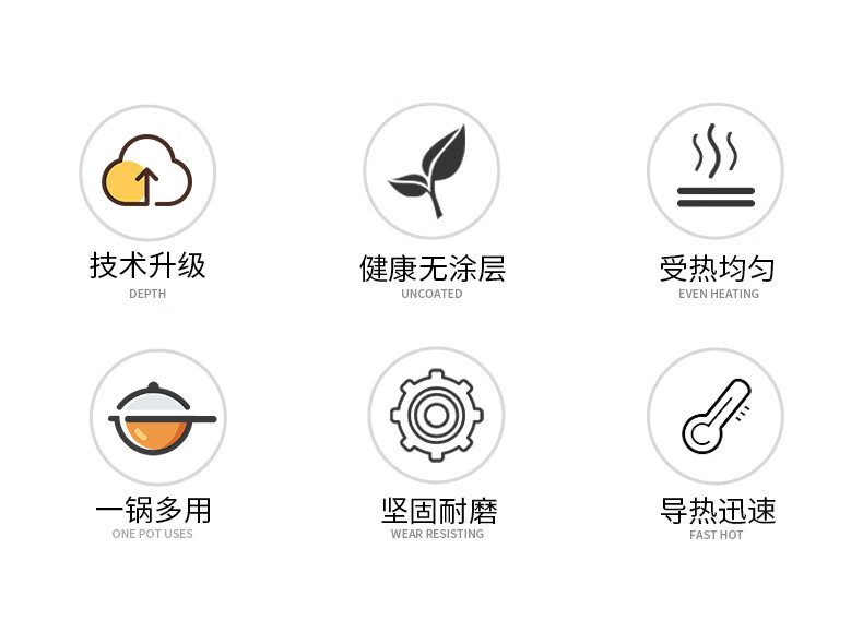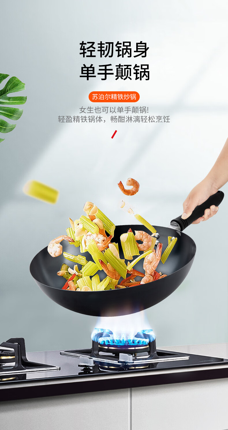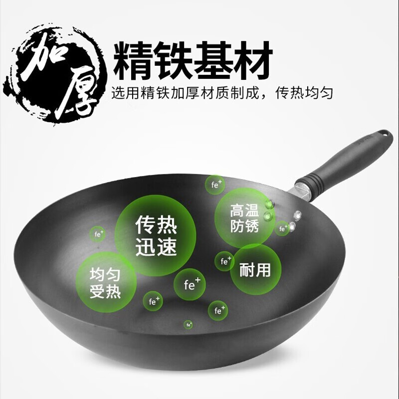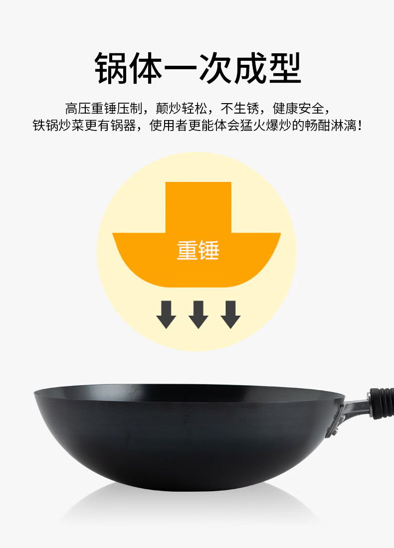 燃气专用节能省时;锅体一次成型,高压重锤压制,持久耐用;精铁锻造,快速传热
