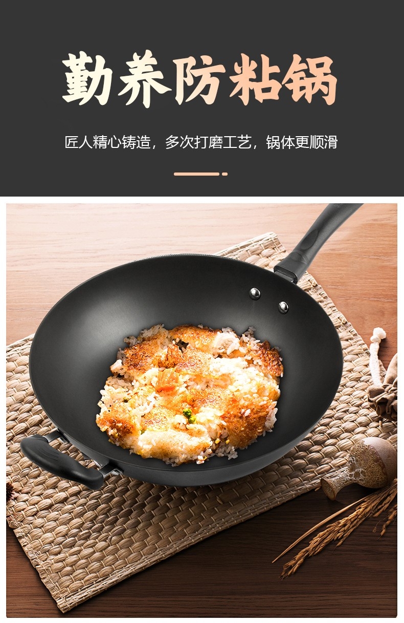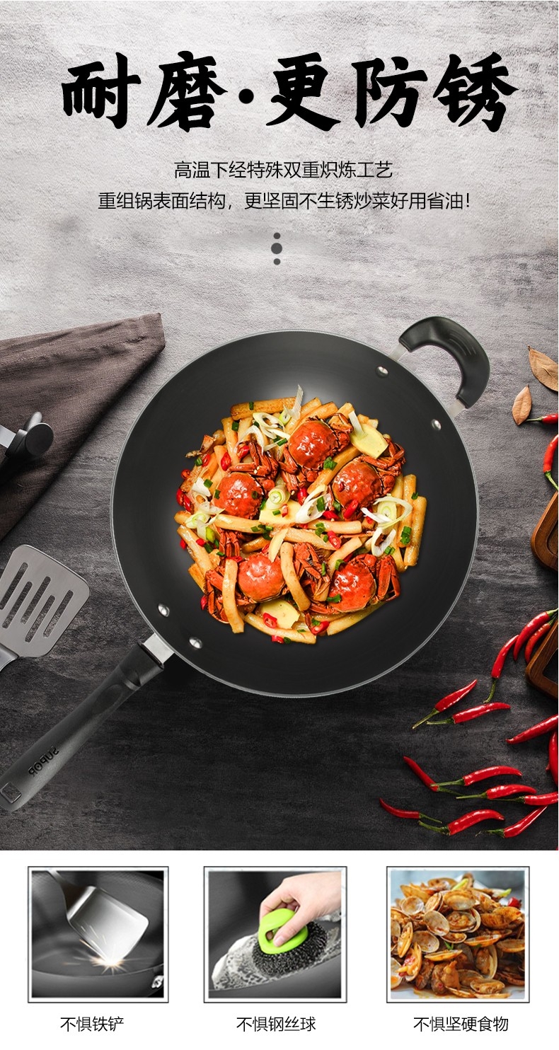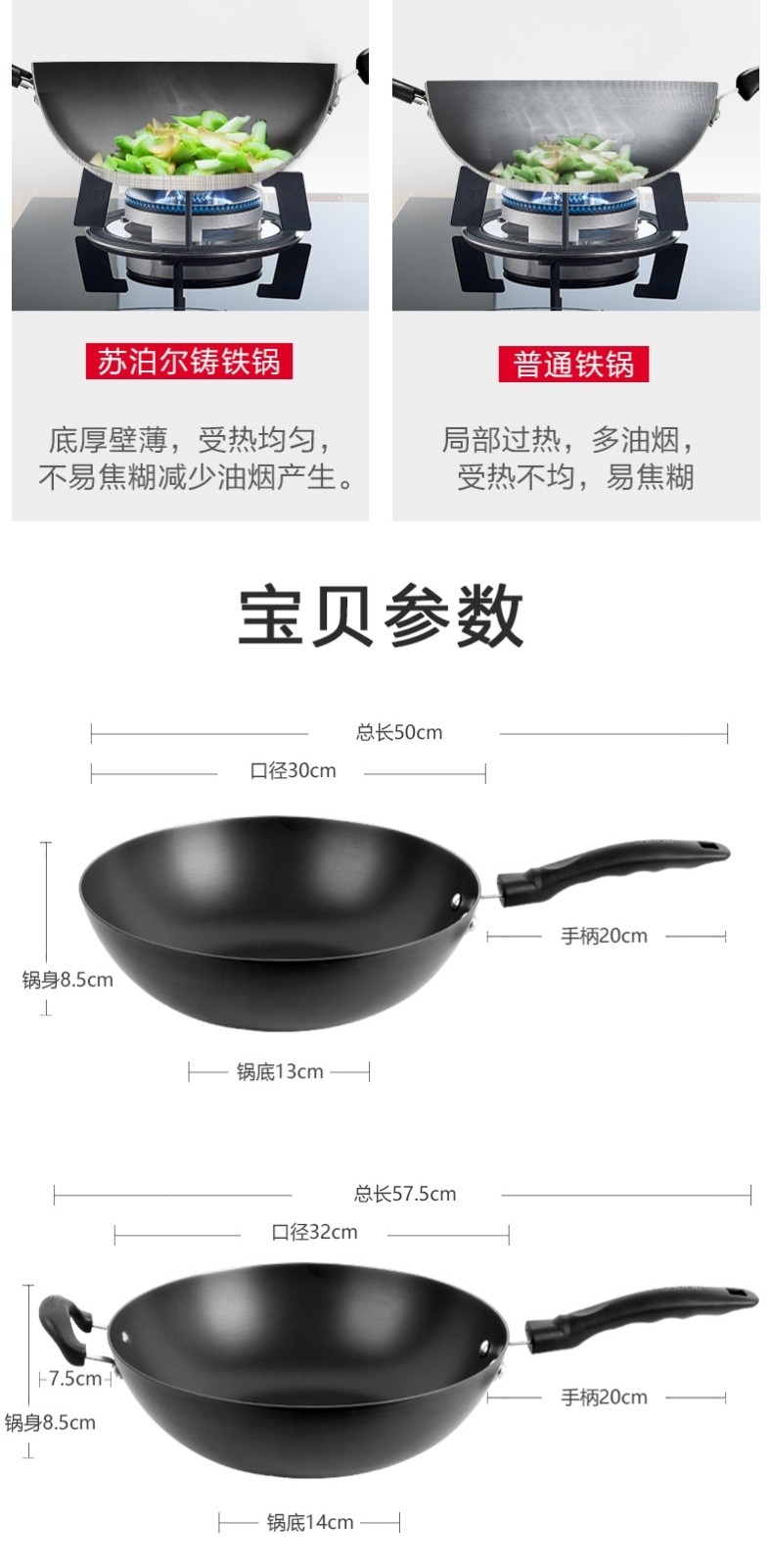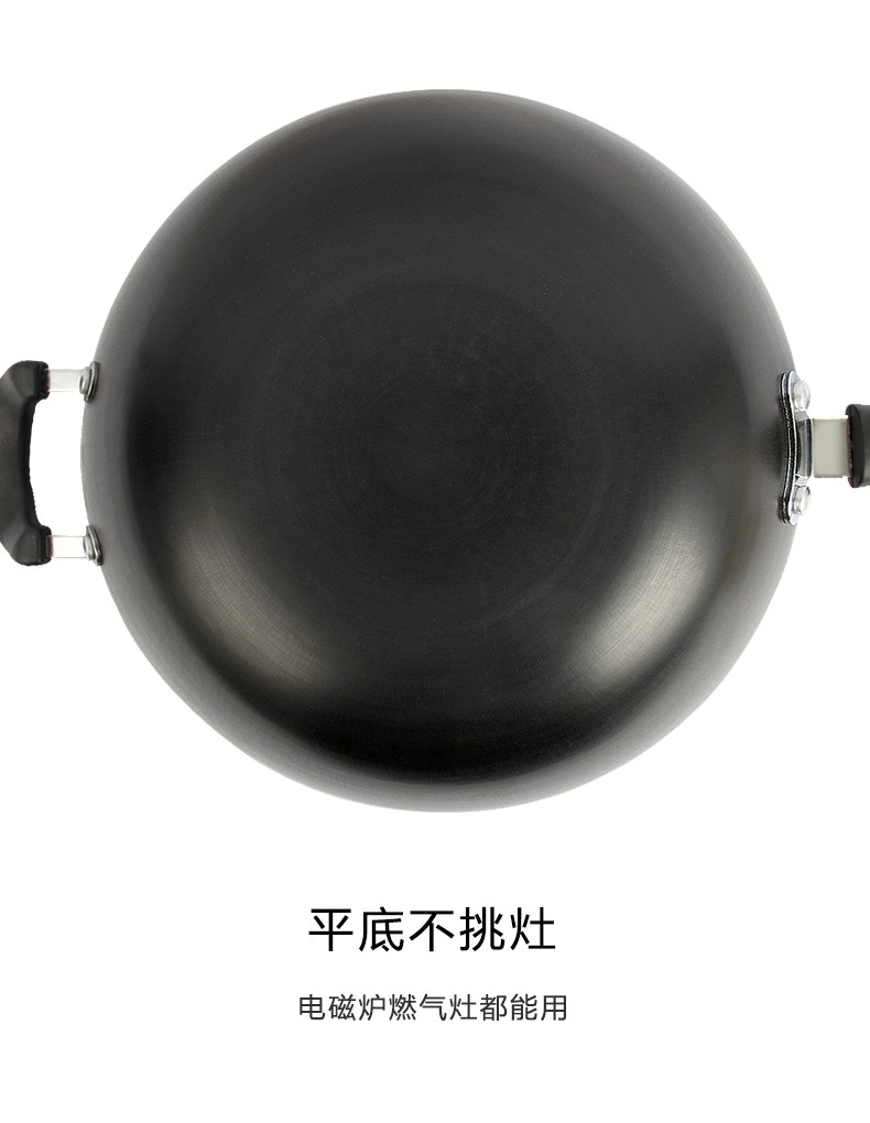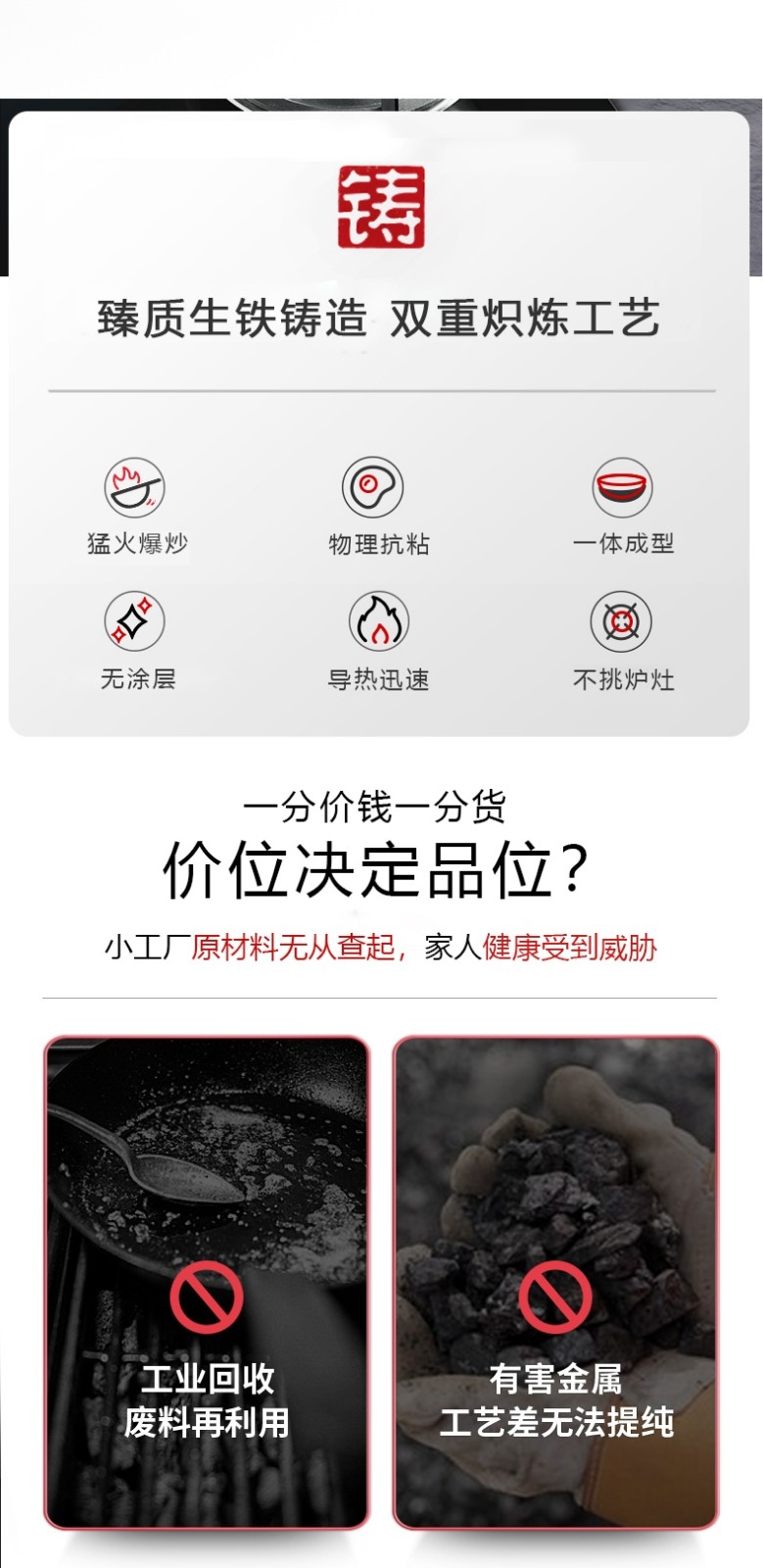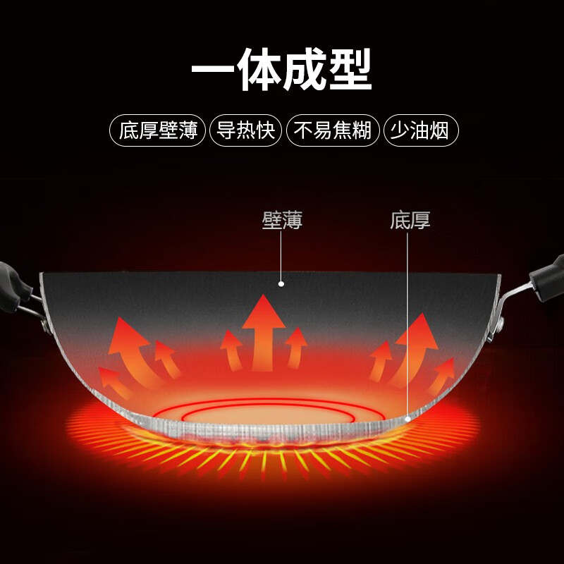 生铁铸造,耐磨防锈,无涂层;锅身一体成型,底厚壁薄,高效导热,不易焦糊;电磁炉燃气通用