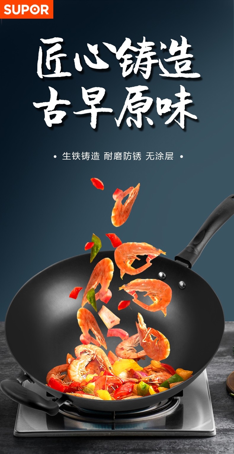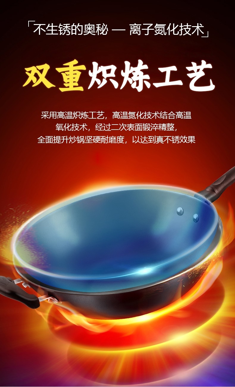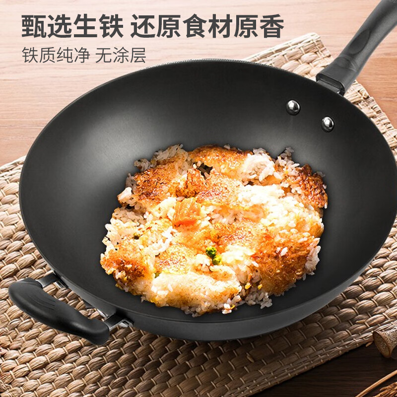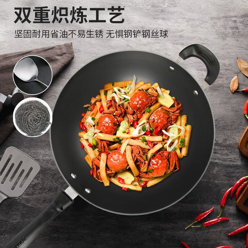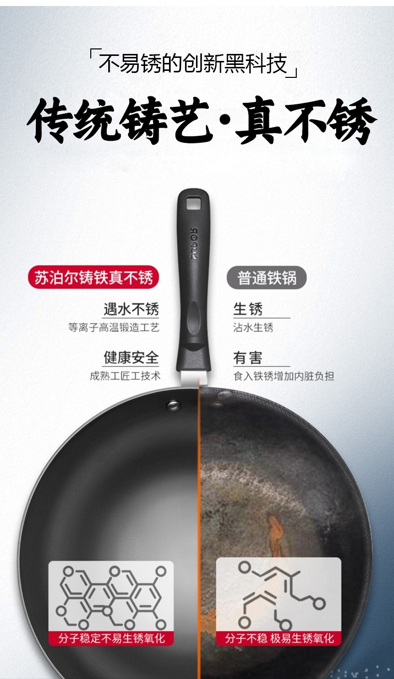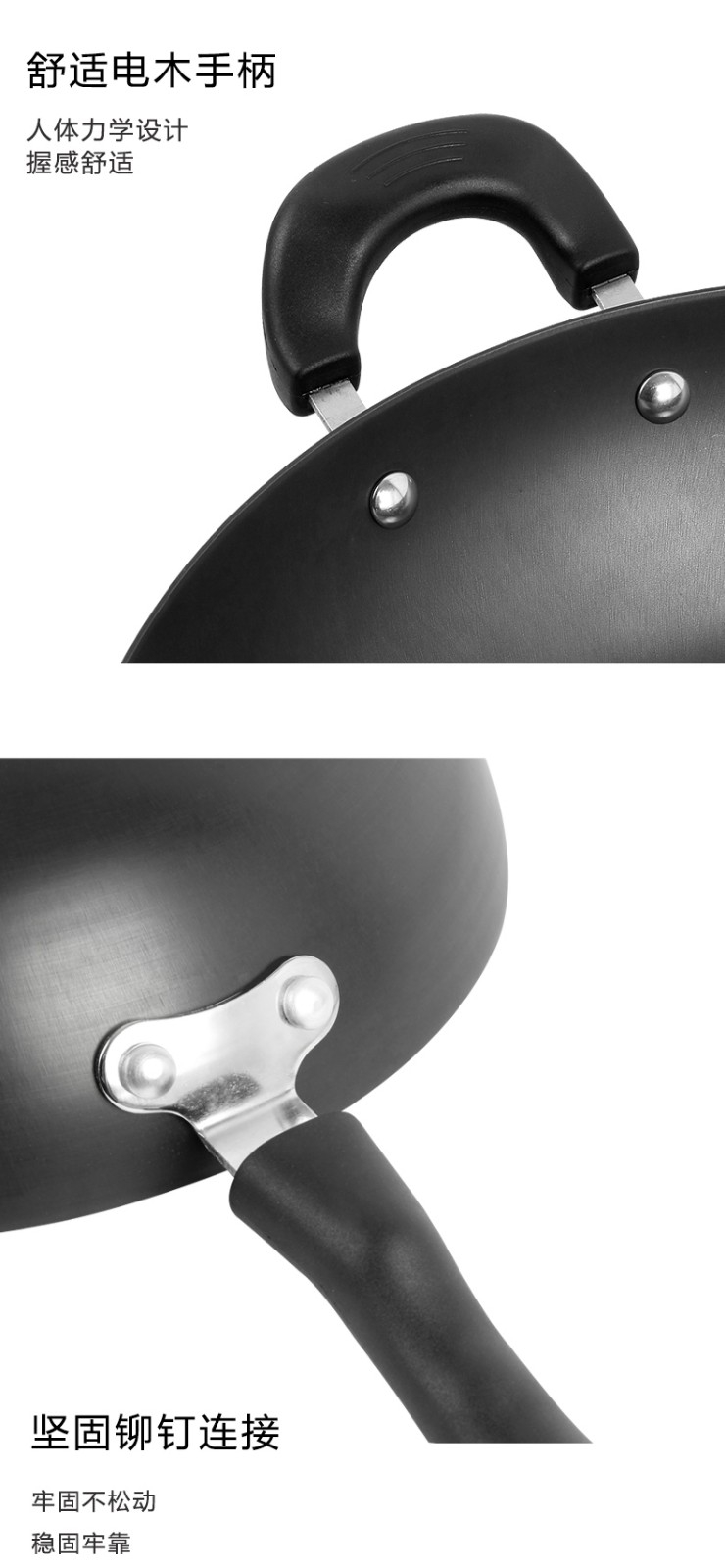 生铁铸造,耐磨防锈,无涂层;锅身一体成型,底厚壁薄,高效导热,不易焦糊;电磁炉燃气通用