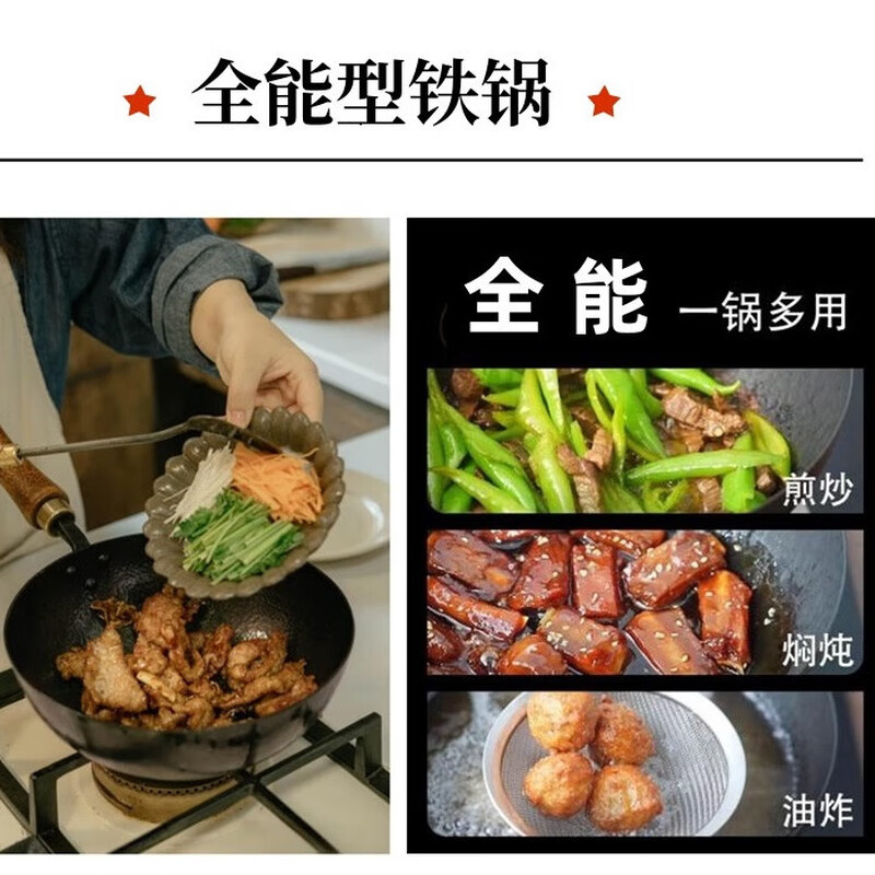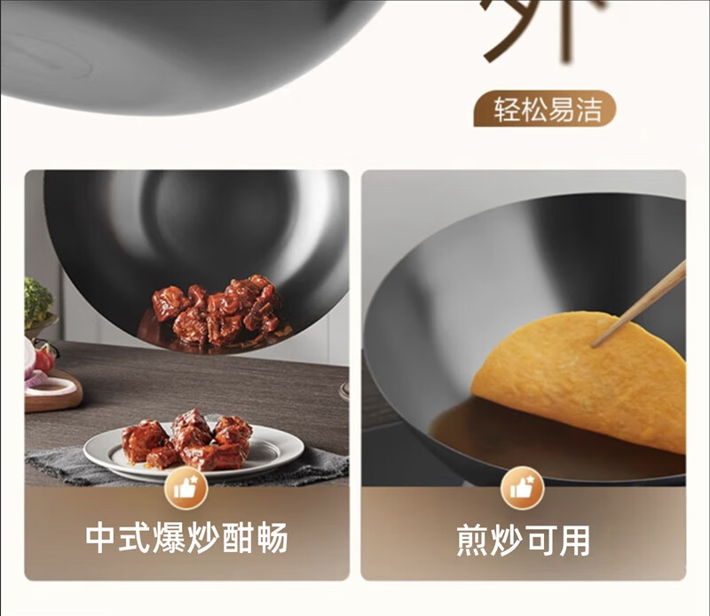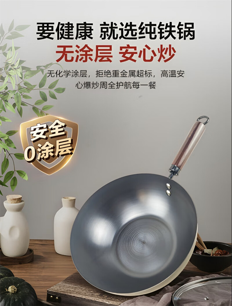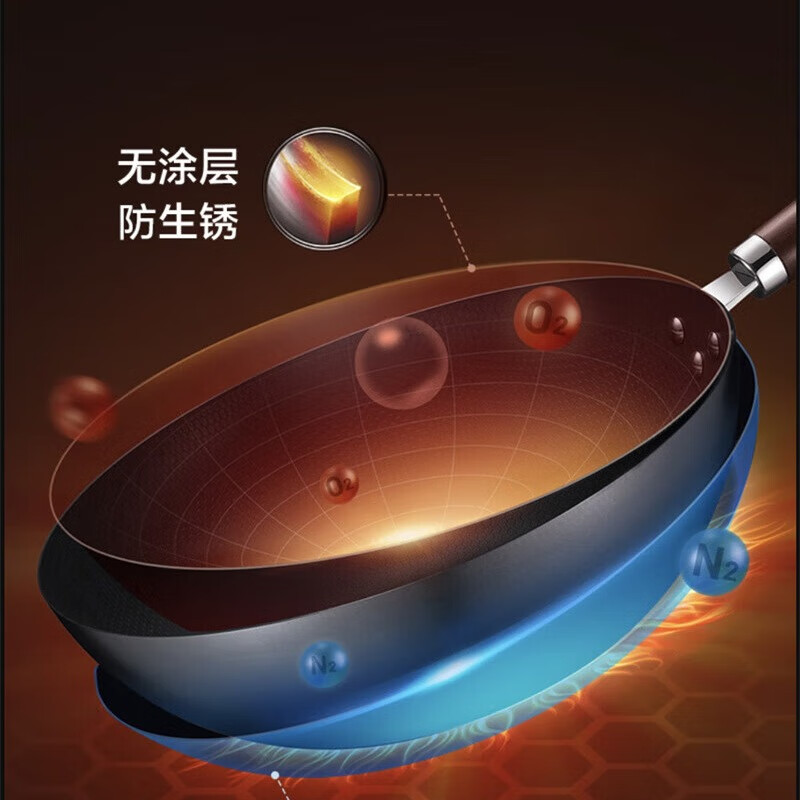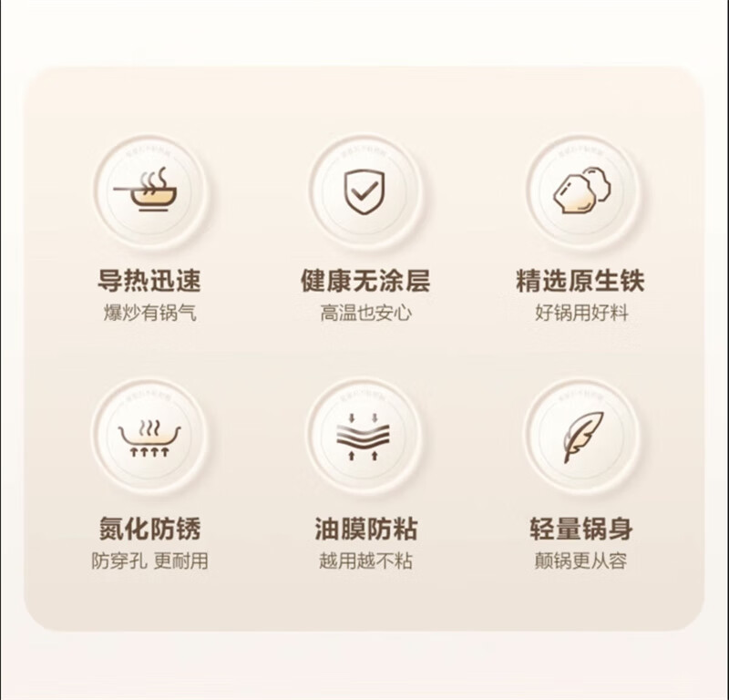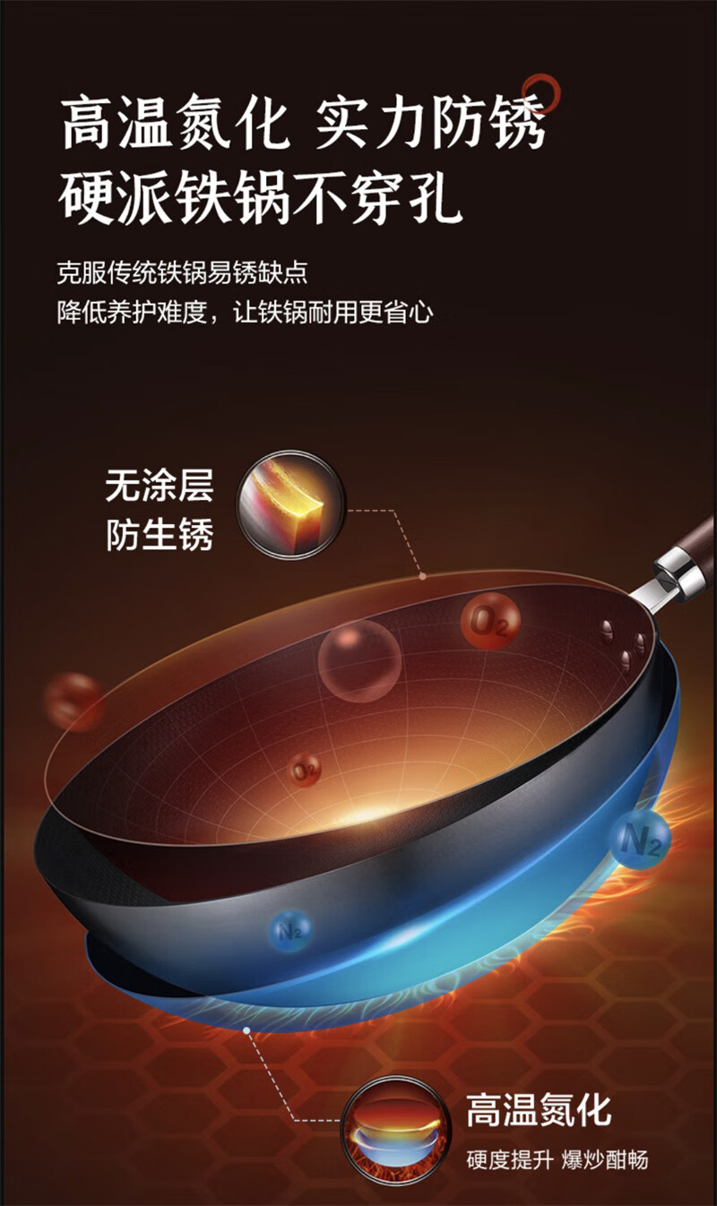 氮化防锈处理,不易生锈更耐用;质铁基材,健康更保证;传热更快速,猛火爆炒更美味