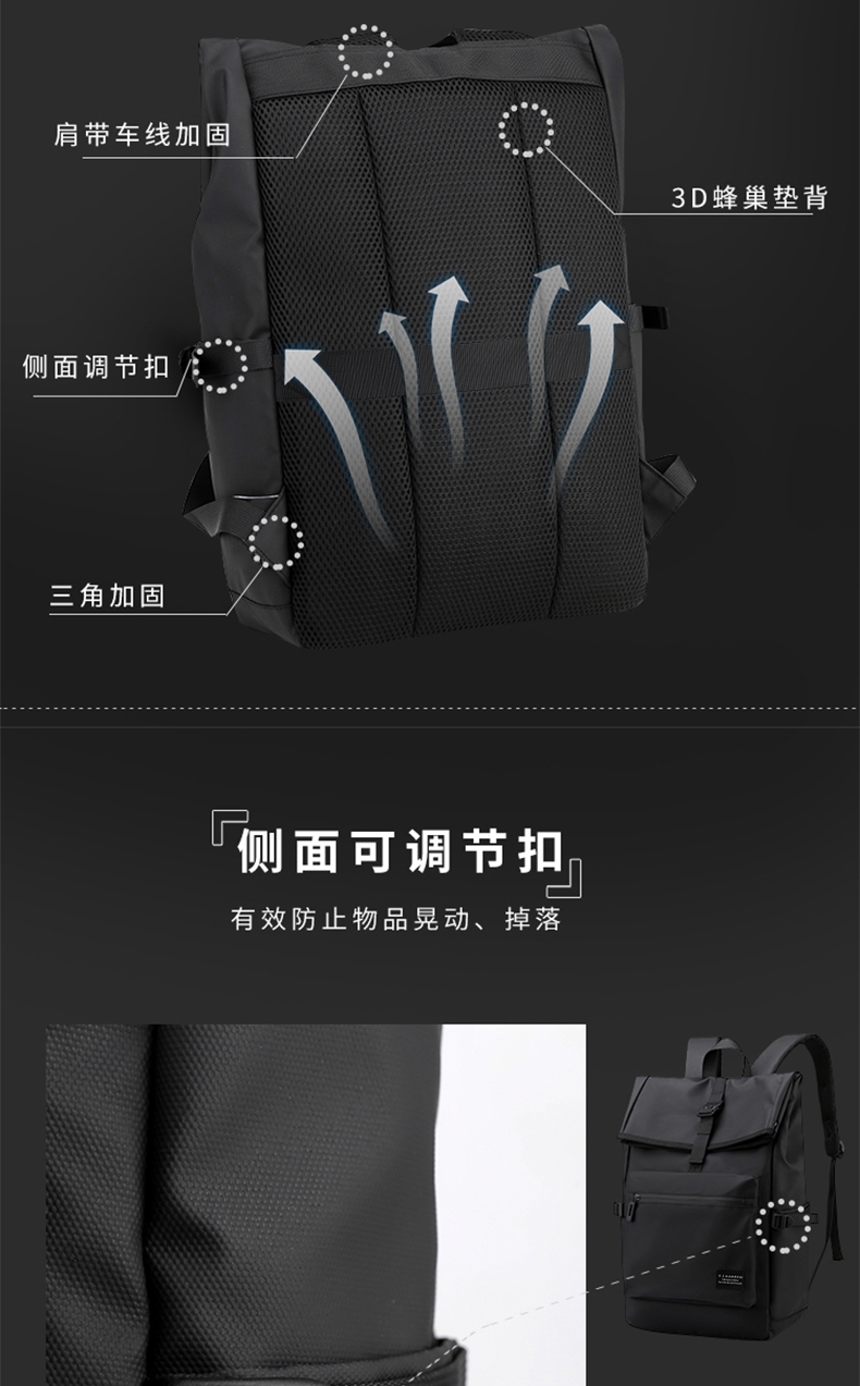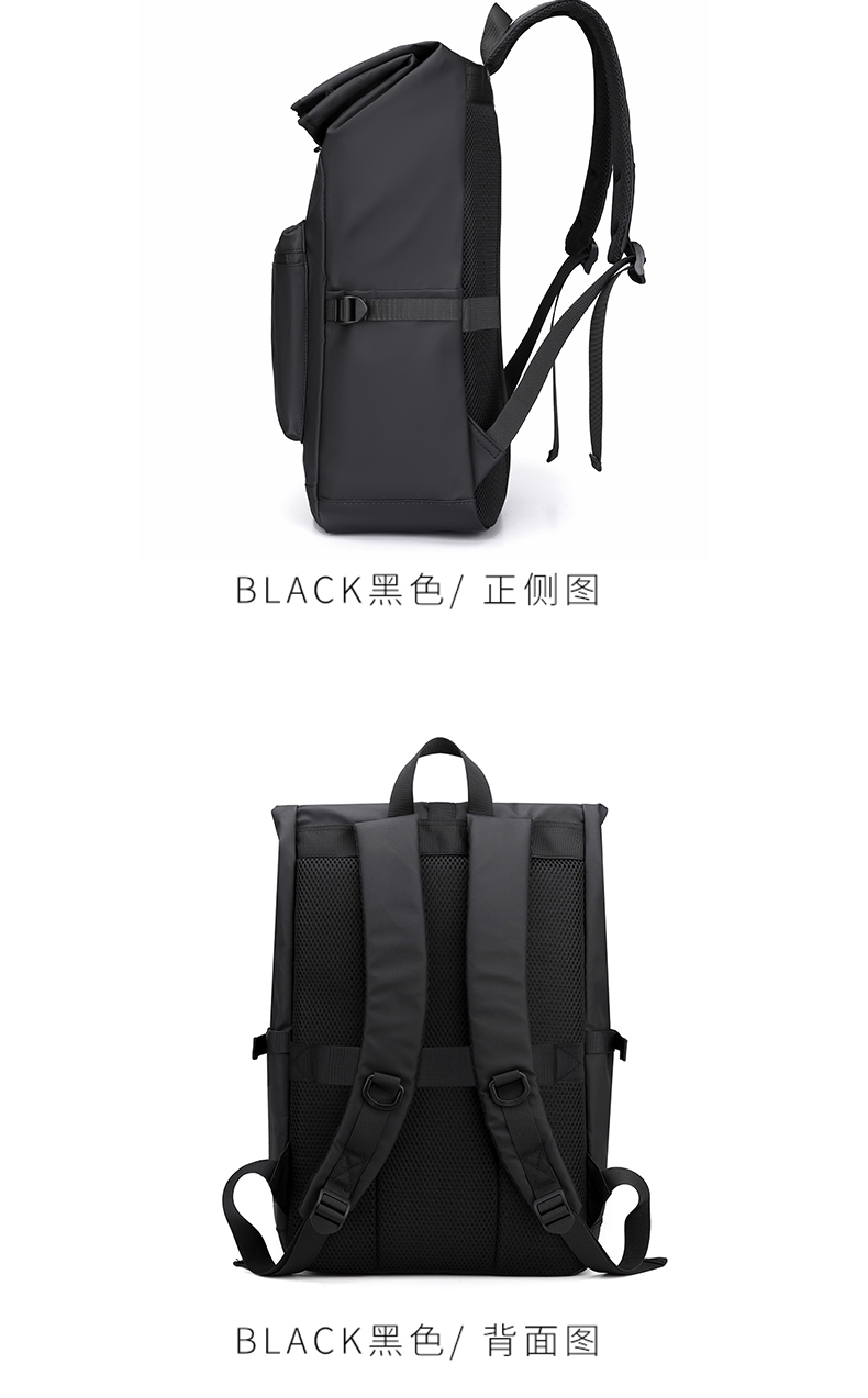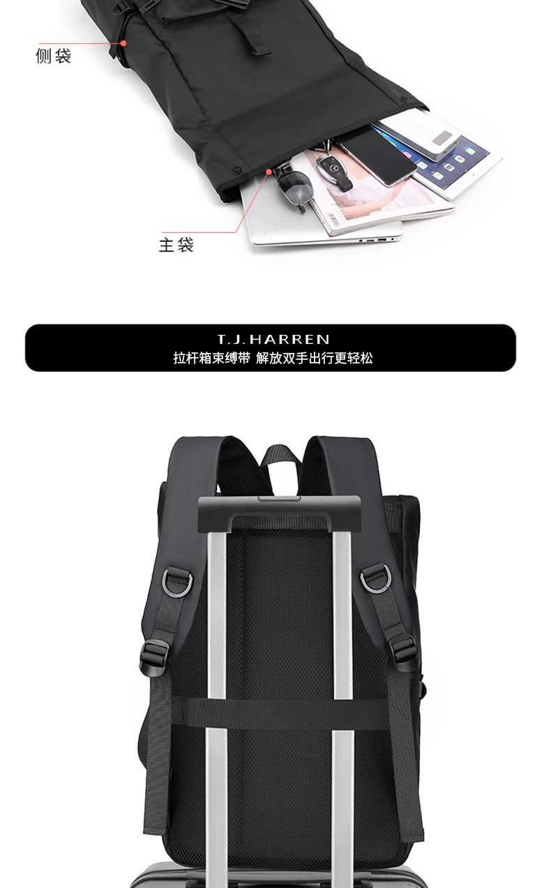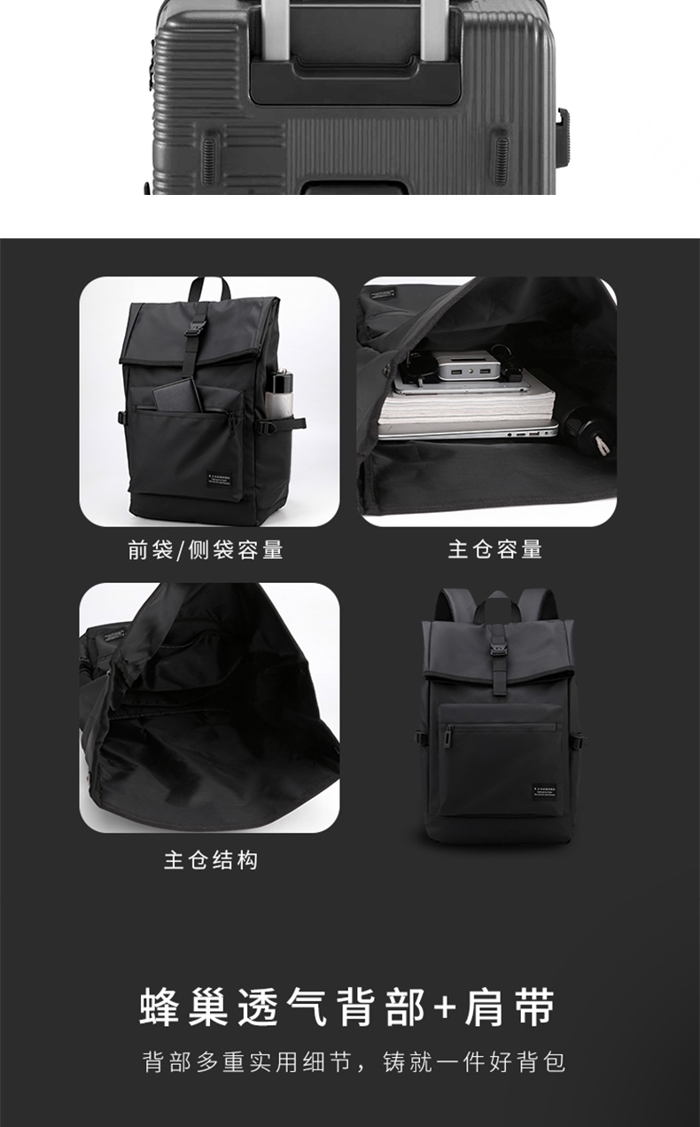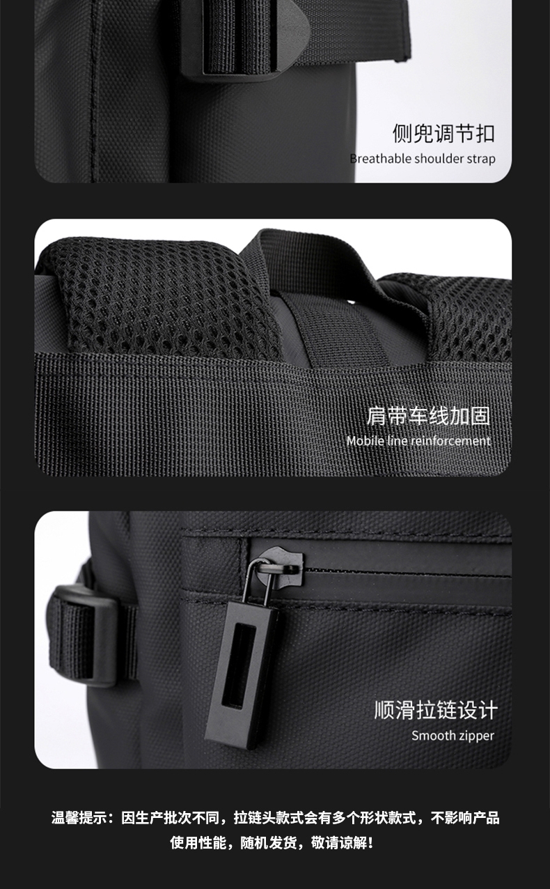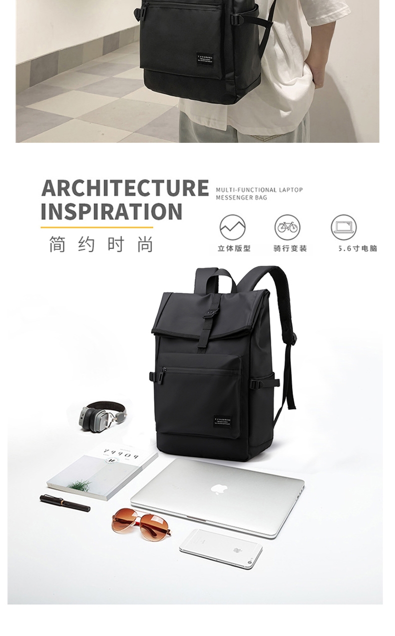 新款多功能设计,时尚大方,旅行休闲商务三用;柔性防水皮膜面料,一擦即干,轻松打理;独立加棉加厚电脑隔层袋,可放置15.6寸电脑