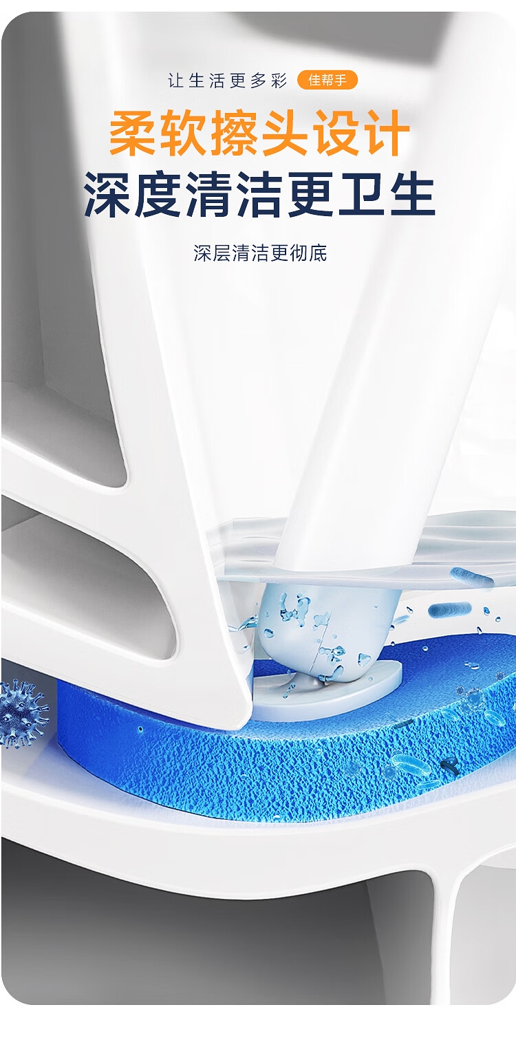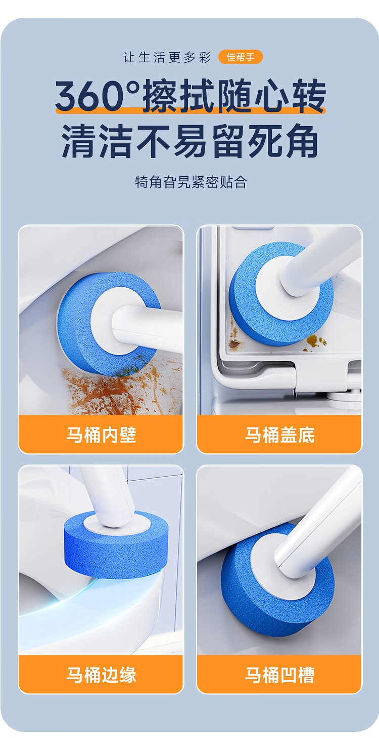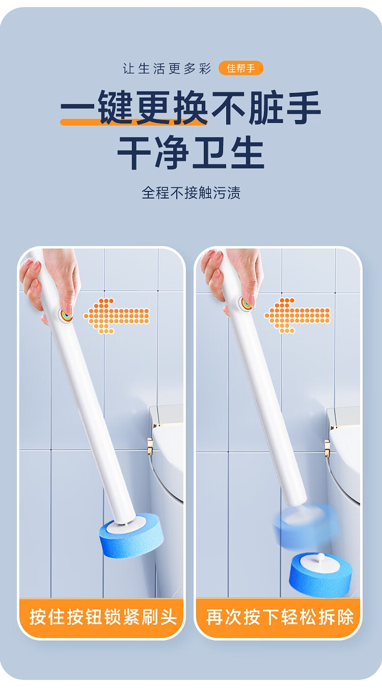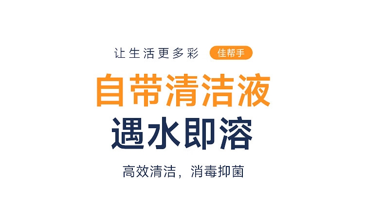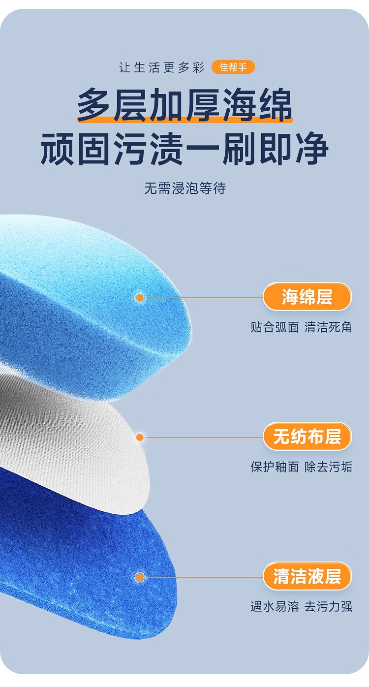 一键更换不脏手,干净卫生;自带清洁液,遇水即溶,高效清洁,消毒抑菌;多层加厚海绵,顽固污渍一刷即净