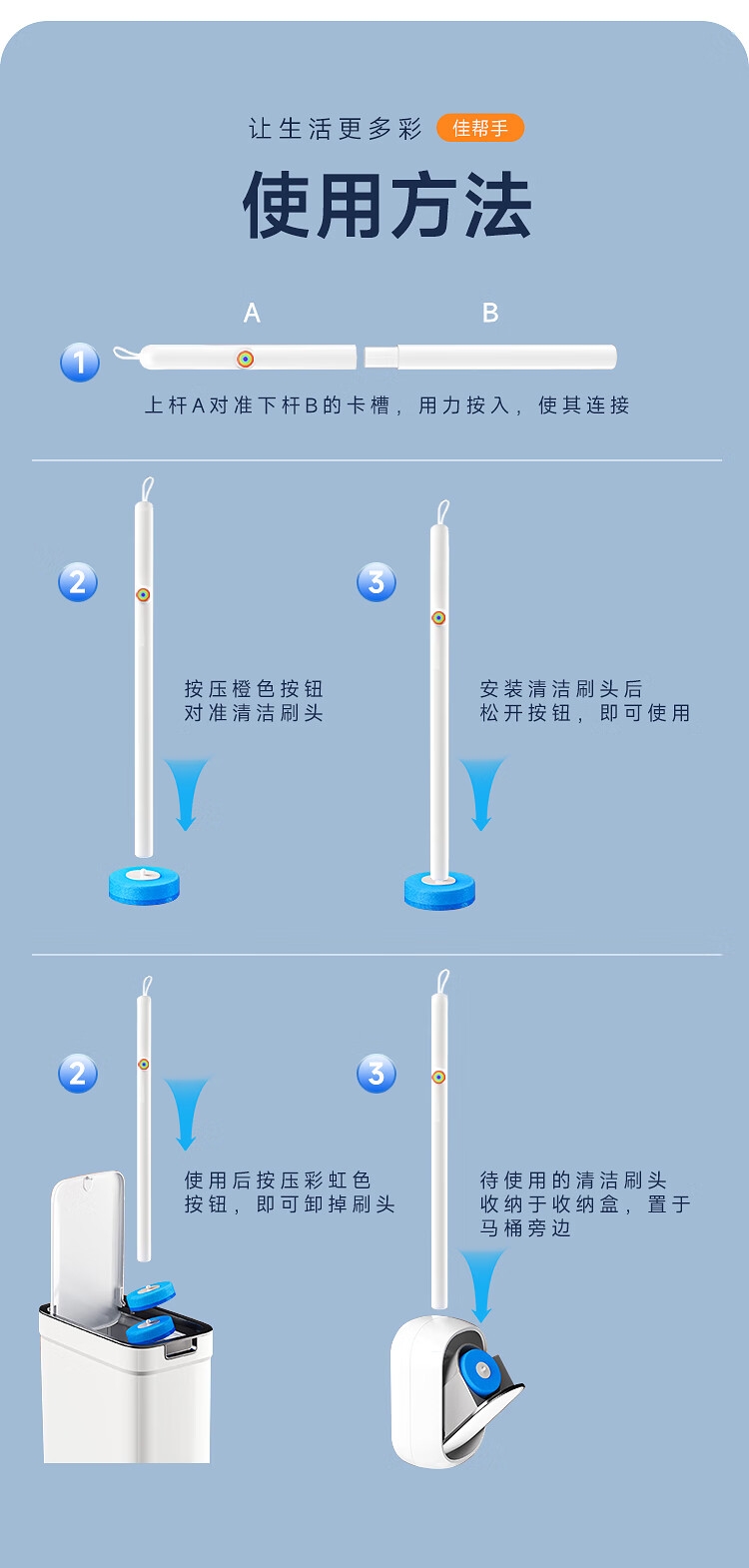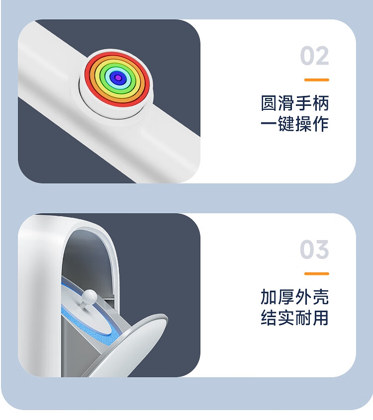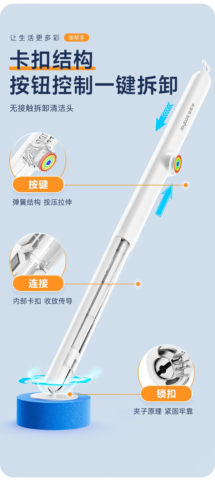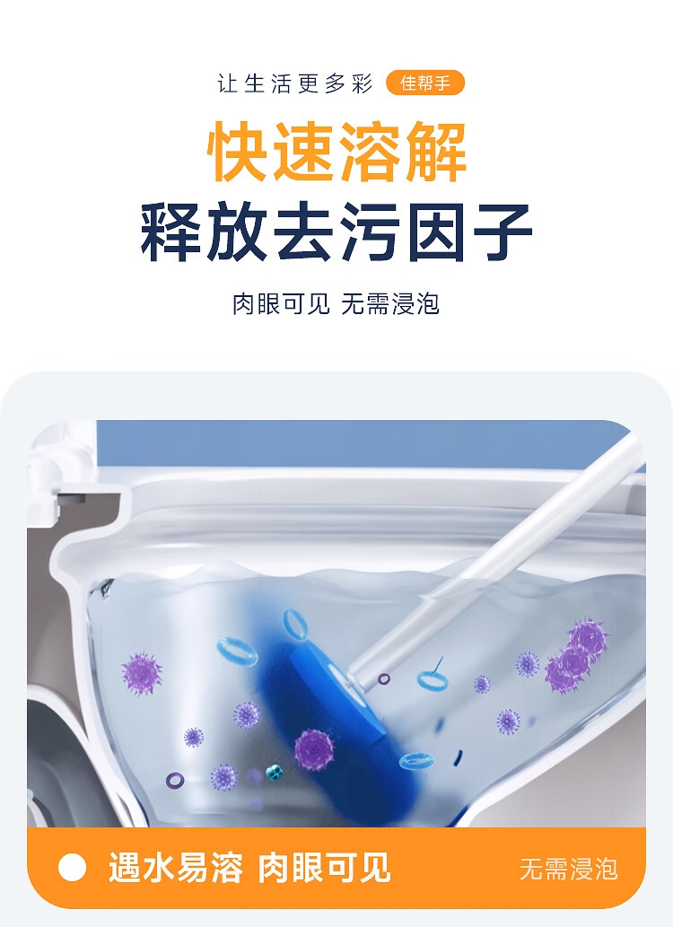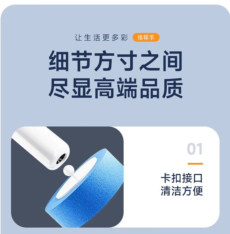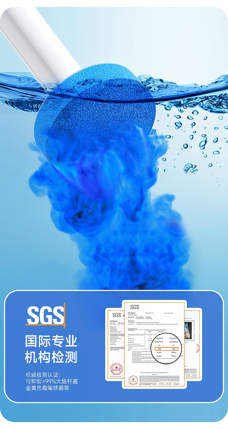 一键更换不脏手,干净卫生;自带清洁液,遇水即溶,高效清洁,消毒抑菌;多层加厚海绵,顽固污渍一刷即净