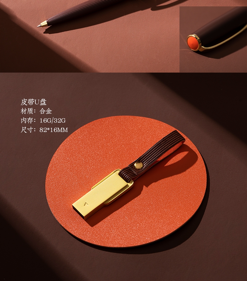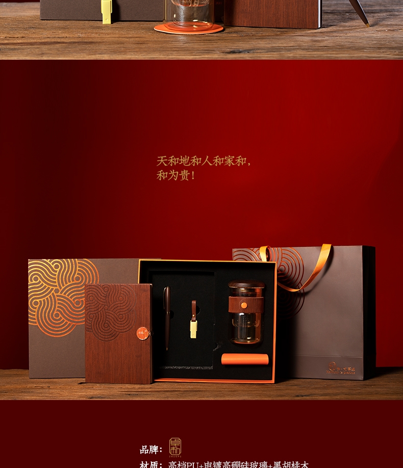 尺寸:同心杯350ml 记事本145*215mm 签字笔12.5*138mm U盘32G 皮质杯垫直径100mm