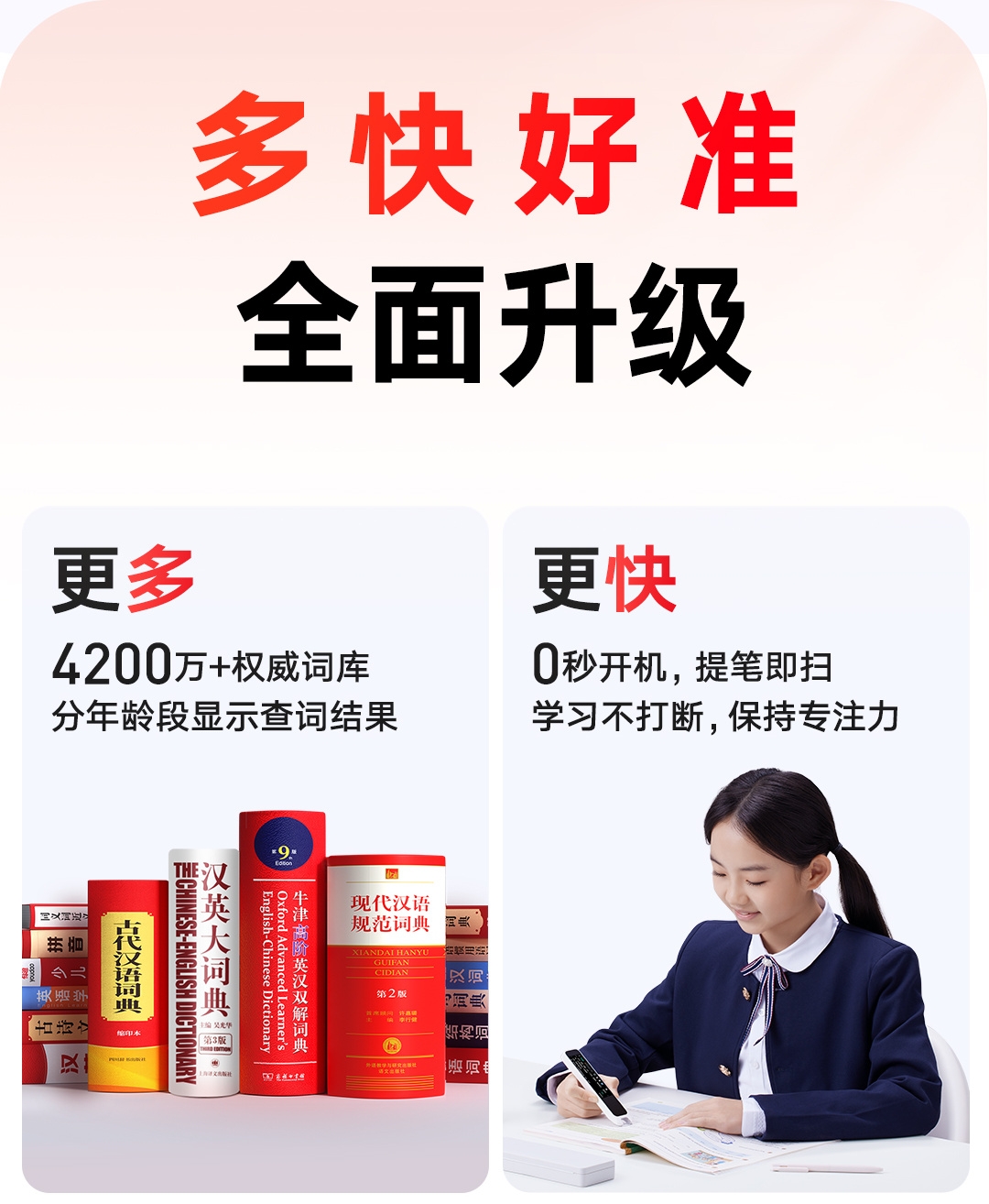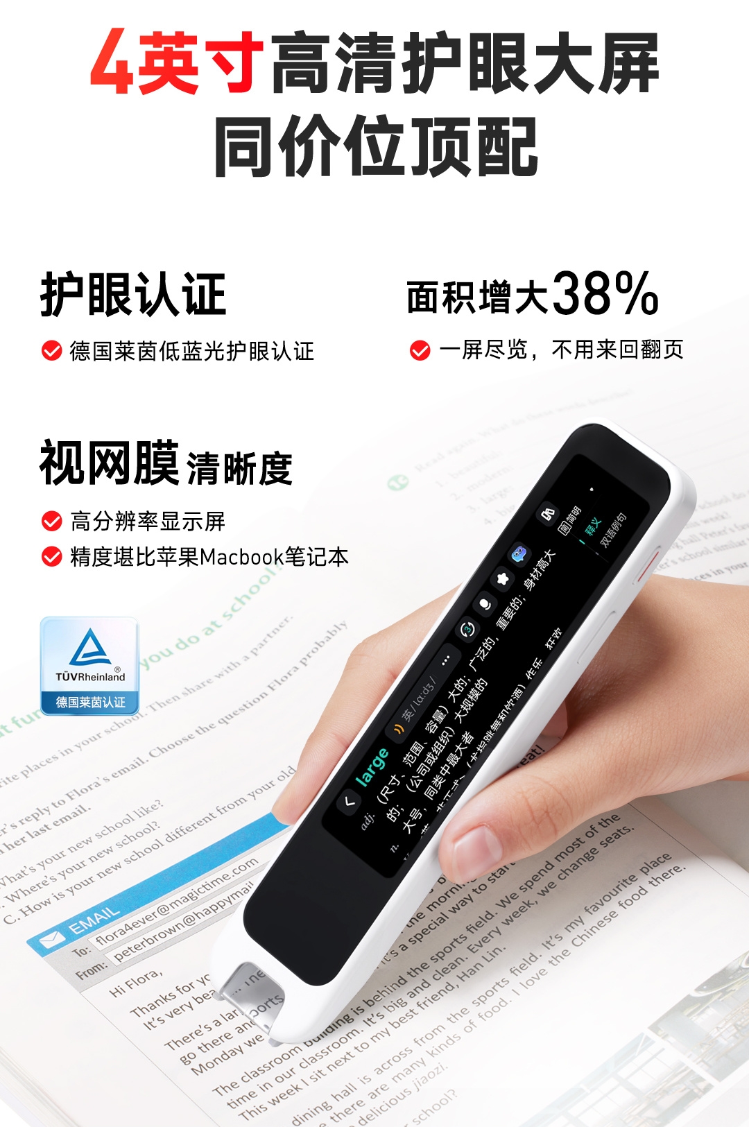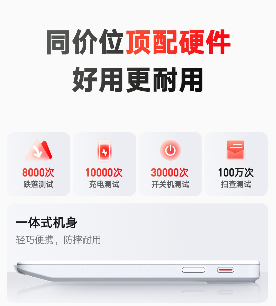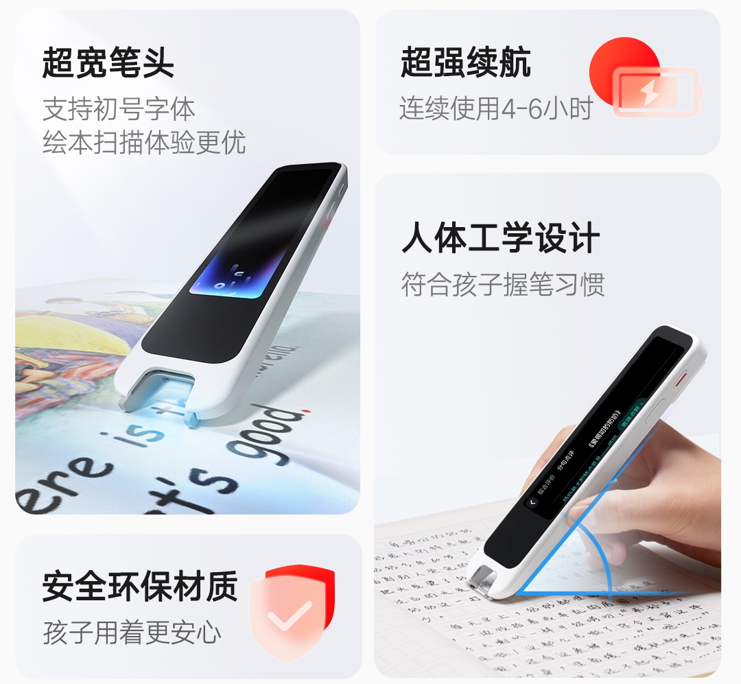 一体式机身,轻巧便携,防摔耐用;超宽笔头,支持初号字体,绘本扫描体验更优;安全环保材质,孩子用着更安心
