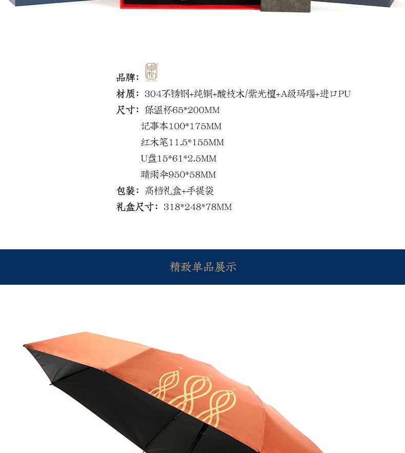尺寸:晴雨伞950*58mm 保温杯65*200mm 记事本100*175mm 红木笔11.5*155mm U盘15*61*2.5mm