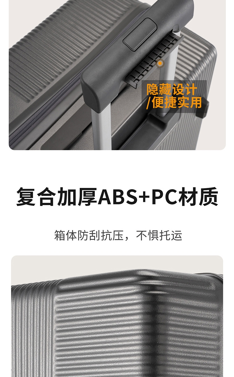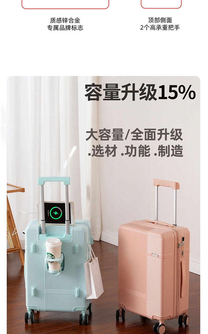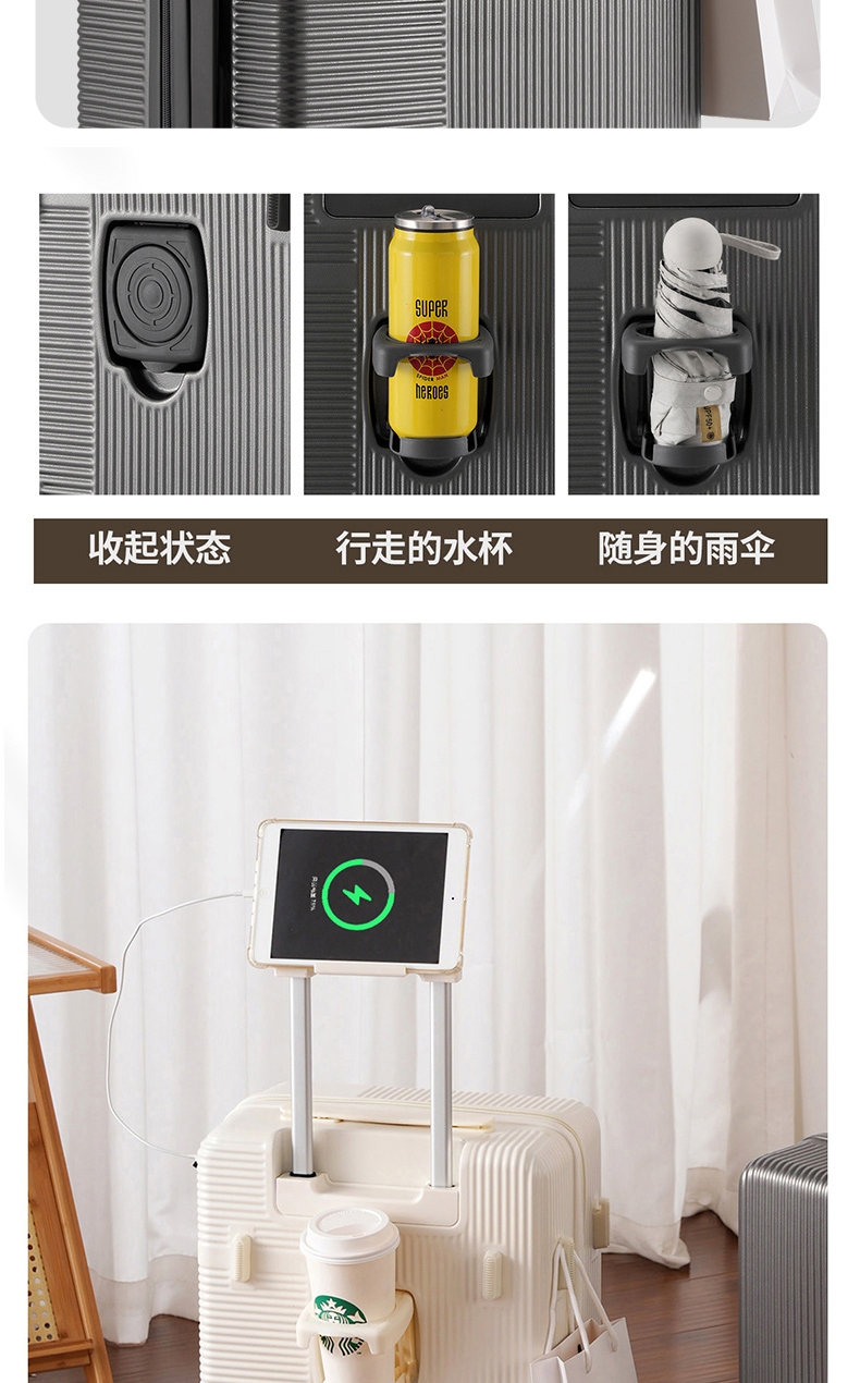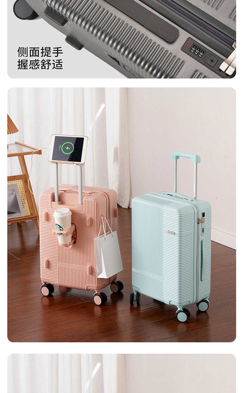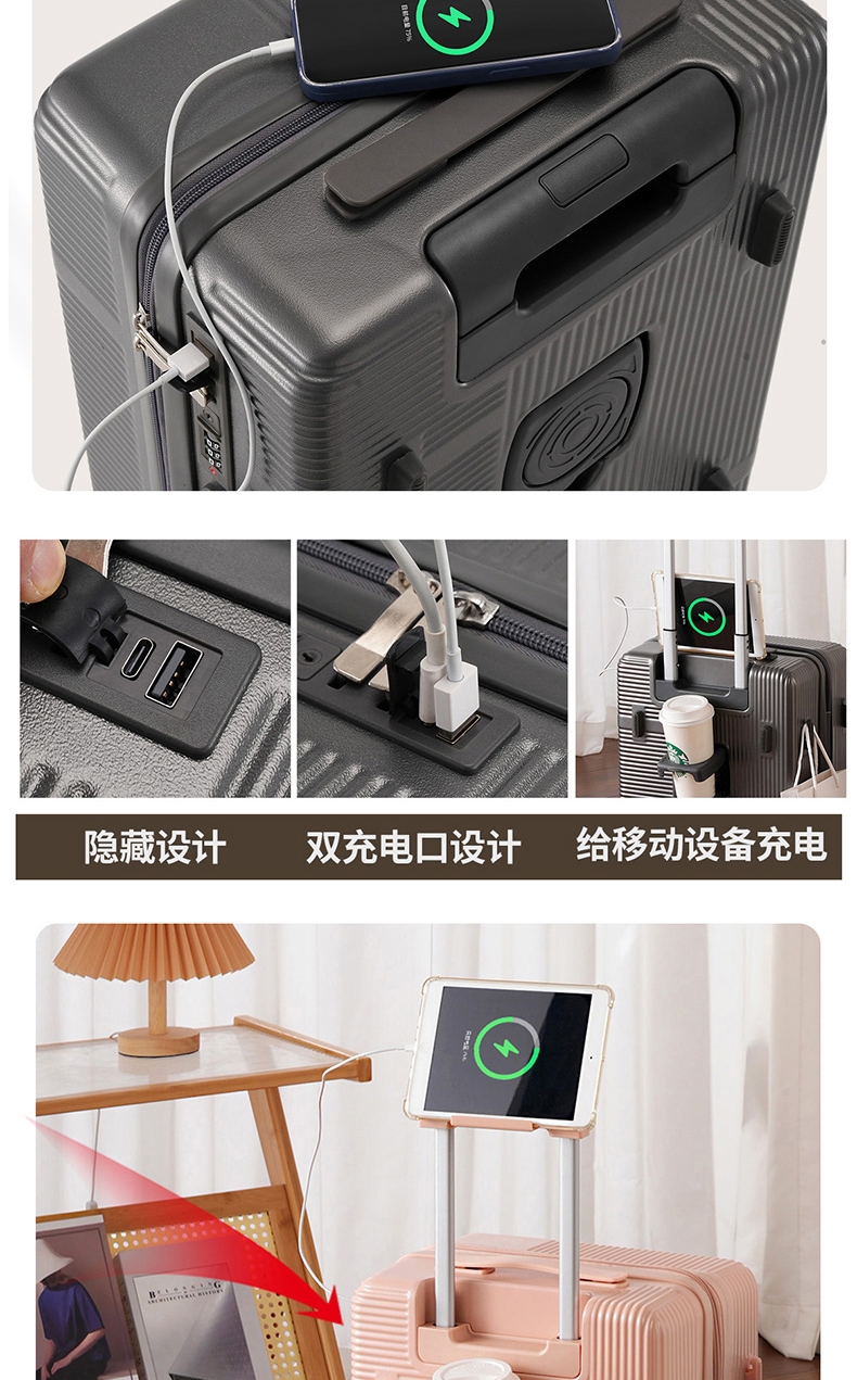 带顶部和侧部提手,竖提横提都方便;侧部4个顶脚带方便行李挂架功能;底部带4个承重防磨顶脚,取放行李无惧剐蹭箱体;带USB及Type-C充电口,同时配置移动电源内袋