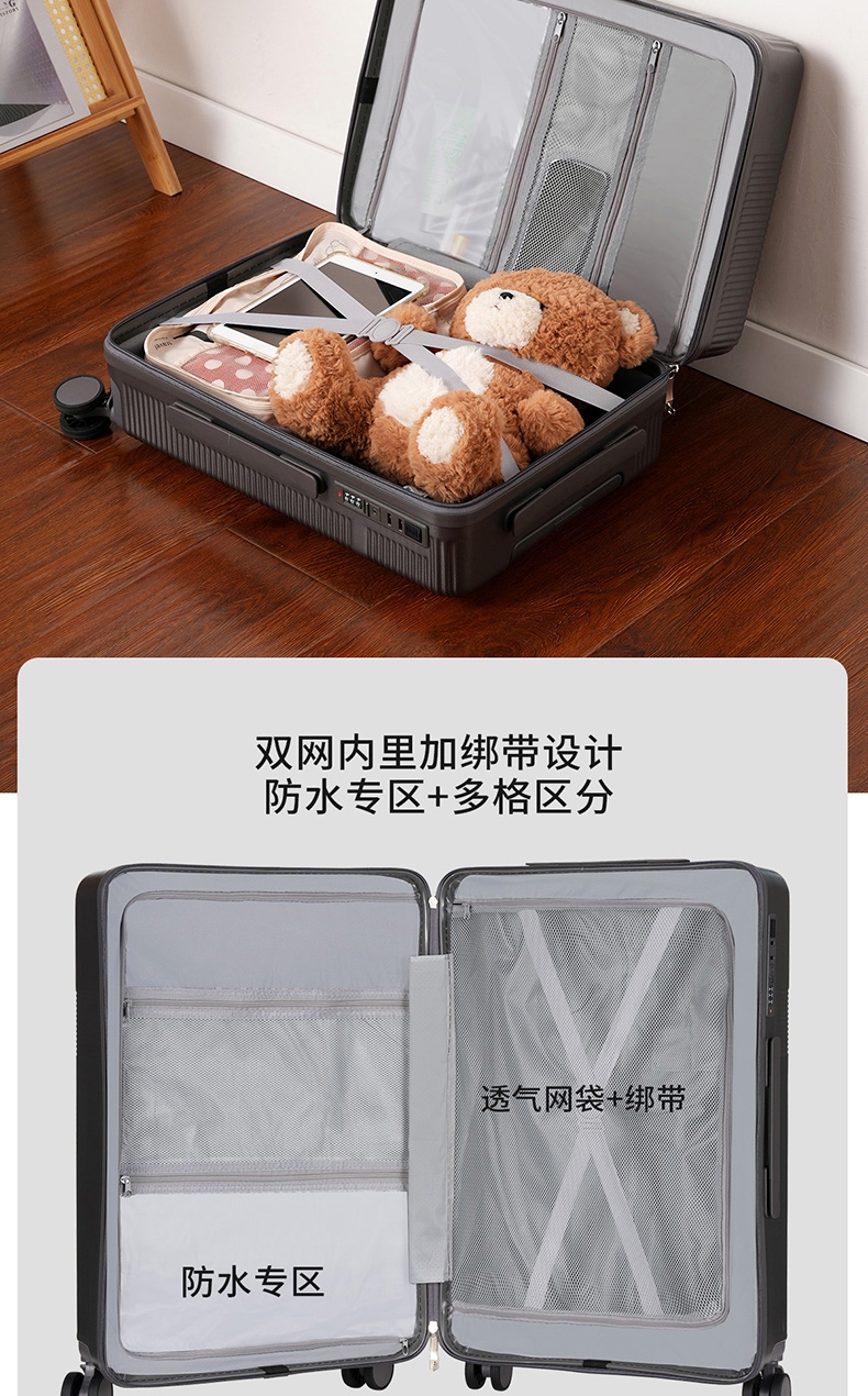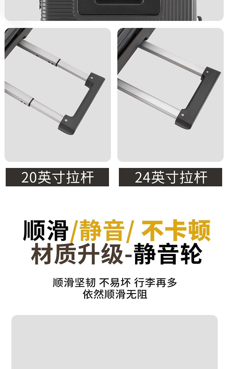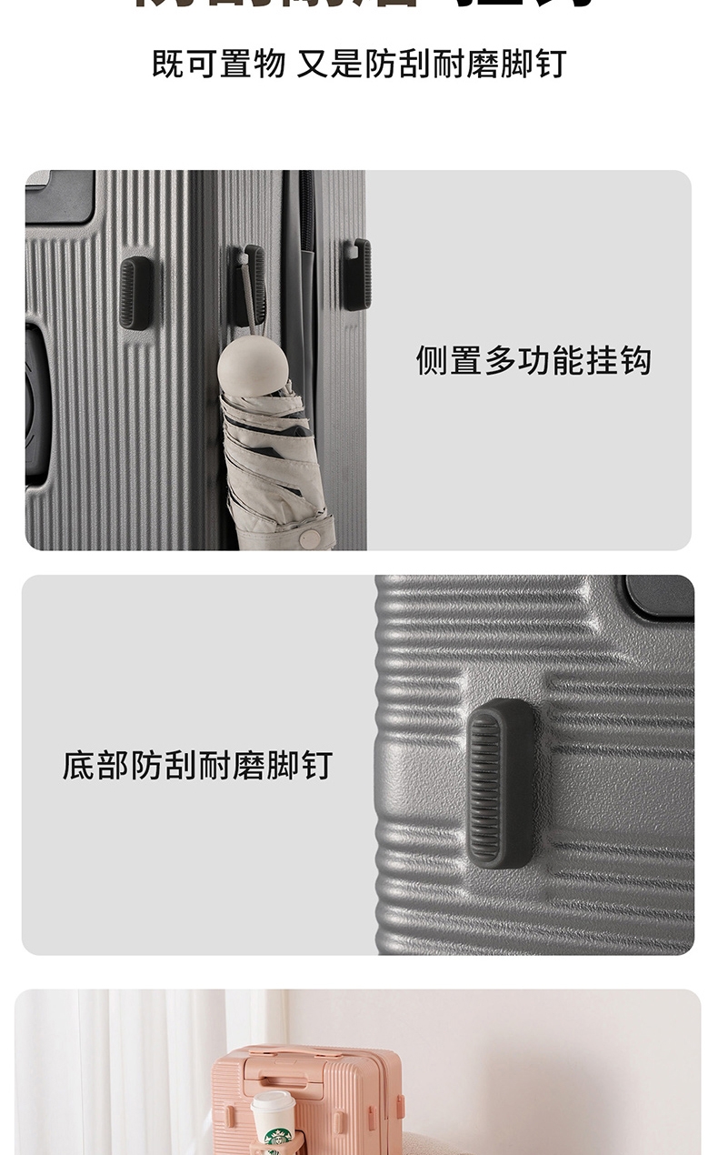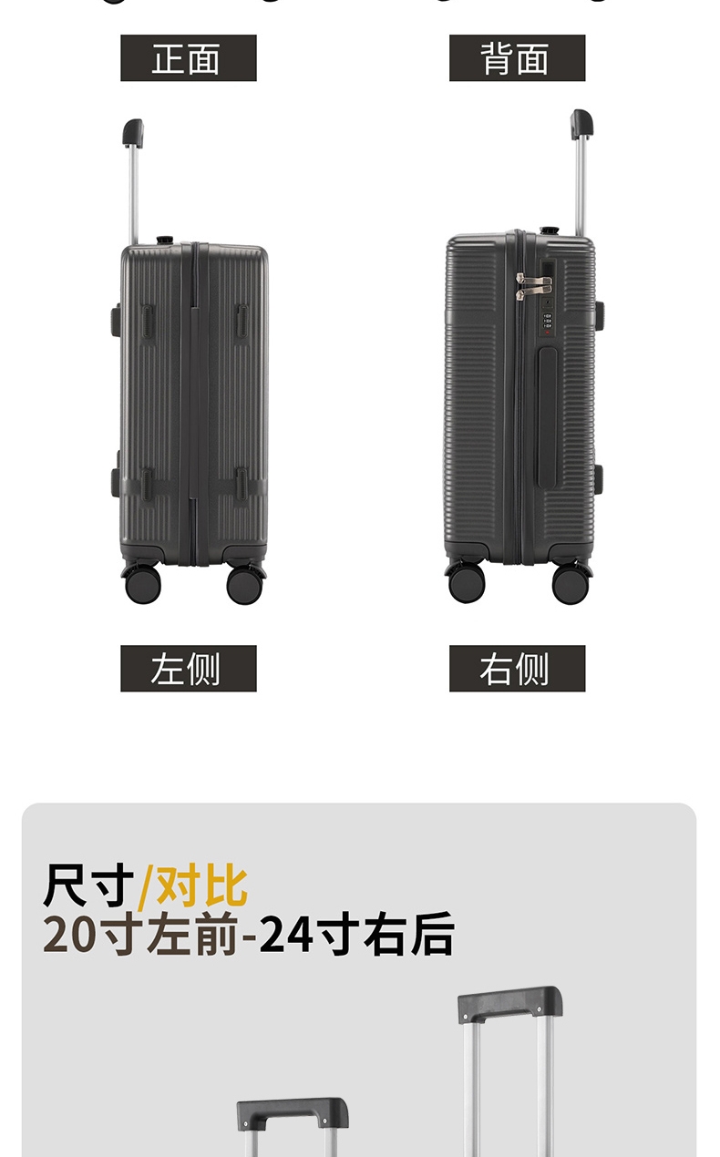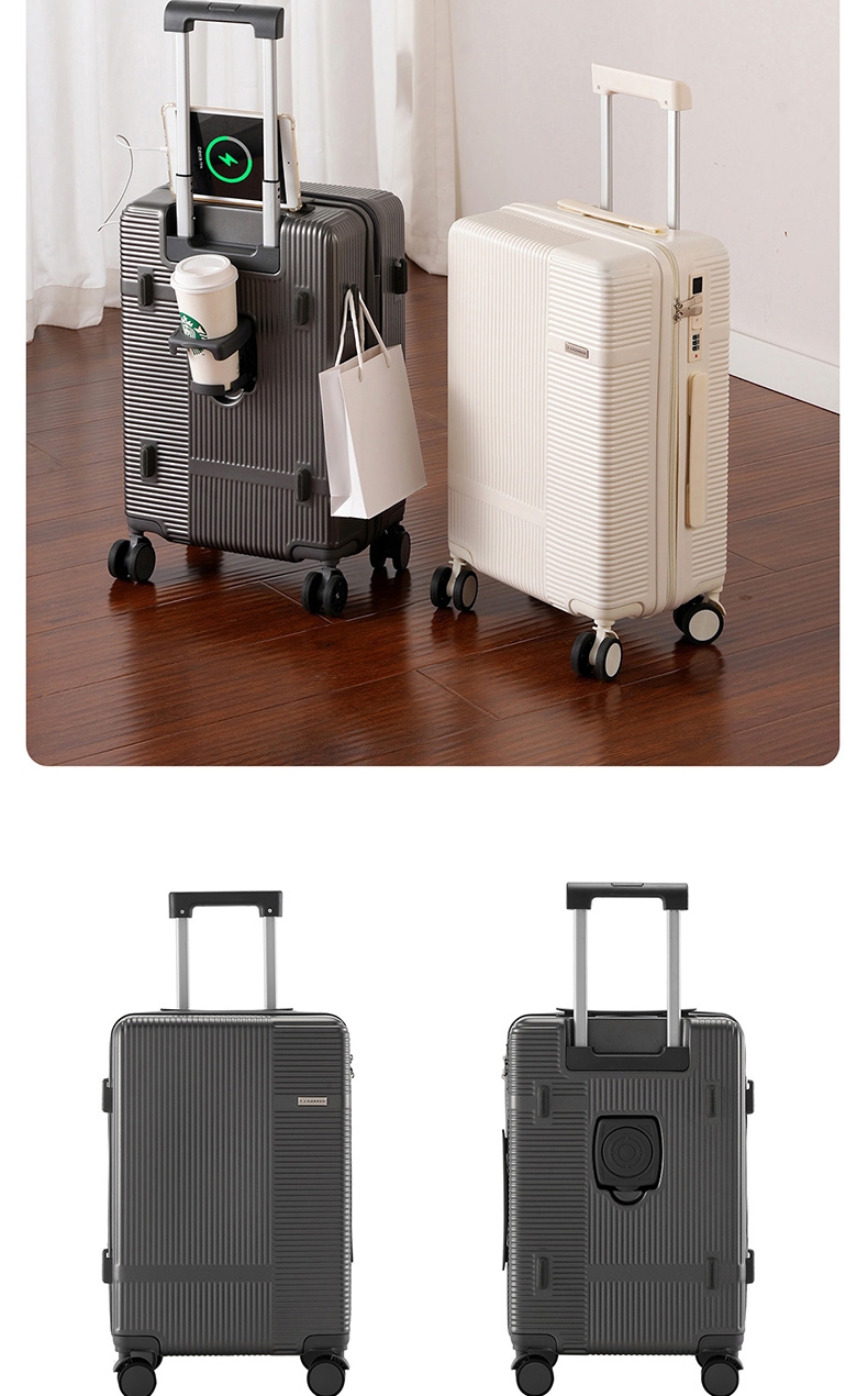 带顶部和侧部提手,竖提横提都方便;侧部4个顶脚带方便行李挂架功能;底部带4个承重防磨顶脚,取放行李无惧剐蹭箱体;带USB及Type-C充电口,同时配置移动电源内袋