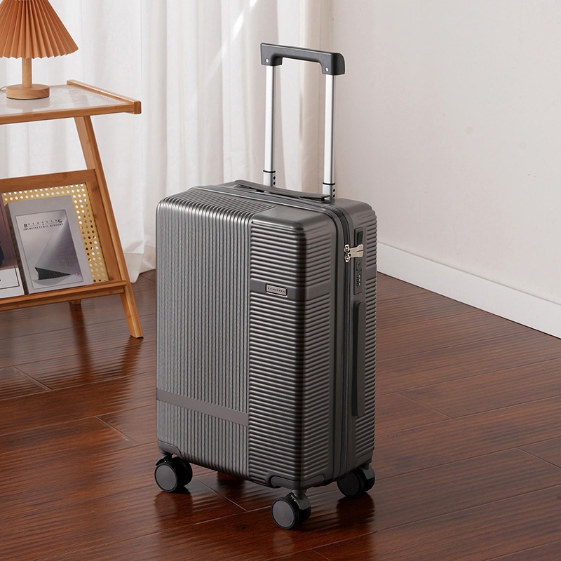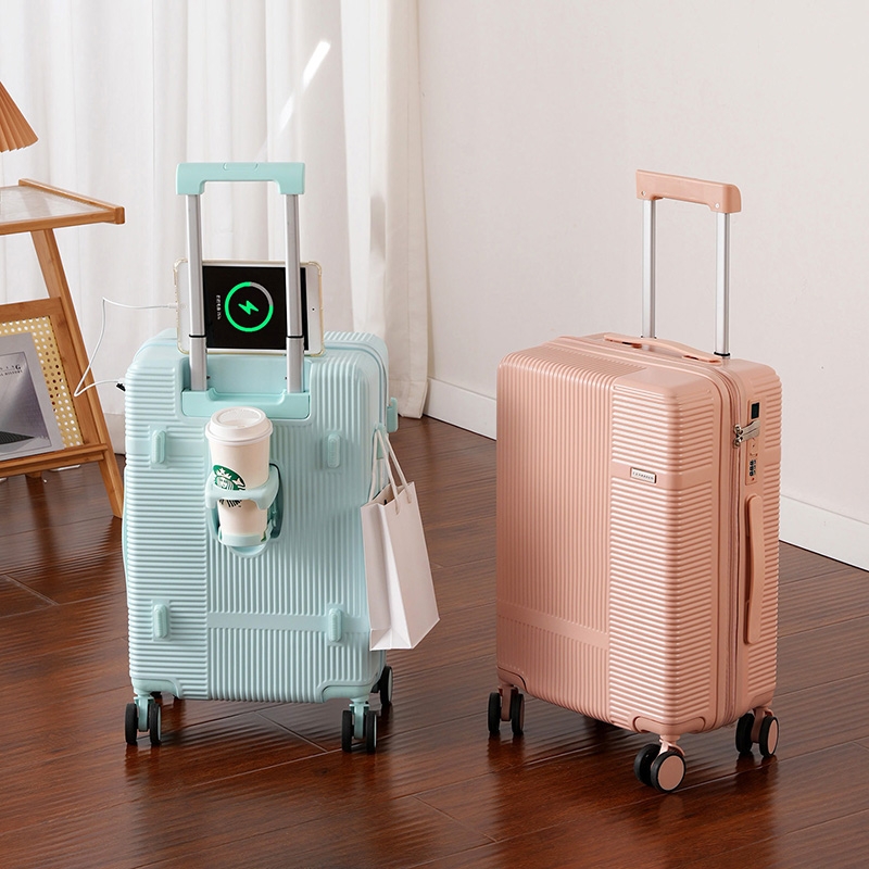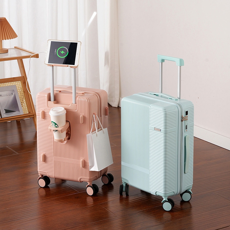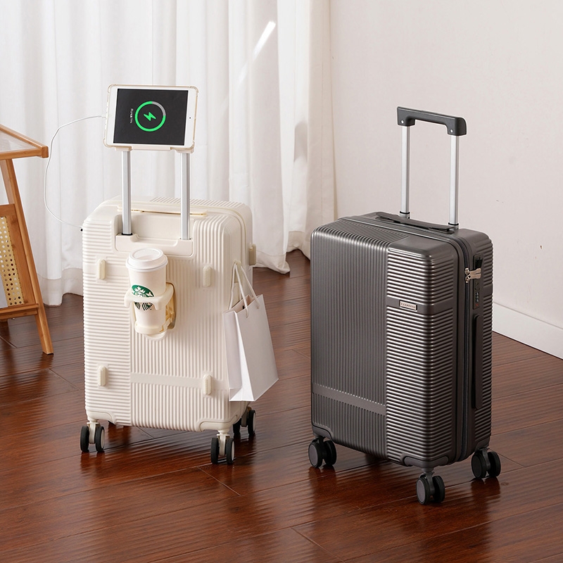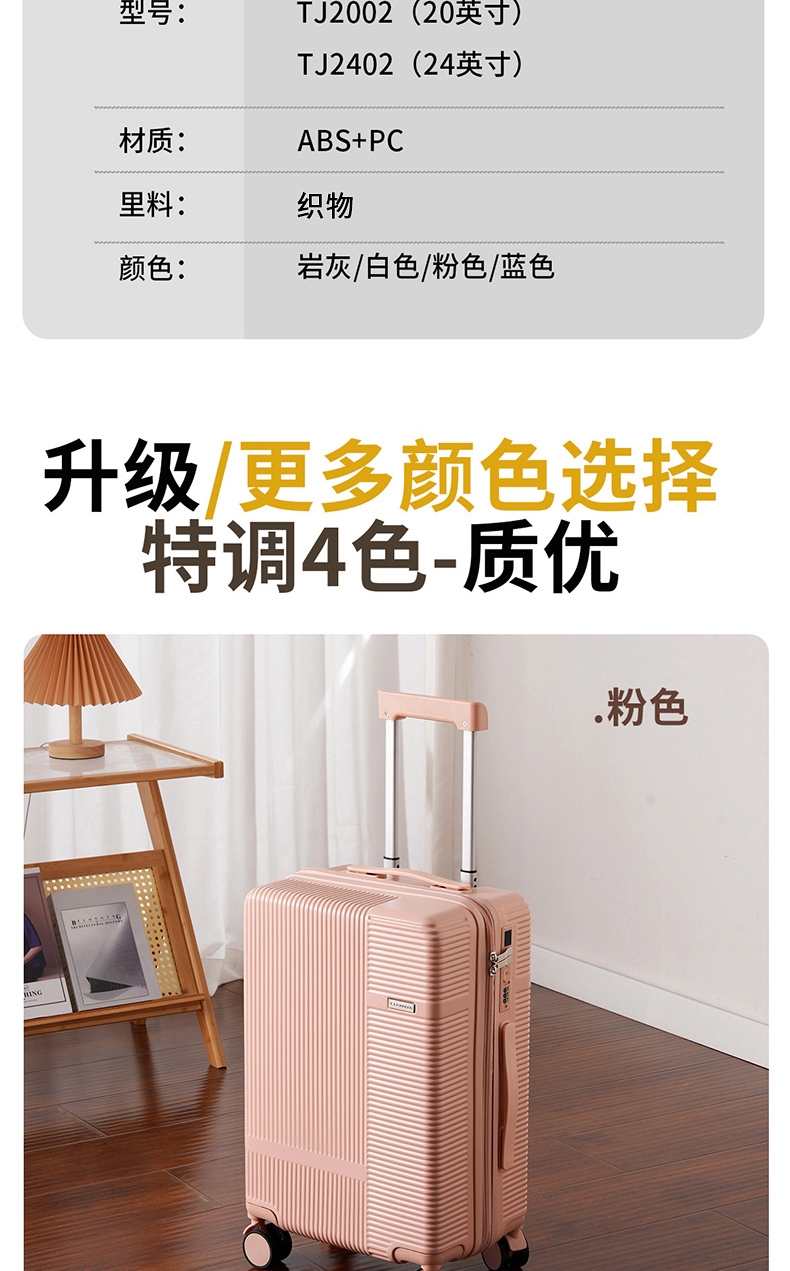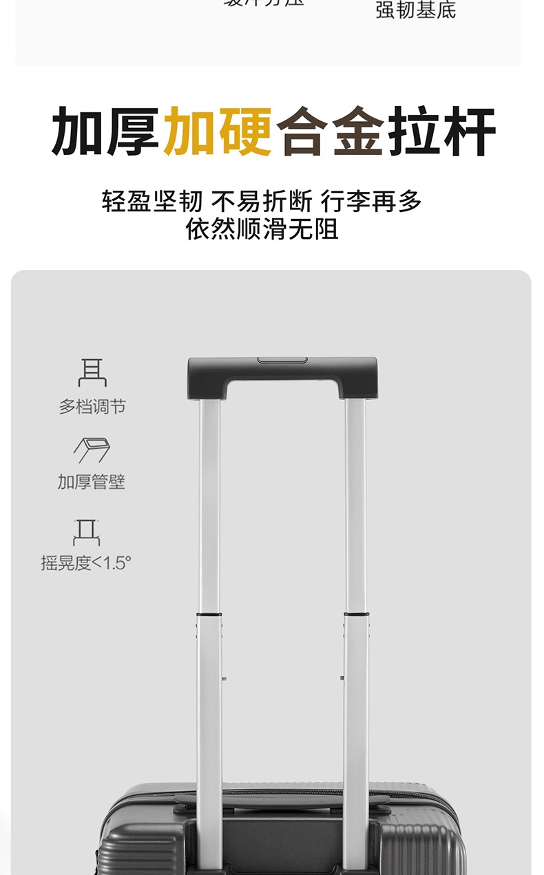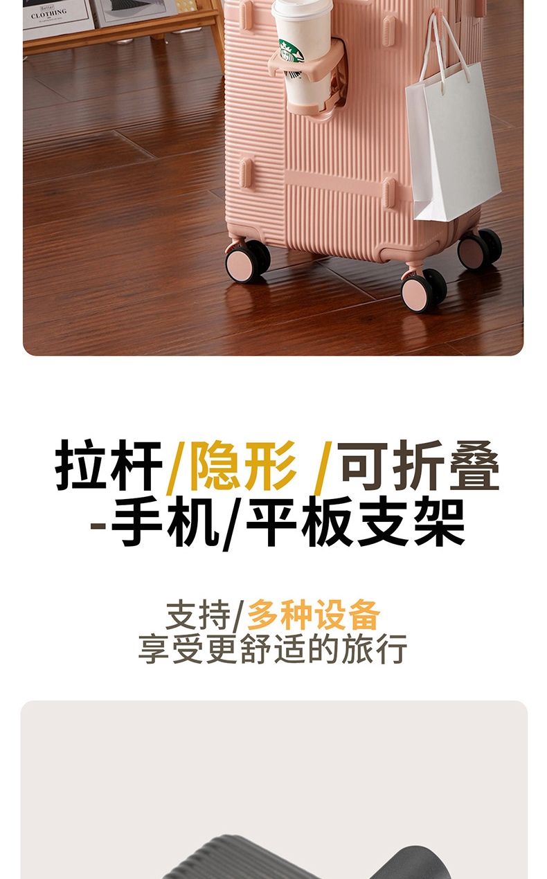 带顶部和侧部提手,竖提横提都方便;侧部4个顶脚带方便行李挂架功能;底部带4个承重防磨顶脚,取放行李无惧剐蹭箱体;带USB及Type-C充电口,同时配置移动电源内袋