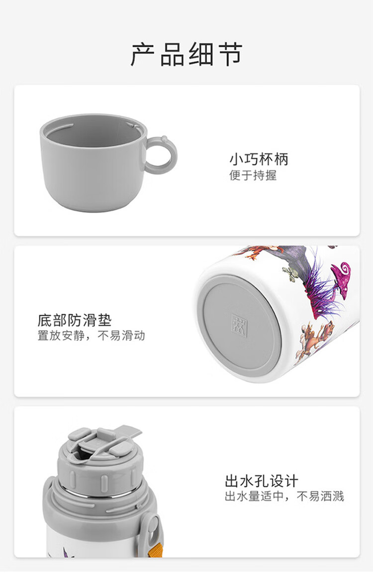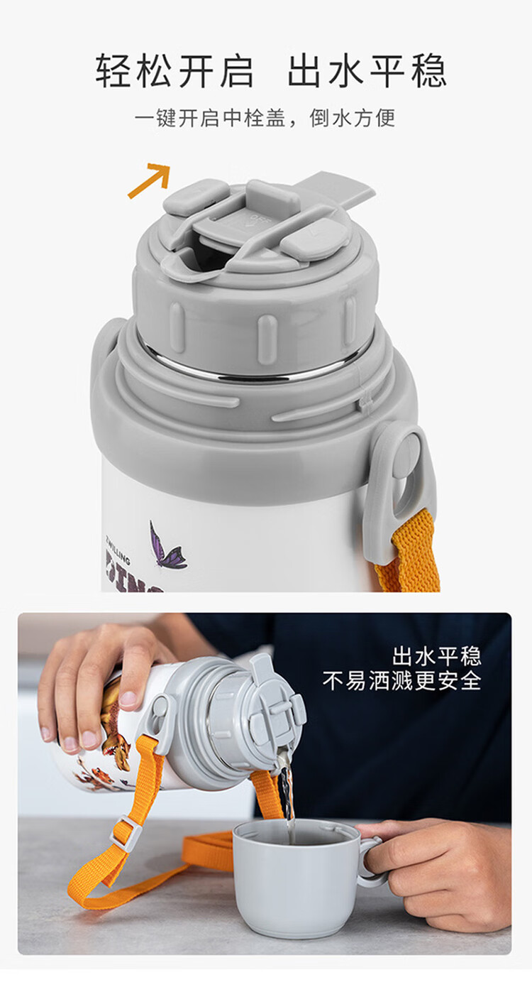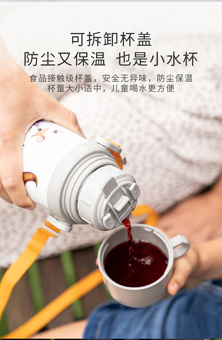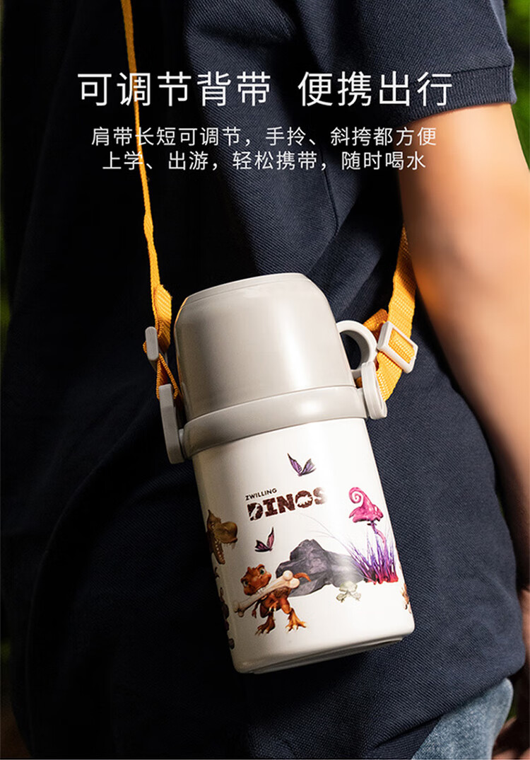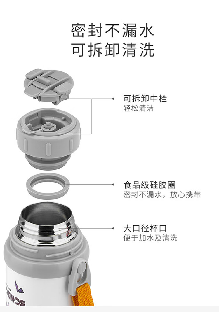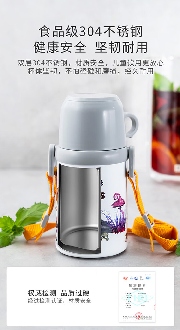 杯身选用优质不锈钢,双层结构,保温更持久,坚固耐用;不锈钢为奥氏体不锈钢。杯盖及内盖塑料为PP材质;背带设计,使用安全,携带方便,条纹外观,活泼可爱