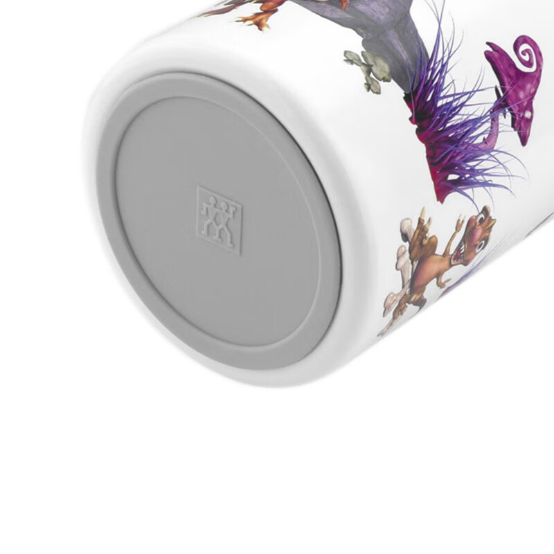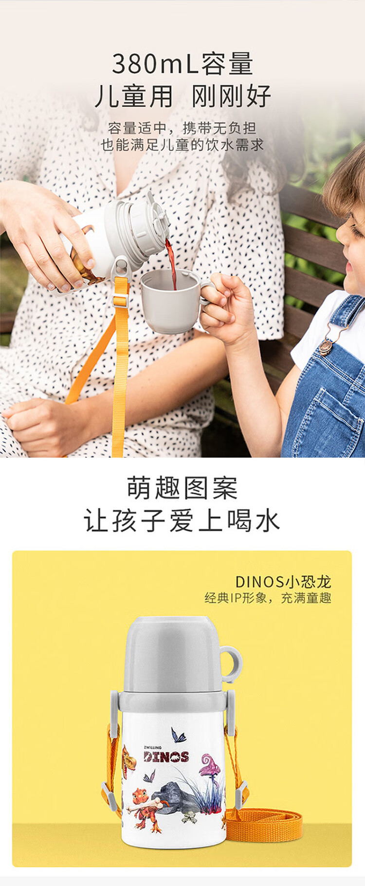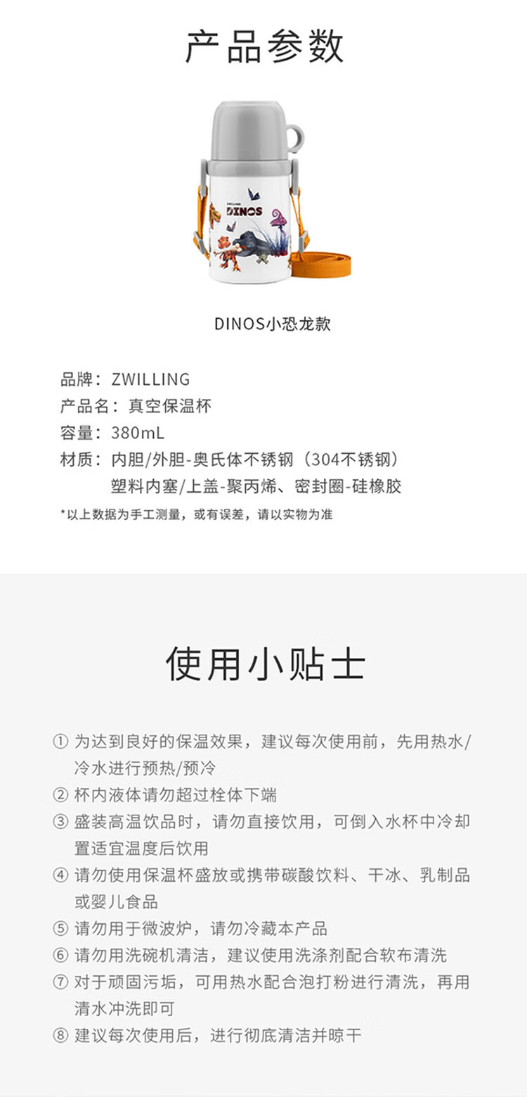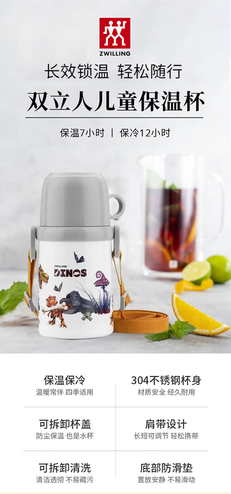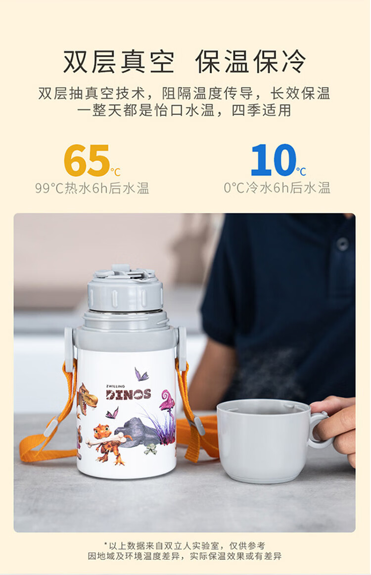 杯身选用优质不锈钢,双层结构,保温更持久,坚固耐用;不锈钢为奥氏体不锈钢。杯盖及内盖塑料为PP材质;背带设计,使用安全,携带方便,条纹外观,活泼可爱