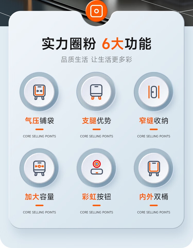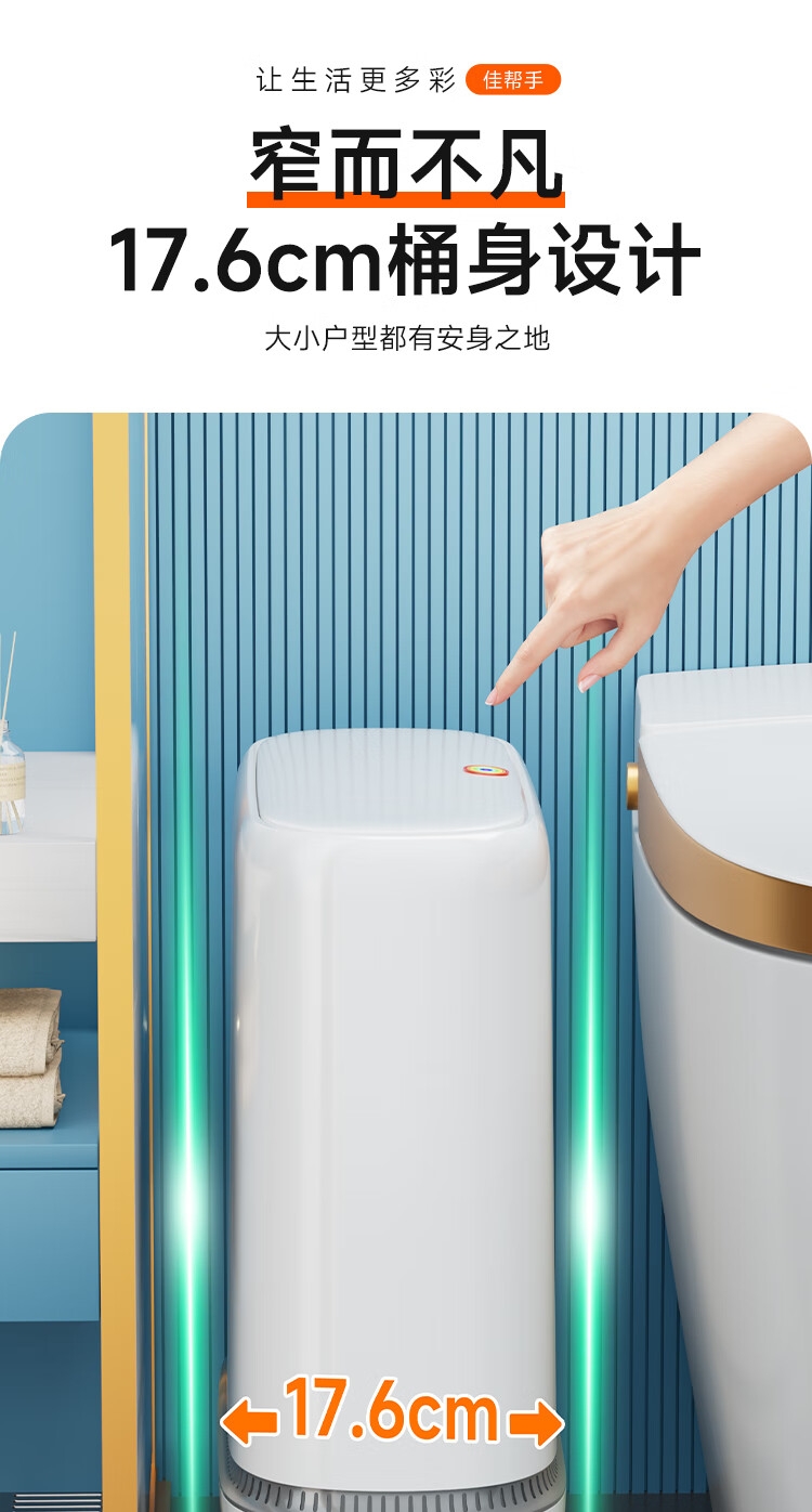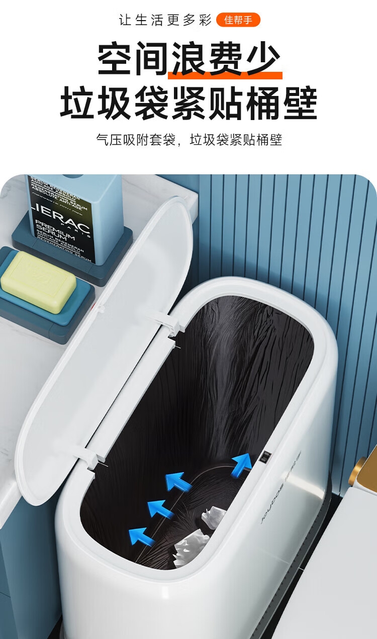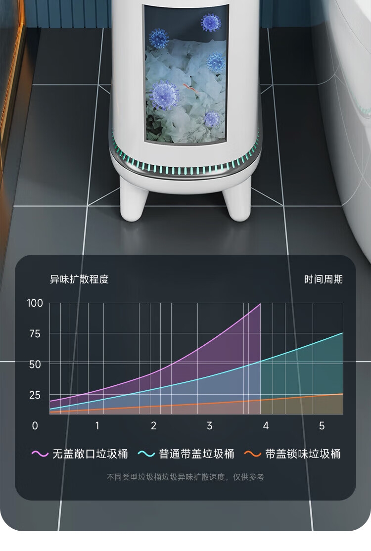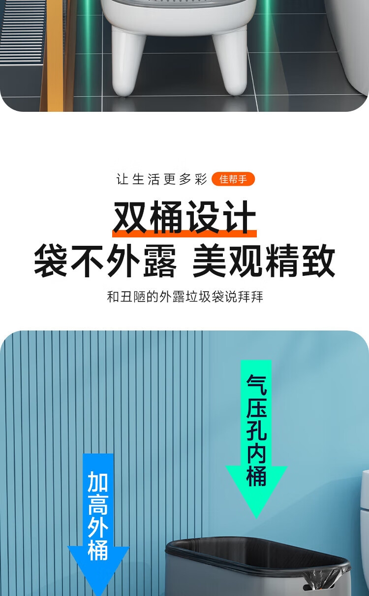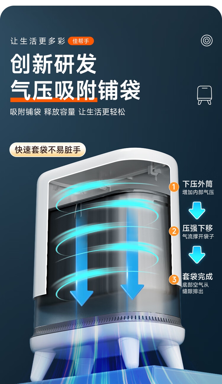 创新研发,气压吸附铺袋;创新升级,升高支腿设计;密闭桶盖,有效阻隔异味扩散、防水防蚊虫