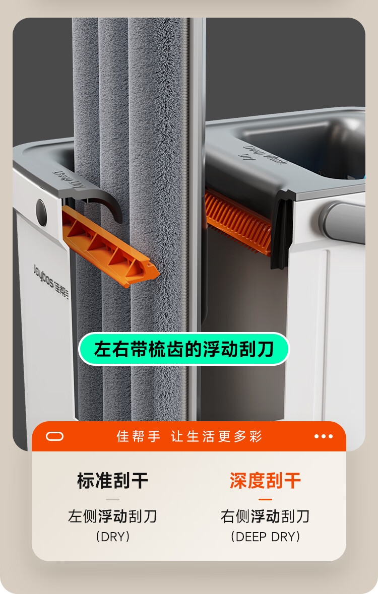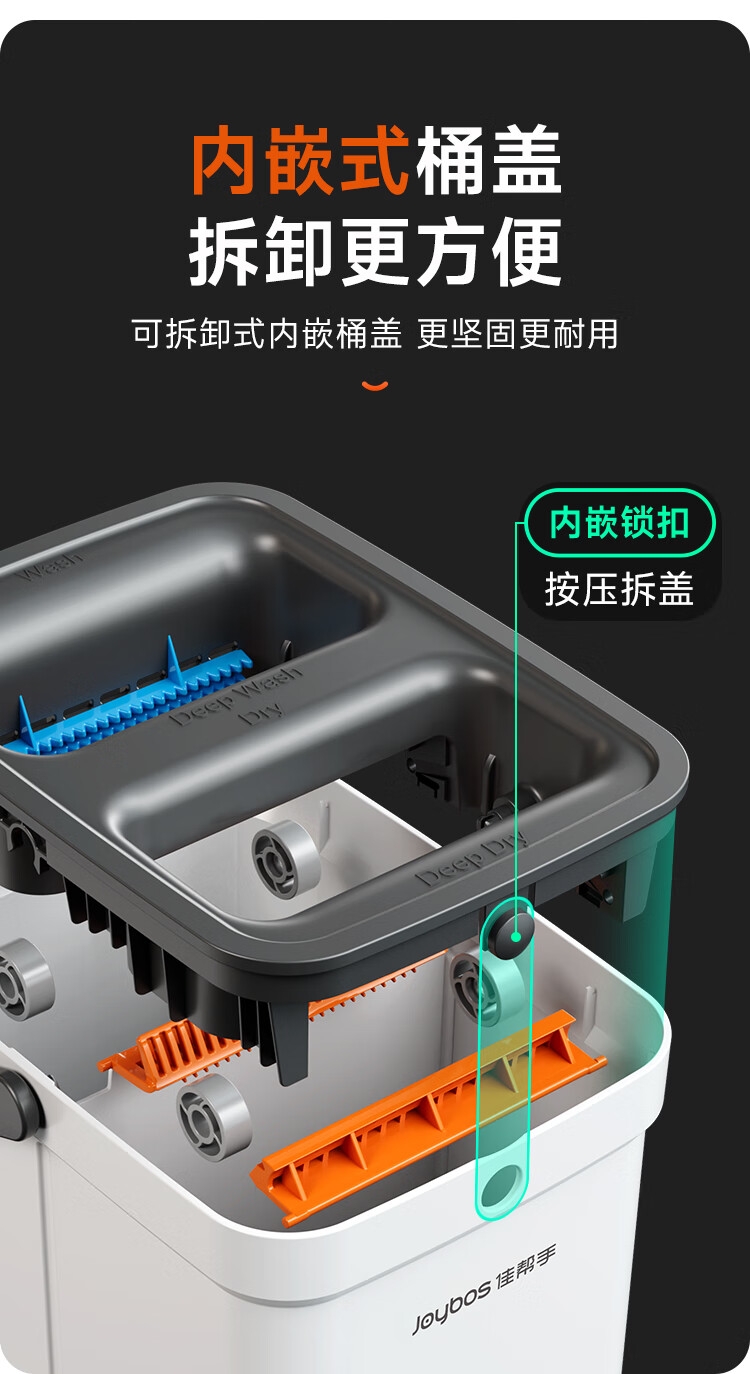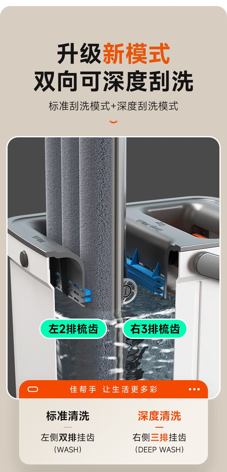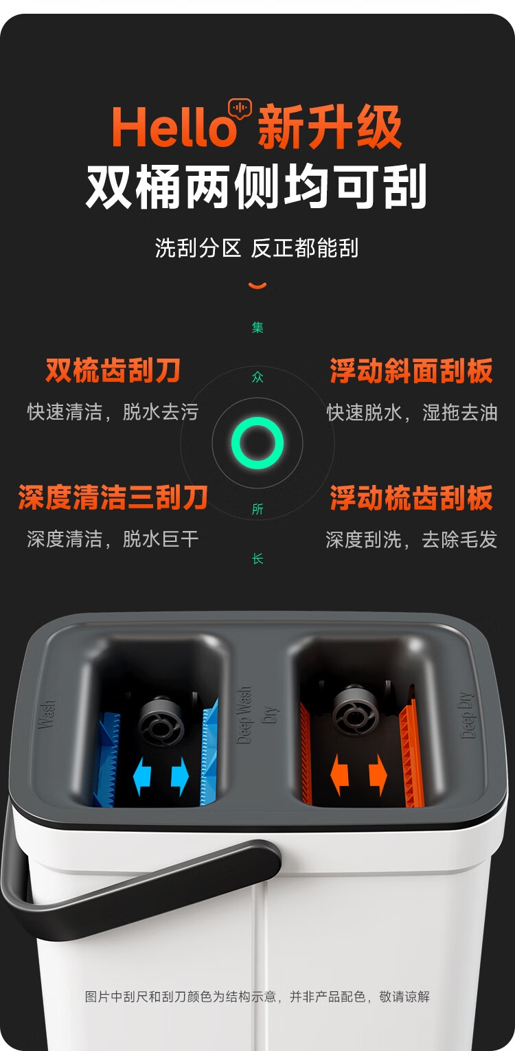 双桶两侧均可刮,洗刮分区 反正都能刮;内嵌式桶盖,拆卸更方便;升级新模式双向可深度刮洗:标准刮洗模式+深度刮洗模