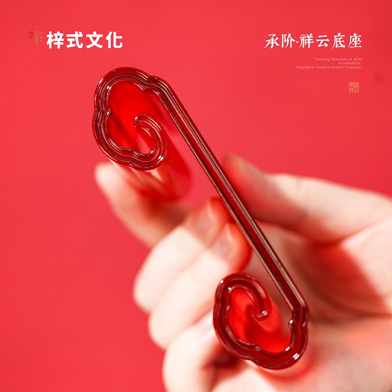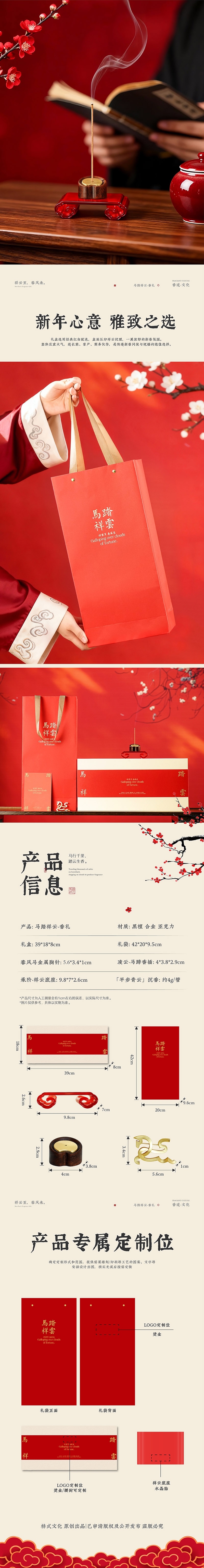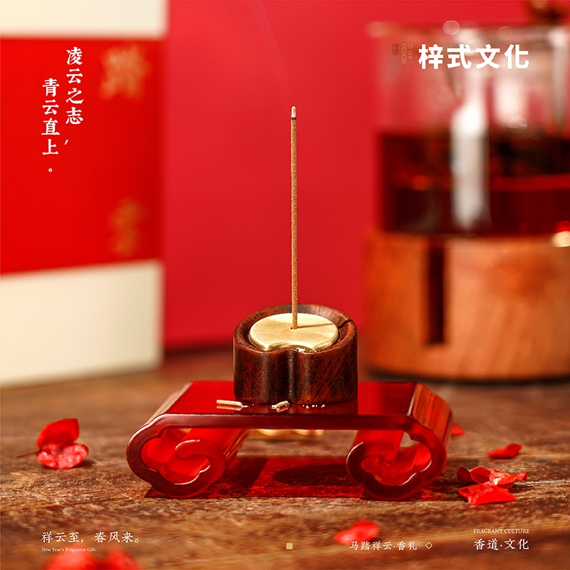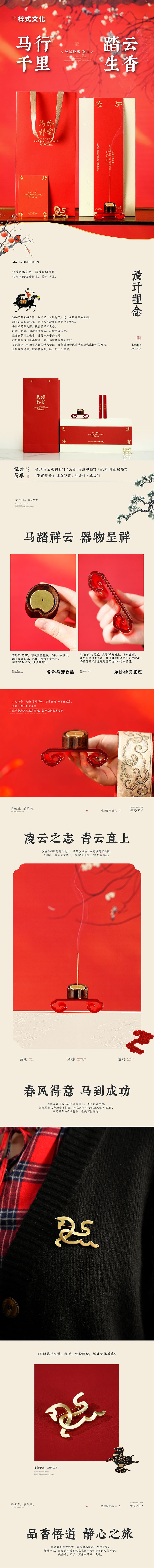 礼盒选用经典红白配色,盒面压印祥云纹理,一展浓郁的;凌云·马蹄香插取形于“马蹄”,寓意马到成功;香插内部经过精心设计,青烟袅袅而上,寓意青云直上;原创设计「春风马金属胸针」,可佩戴于衣襟、帽子等;「平步青云」沉香,是品茗、阅读、冥想时的不二之选