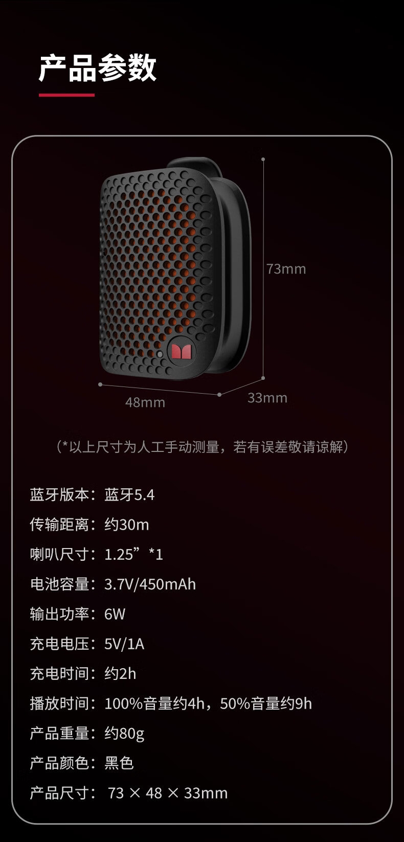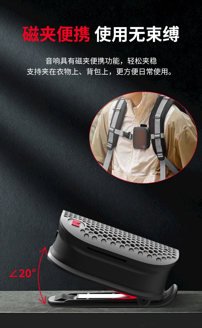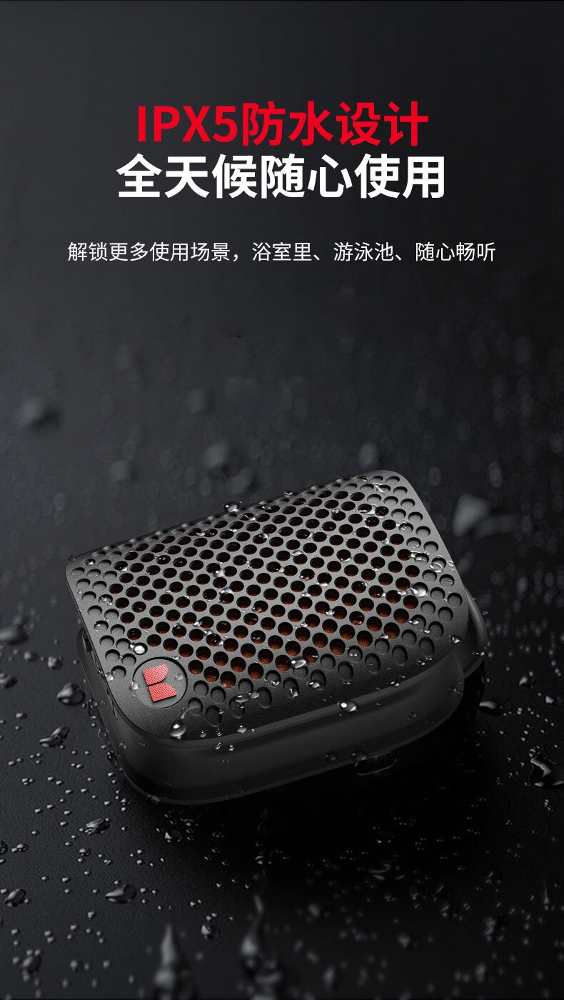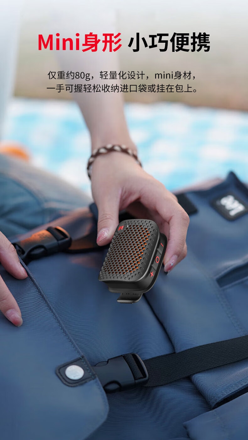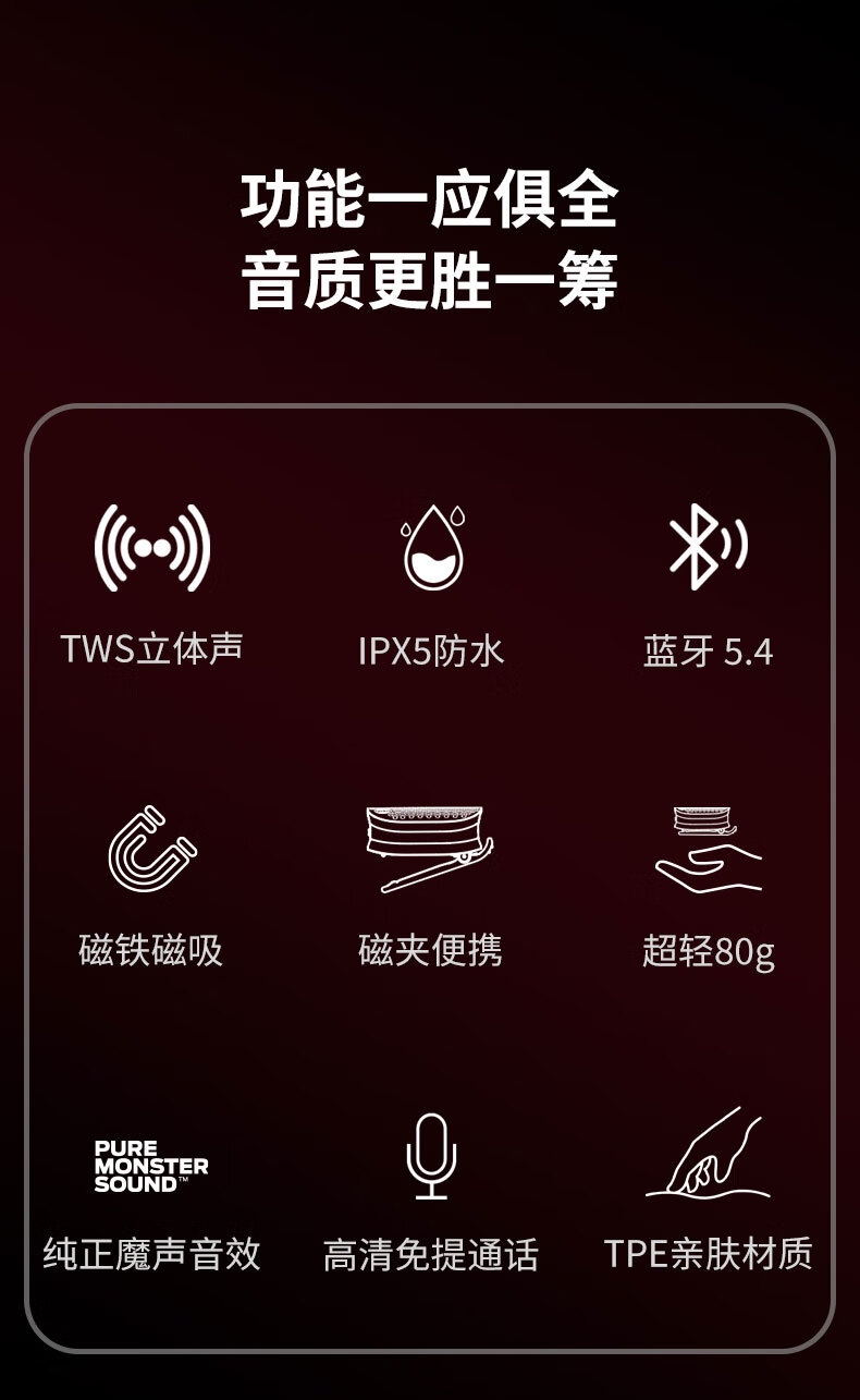 支持TWS立体声;便携磁吸&夹子及腕绳设计,更多使用场景;IPX5防水;超轻80g