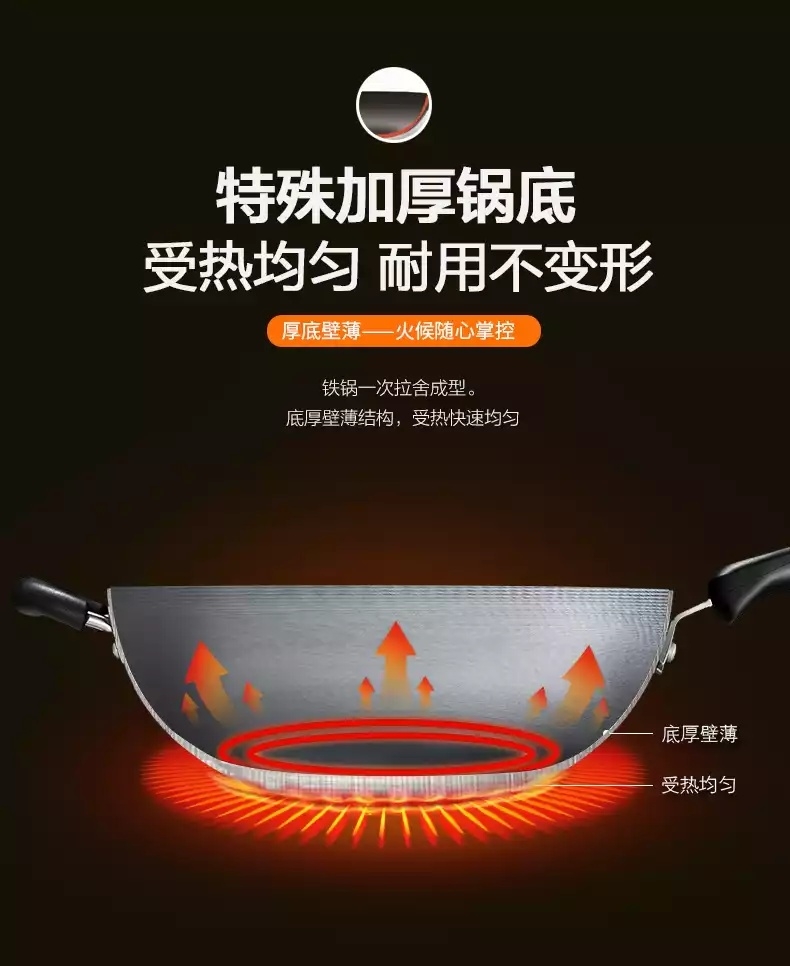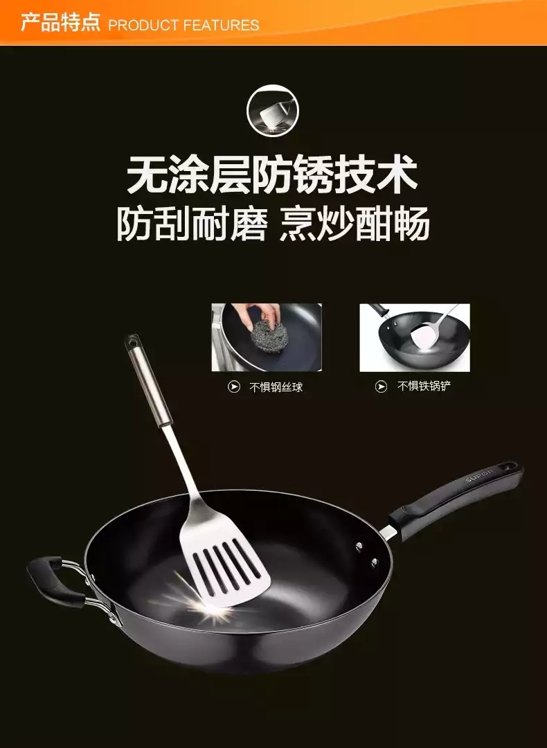 生铁铸造,耐磨防锈,无涂层;特殊加厚锅底,受热均匀,耐用不变形 ;可立锅盖,易放卫生