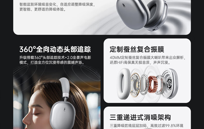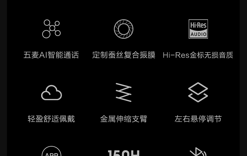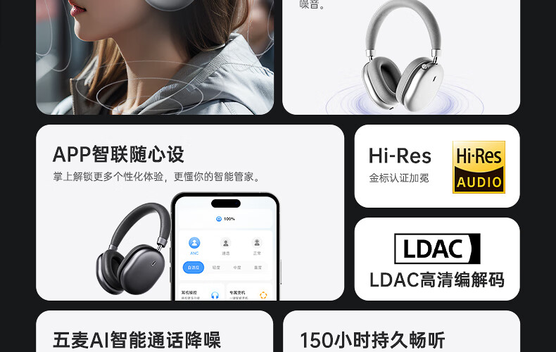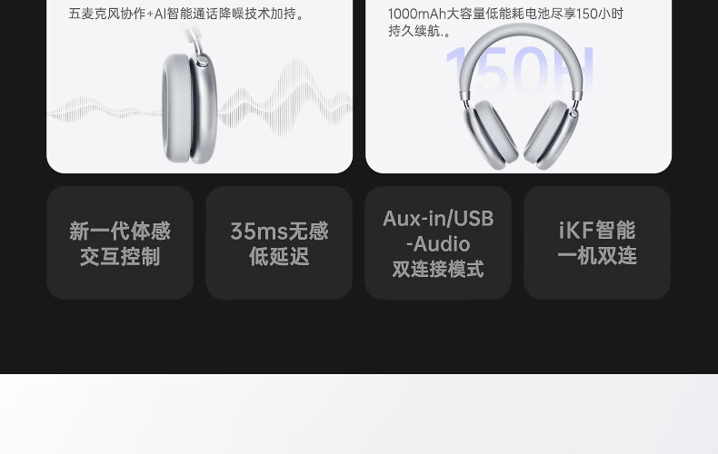 五麦AI智能降噪;150小时超强续航;APP智联随心设