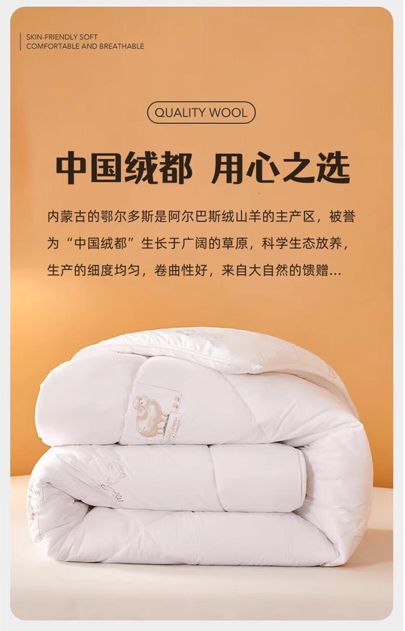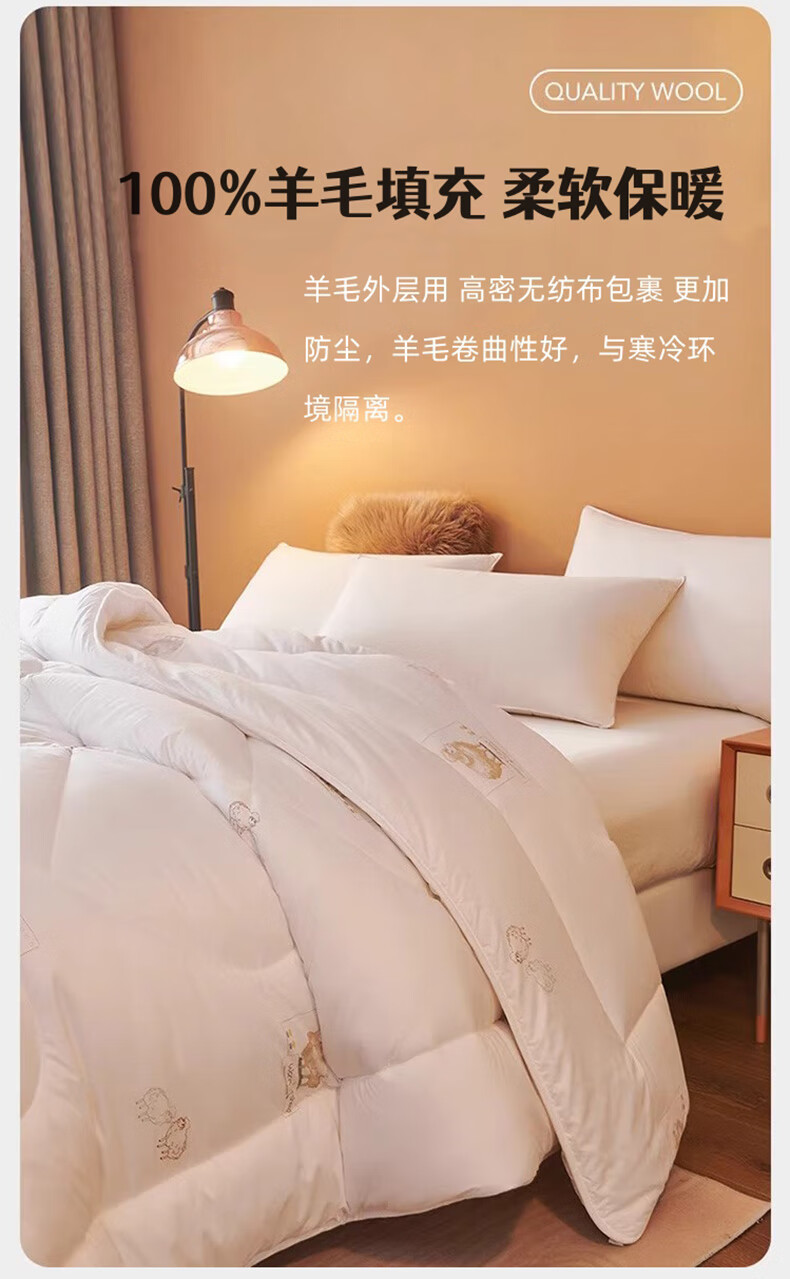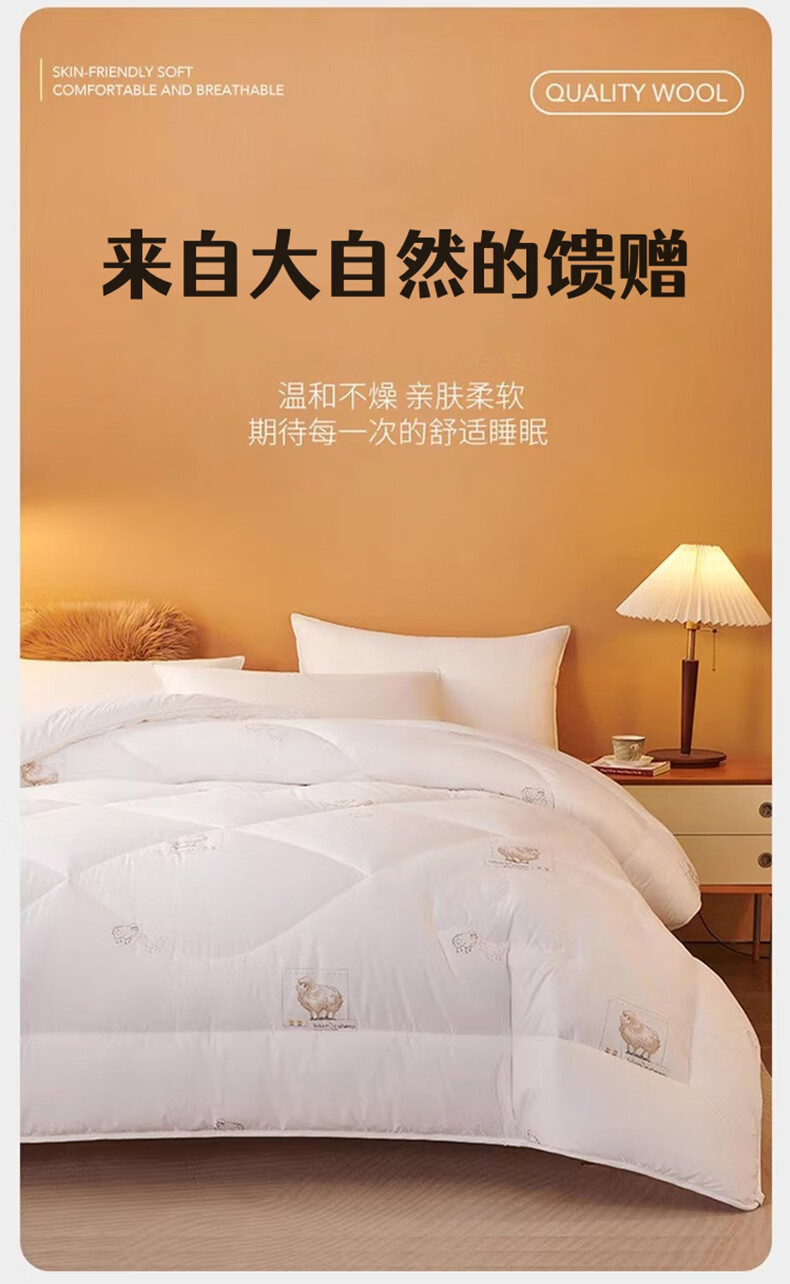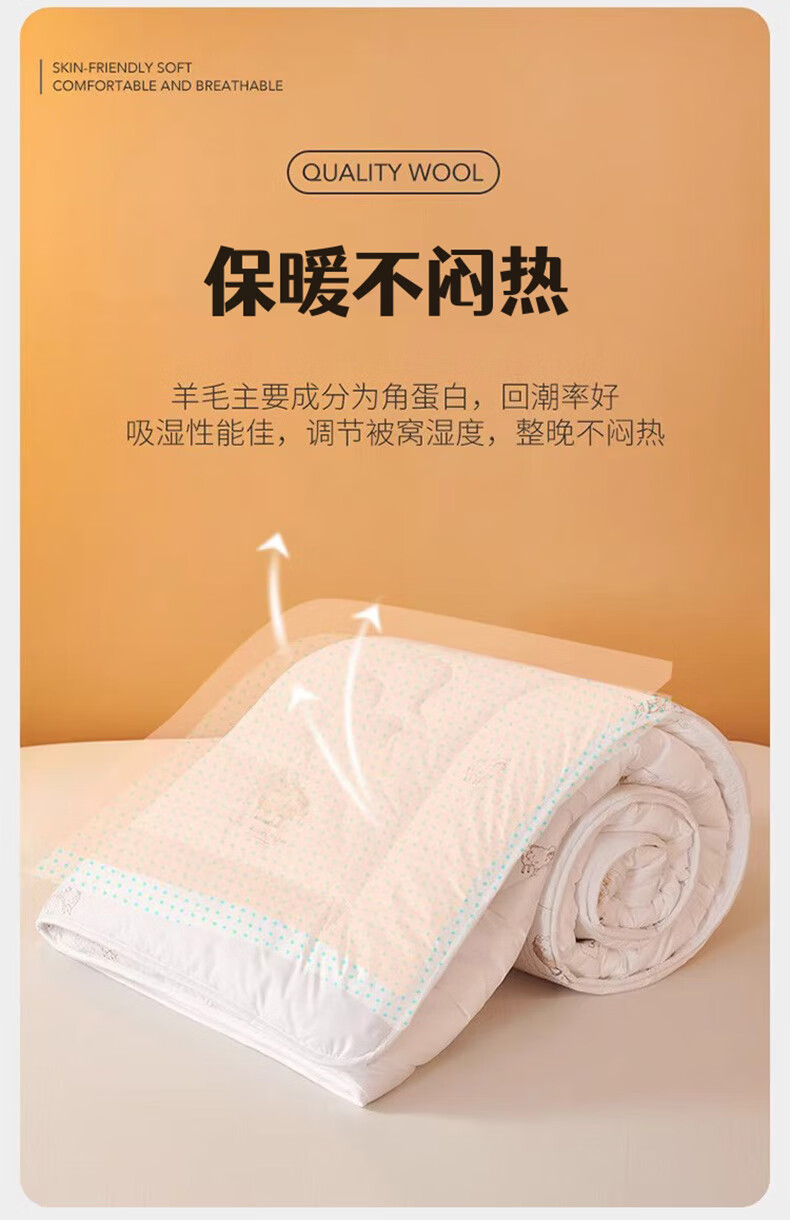 填充物100%羊毛,羊毛外层用 高密无纺布包裹 ;毛被比普通棉花被更加轻便 保暖性极强;羊毛细长直径为13-18微米,纤维长、光泽好