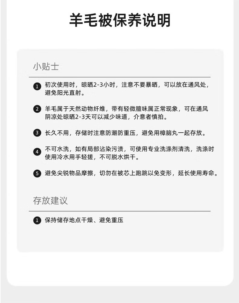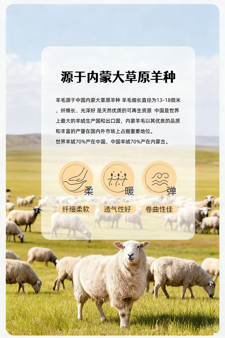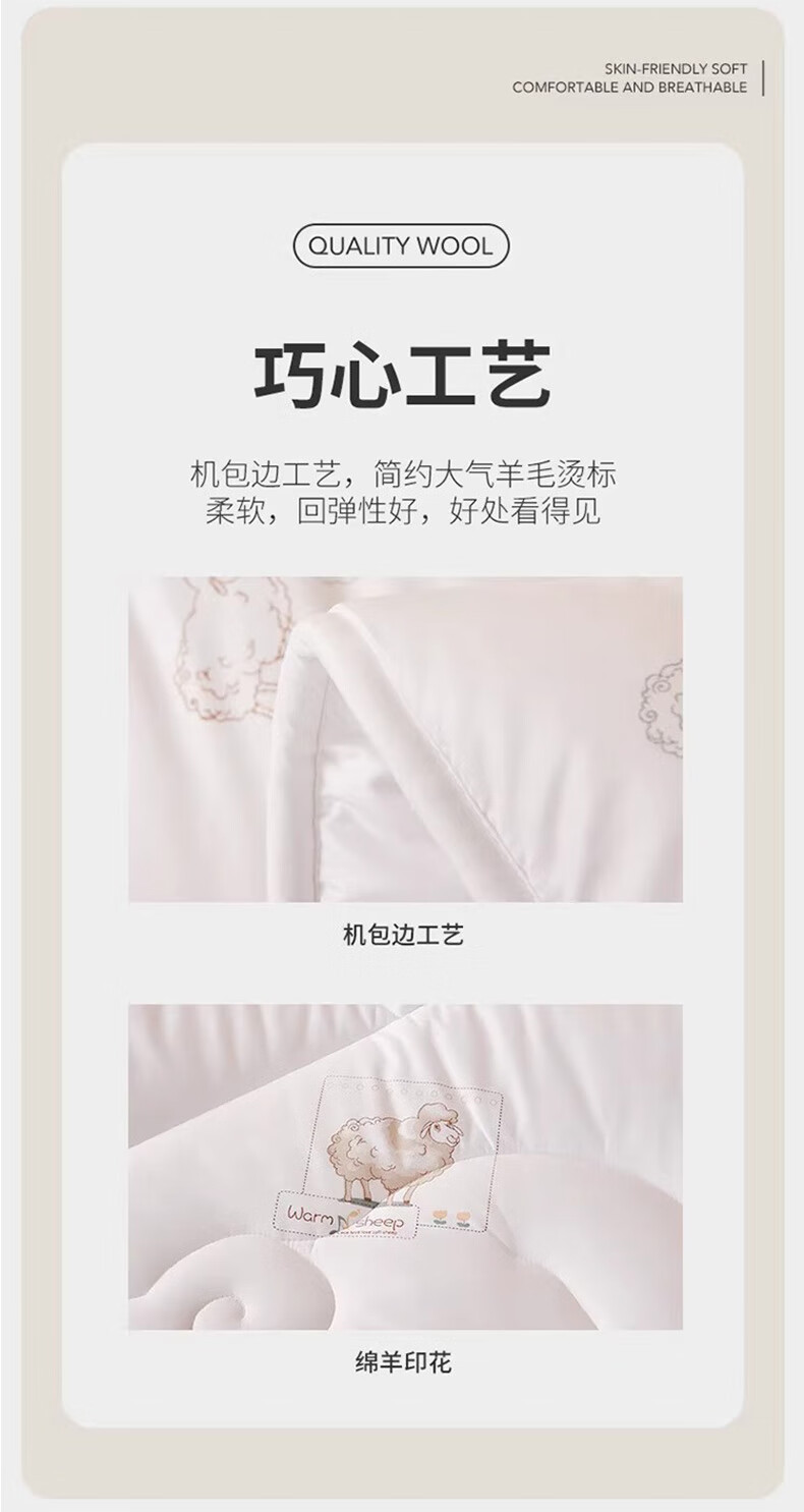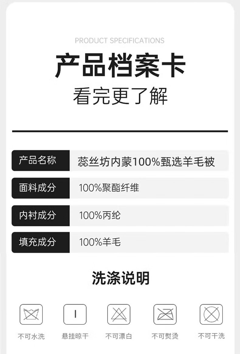 填充物100%羊毛,羊毛外层用 高密无纺布包裹 ;毛被比普通棉花被更加轻便 保暖性极强;羊毛细长直径为13-18微米,纤维长、光泽好