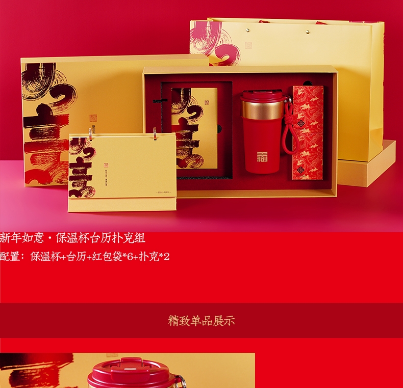 尺寸:保温杯500mL 台历210*150mm 春联1180*210mm 红包袋170*90mm
