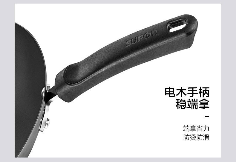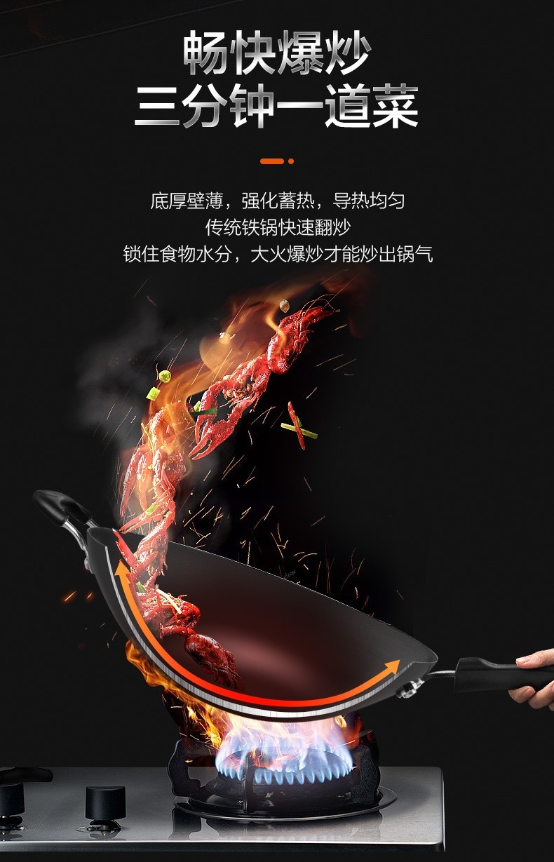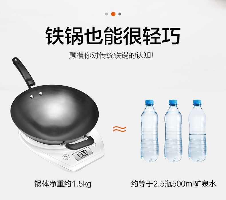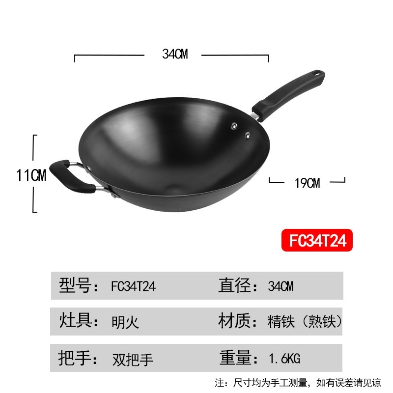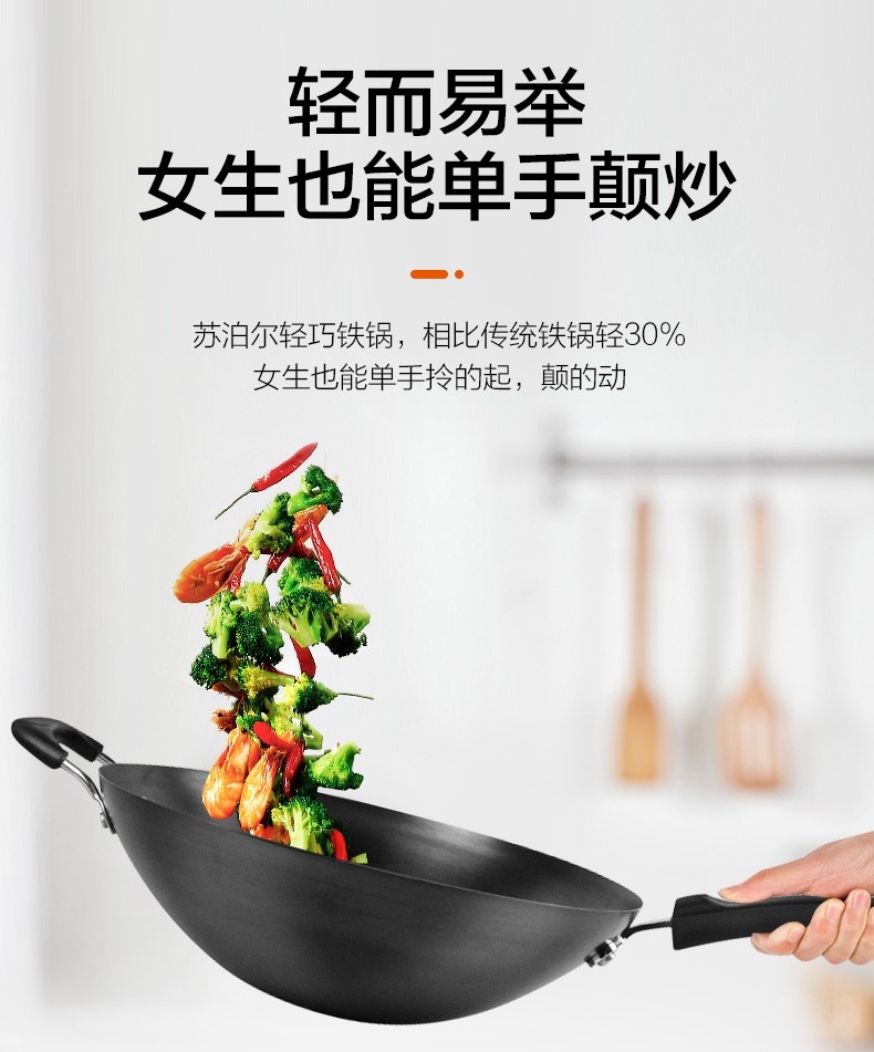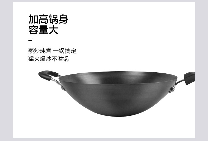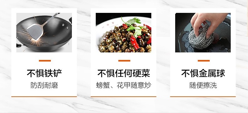 加厚尖圆底,底厚壁薄,受热均匀;健康无涂层,坚硬耐磨不怕铲 ;精铸熟铁,不易锈